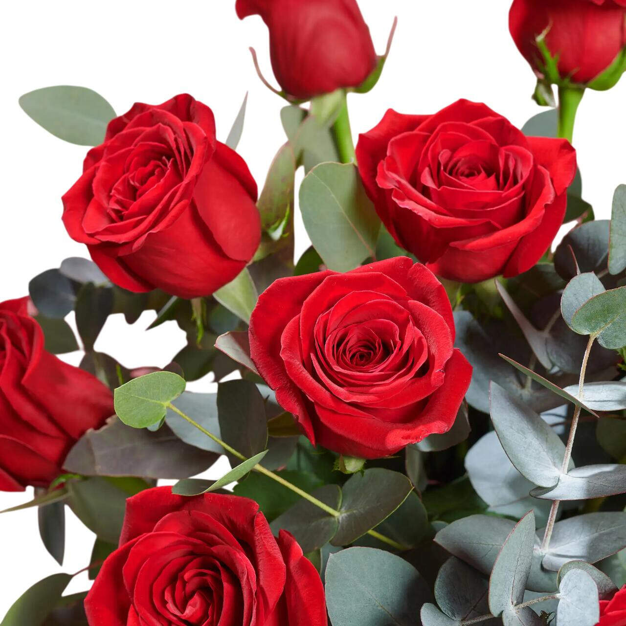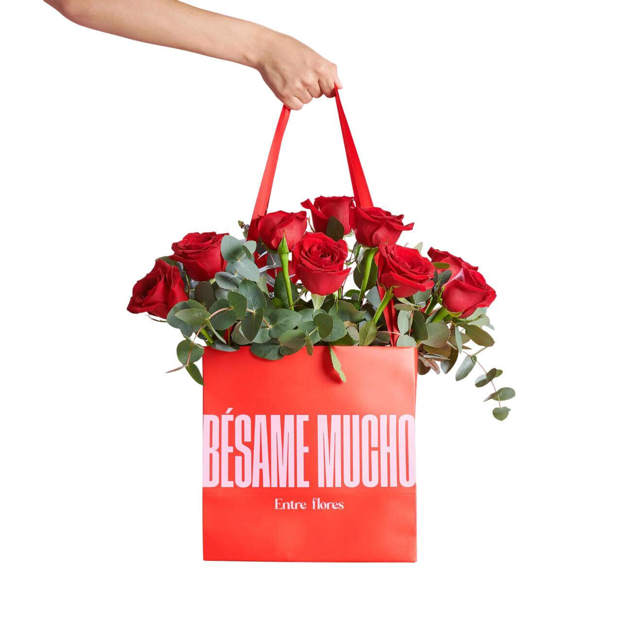 Rosas rojas y eucalipto: pasión y eternidad en nuestra icónica bolsa roja. Ahora, puedes llevar este ramo con total comodidad en nuestra bolsa roja de Bésame Mucho, diseñada para un transporte práctico y elegante.