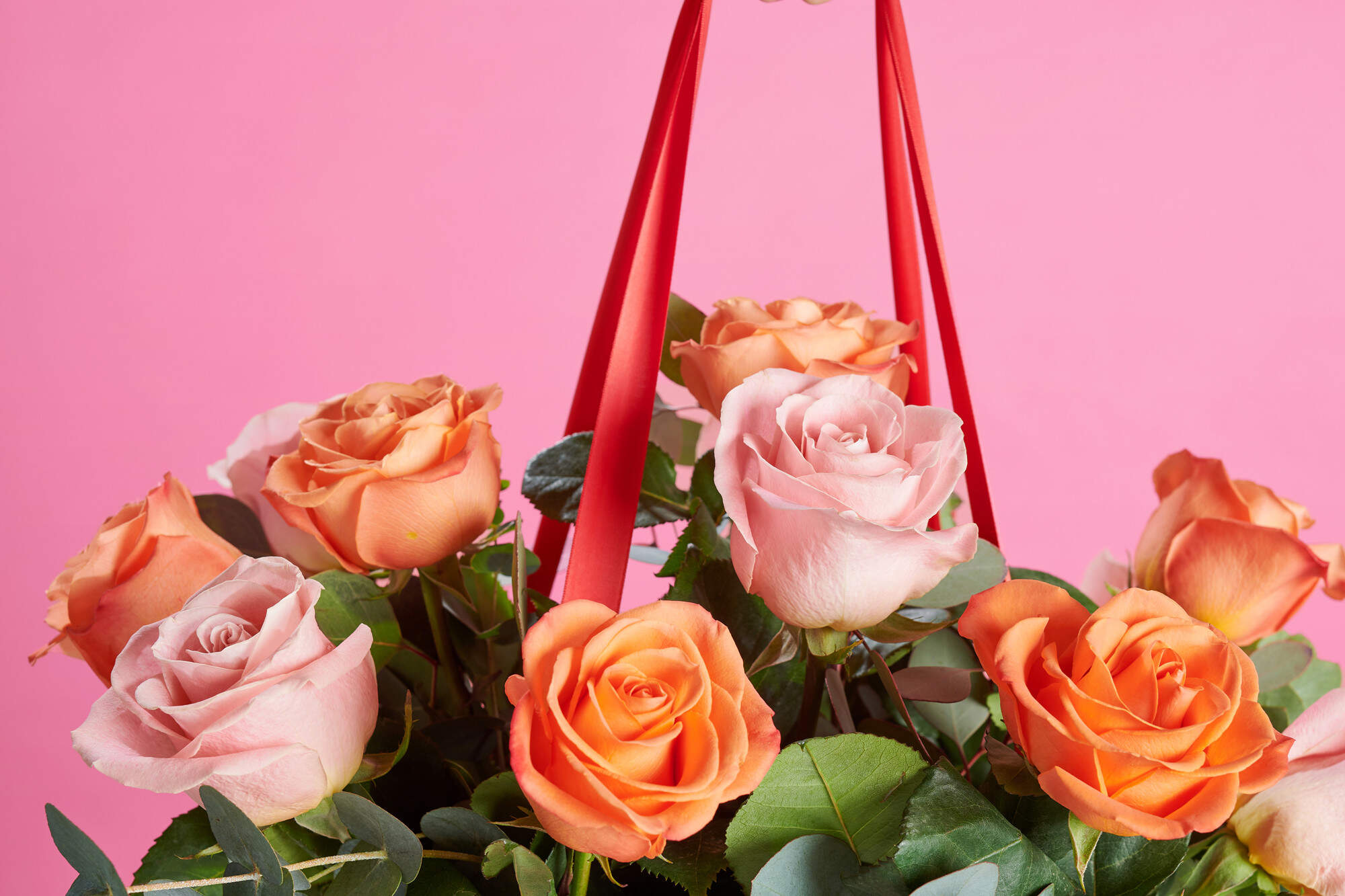 Las rosas naranja irradian alegría y optimismo, mientras que las rosas rosa claro aportan una dulzura inigualable. Juntas, crean un equilibrio visual y emocional único, acompañado por eucalipto y lentisco, que refuerzan su frescura y aroma natural. Este ramo, listo para sorprender, se presenta en nu