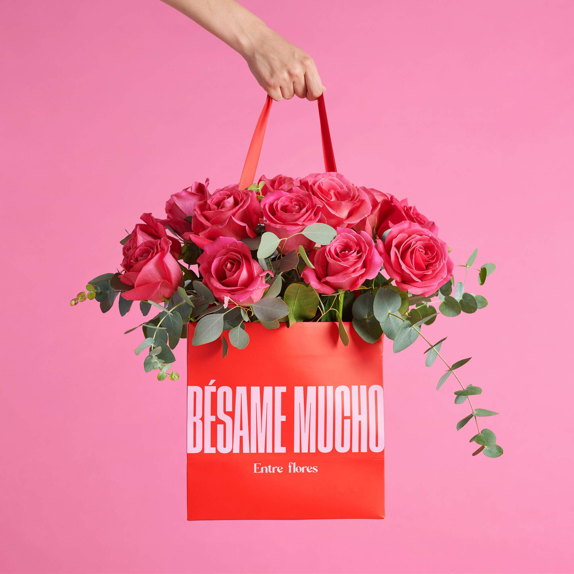 Para que puedas transportarlo fácilmente sin preocuparte por su protección, este ramo se presenta en nuestra bolsa roja exclusiva de Bésame Mucho, diseñada para mantener la frescura y resaltar su elegancia en cada entrega.