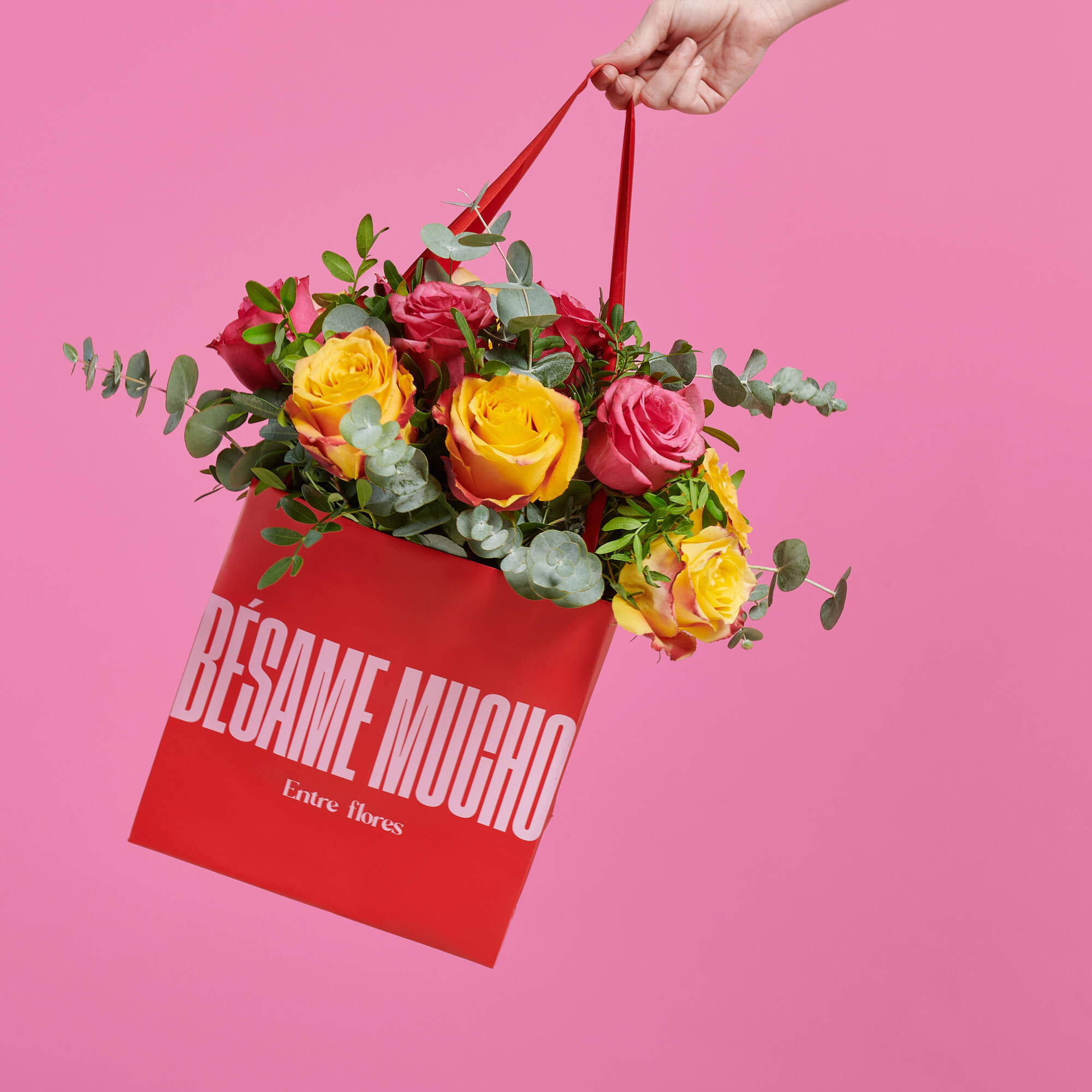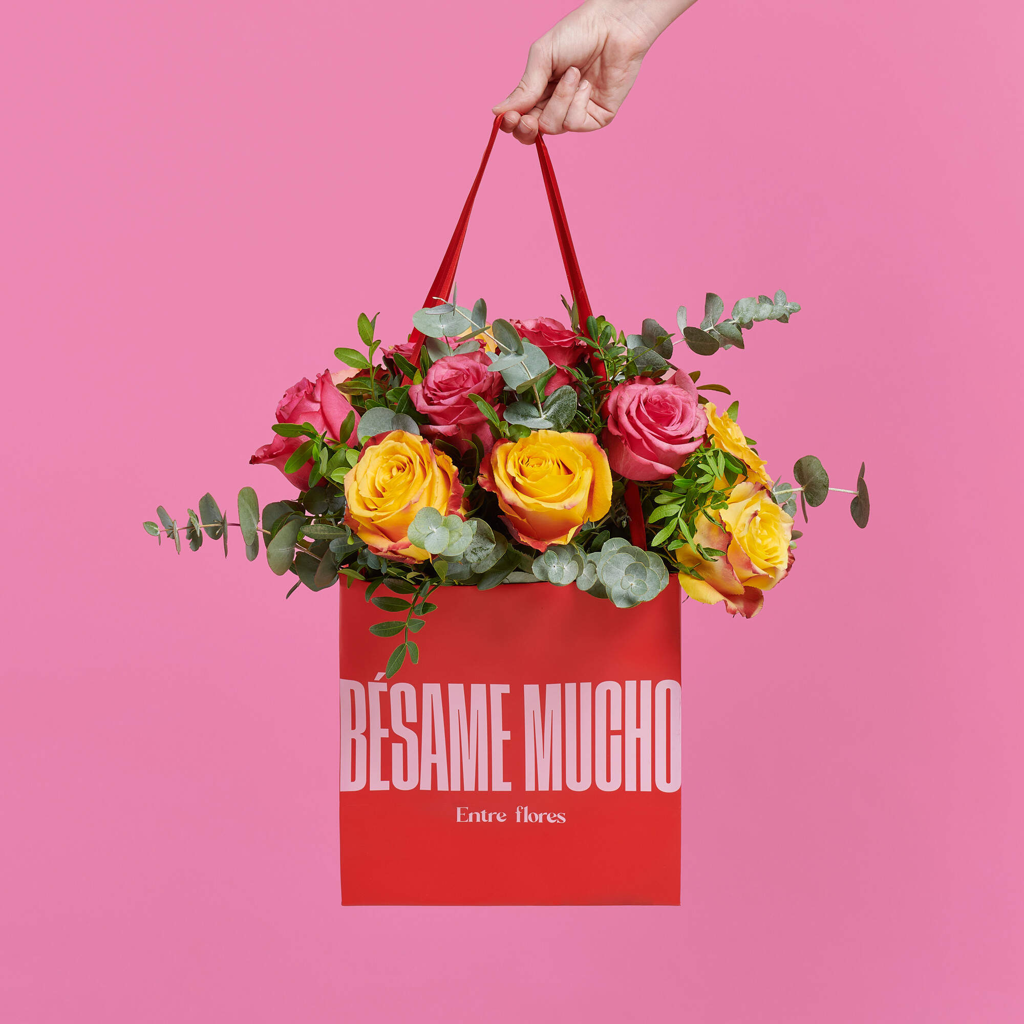 Para asegurar que su transporte sea práctico y sin complicaciones, presentamos este ramo en nuestra icónica bolsa roja de Bésame Mucho, diseñada para proteger las flores y mantener su frescura hasta su destino final.