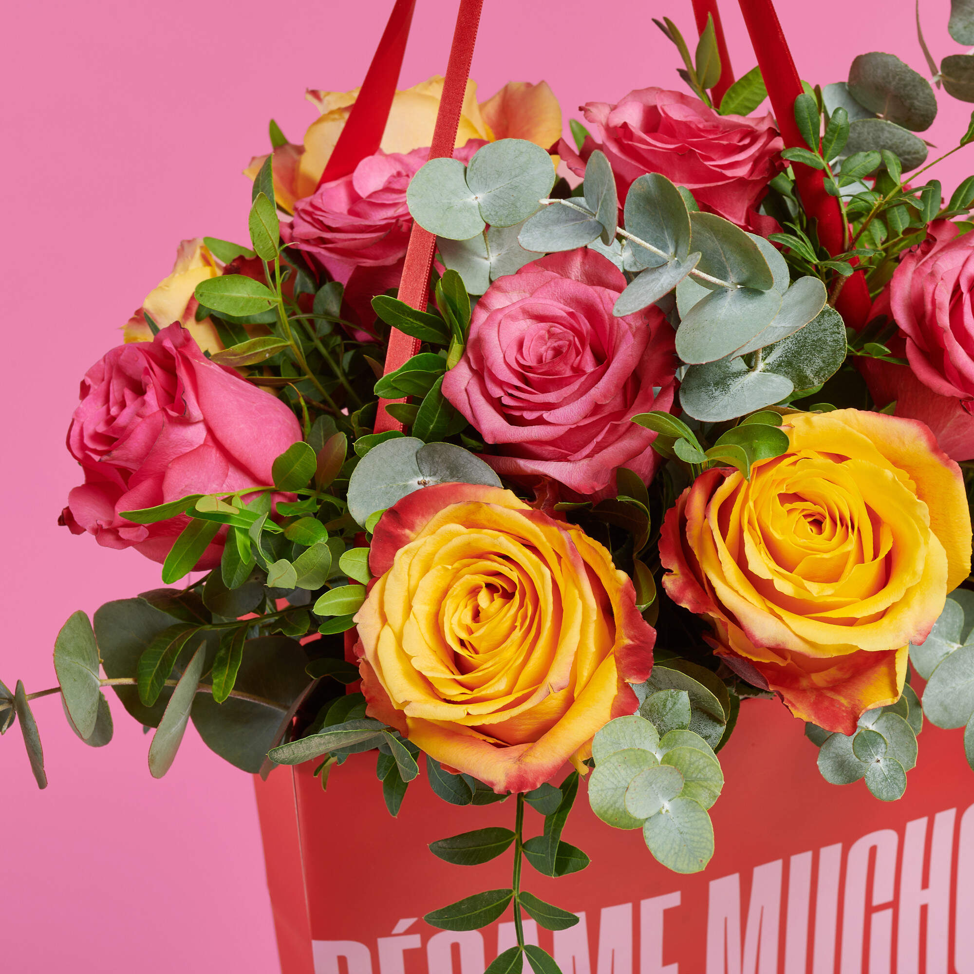 Nuestro ramo Beso Palpitante combina la belleza de las rosas naranjas y fucsias con la frescura del eucalipto y el lentisco de cultivos sostenibles, logrando una composición única y llena de vida. Su presentación en nuestra icónica bolsa roja garantiza que cada flor llegue en perfectas condiciones, realzando su belleza y facilitando su transporte.