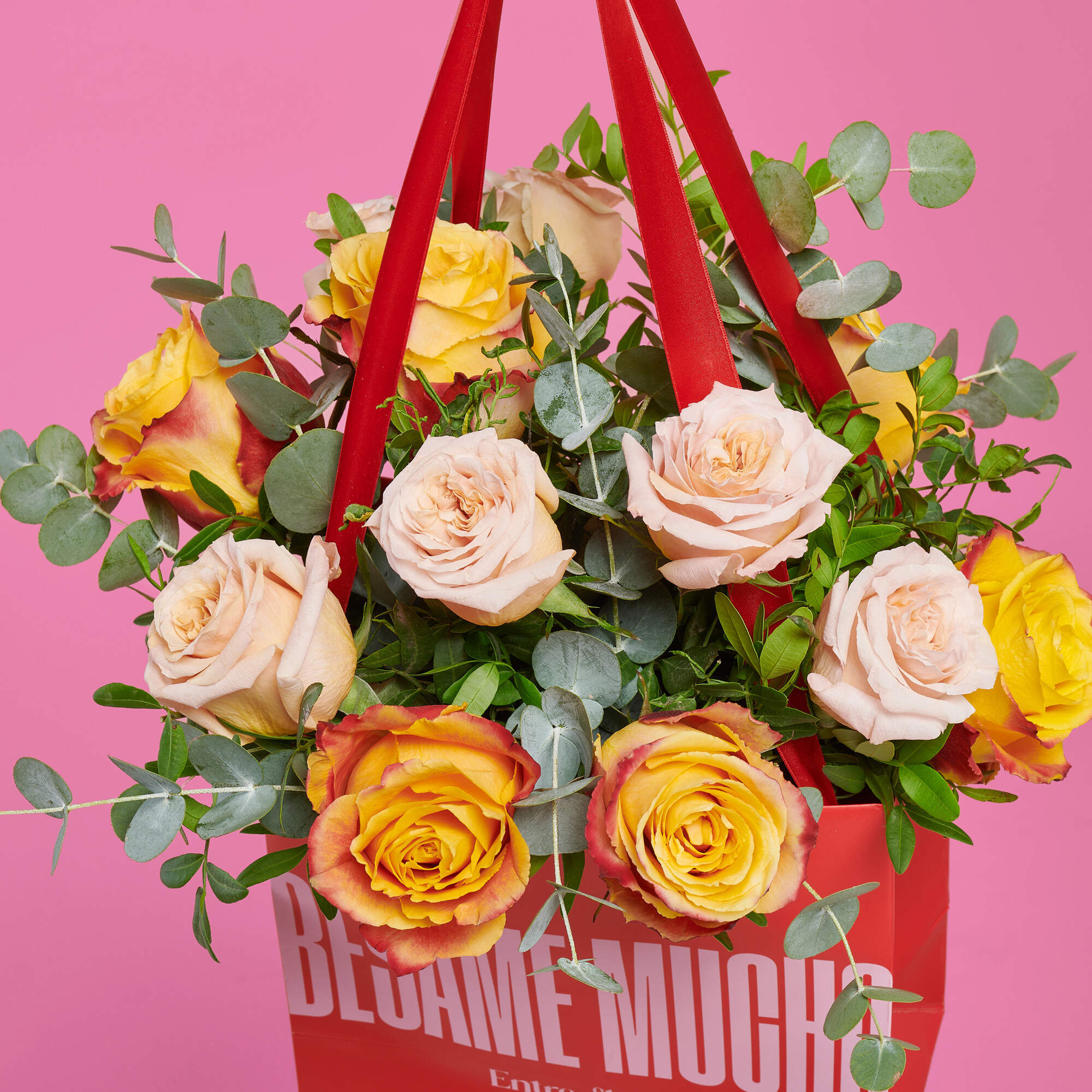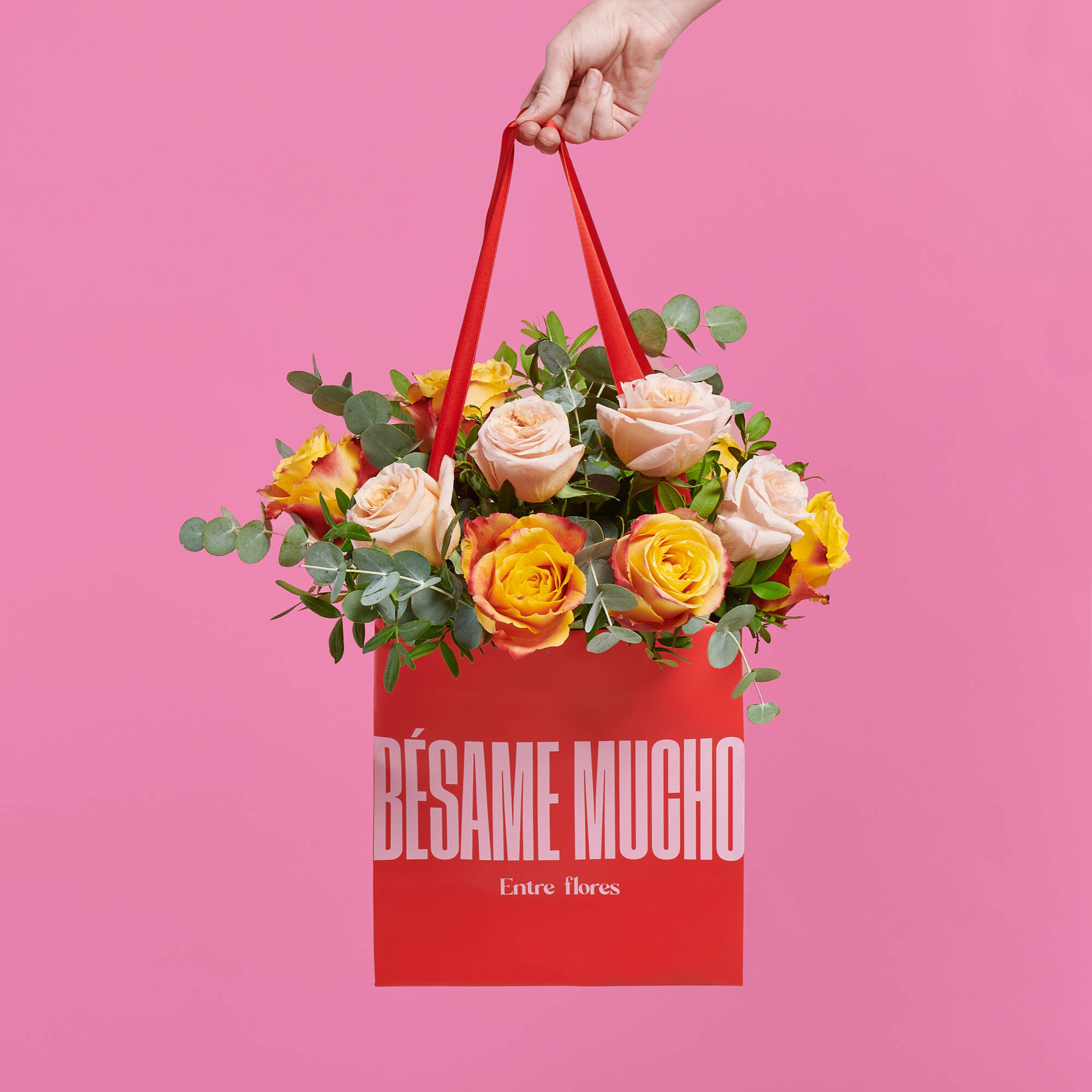 - Bolsa roja exclusiva de Bésame Mucho, ideal para transportar el ramo con seguridad y elegancia.