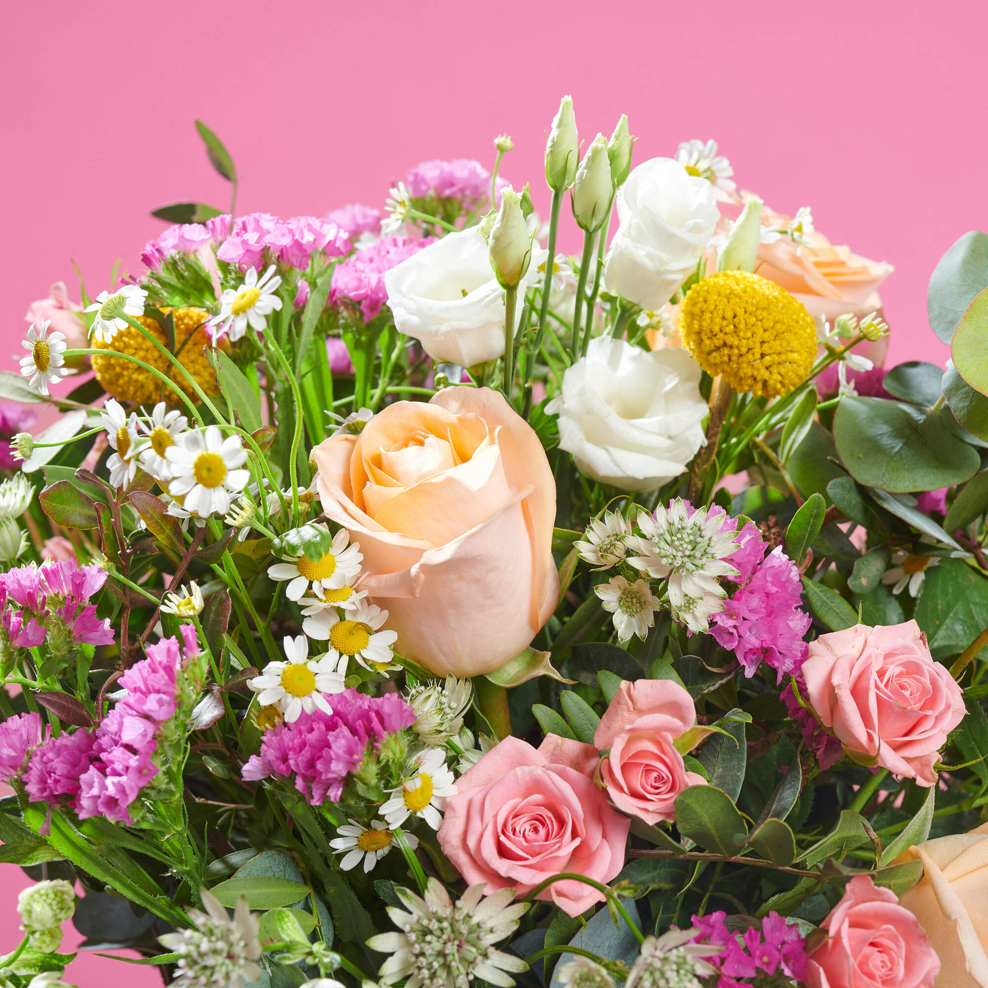 El ramo Mi Metáfora es la combinación perfecta entre la elegancia de las rosas champán, la sutileza de las mini rosas rosa y el toque silvestre de las craspedias amarillas, Lisianthus blancos y Astrantia. Junto con los estatices y Tanacetum, este ramo evoca una conexión auténtica con la naturaleza. Acompañado de verdes frescos de cultivos sostenibles, su belleza atemporal lo convierte en un regalo especial para cualquier ocasión.