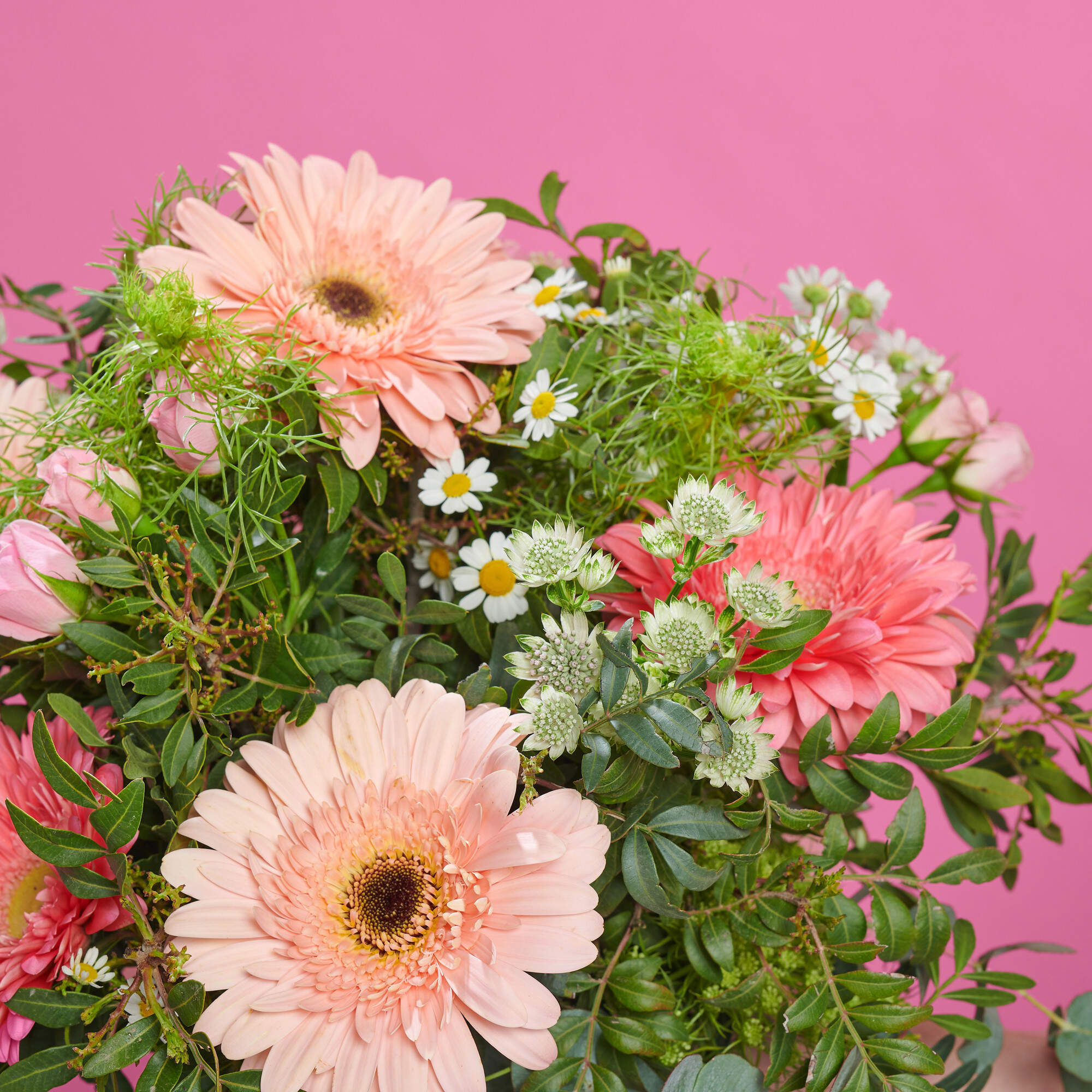 Dos tonalidades de gerberas rosas se unen en este ramo, creando una composición dulce y armoniosa que ha acompañado a Bésame Mucho desde sus inicios. La combinación de flores delicadas con pequeños detalles silvestres hacen de este ramo un éxito asegurado.
