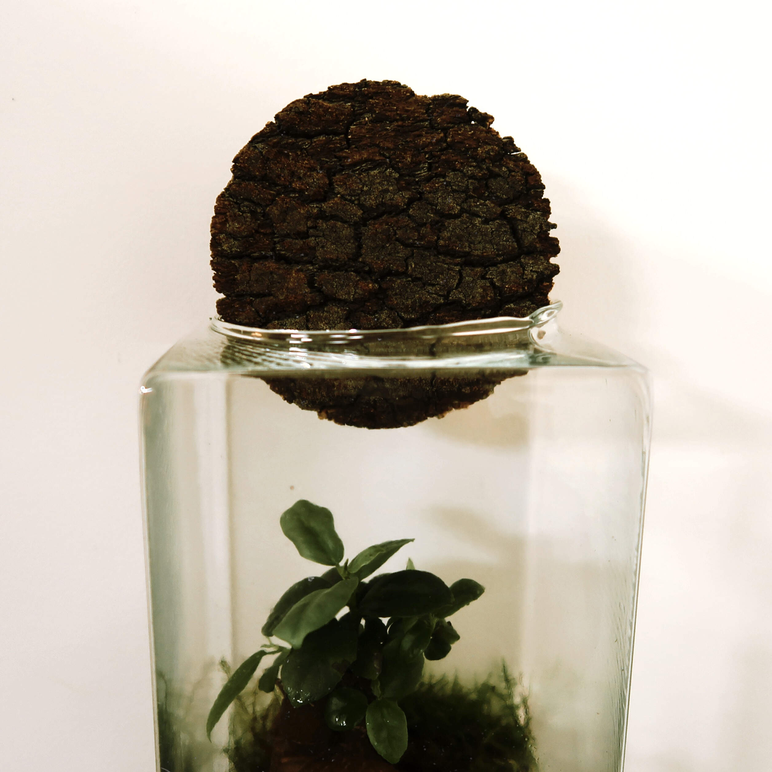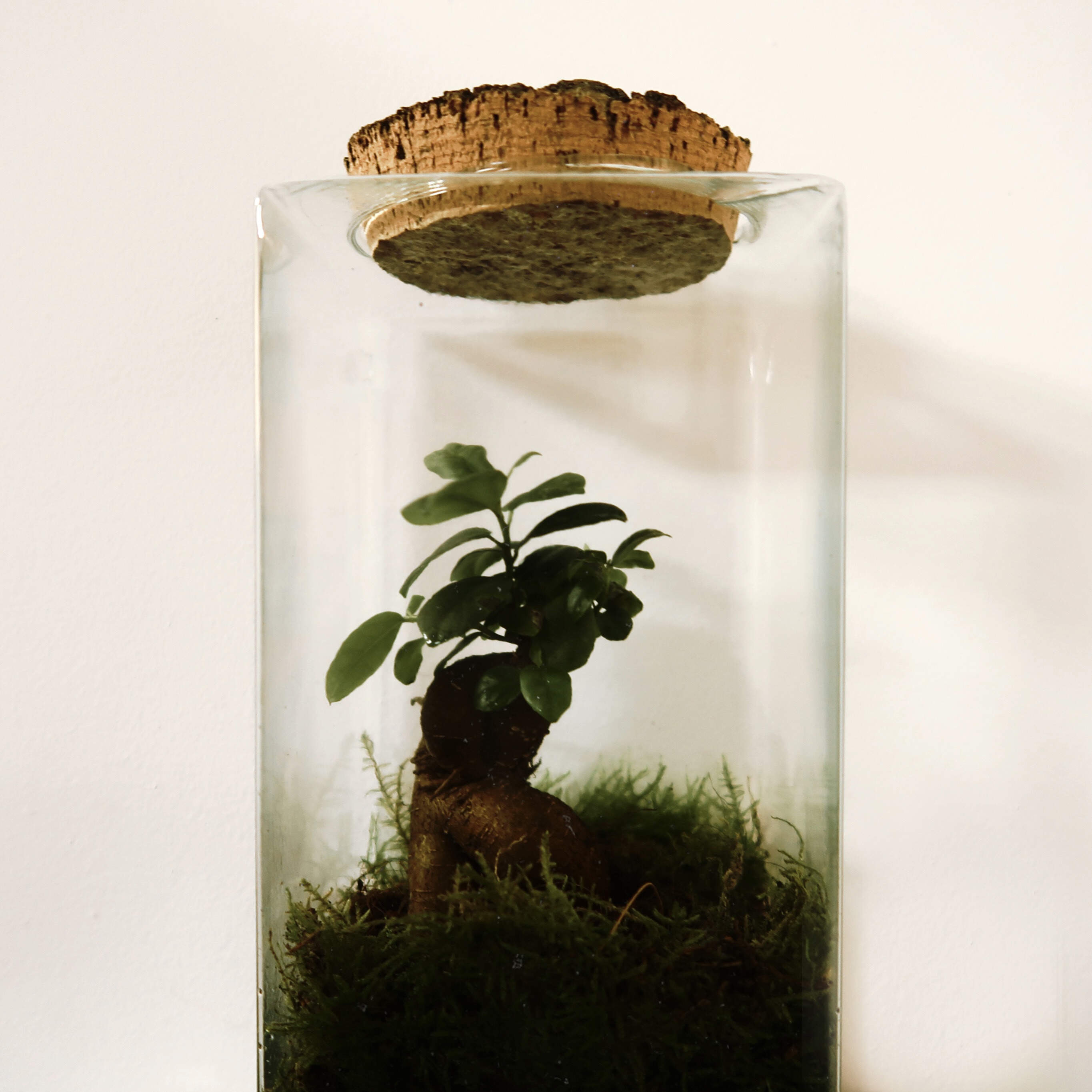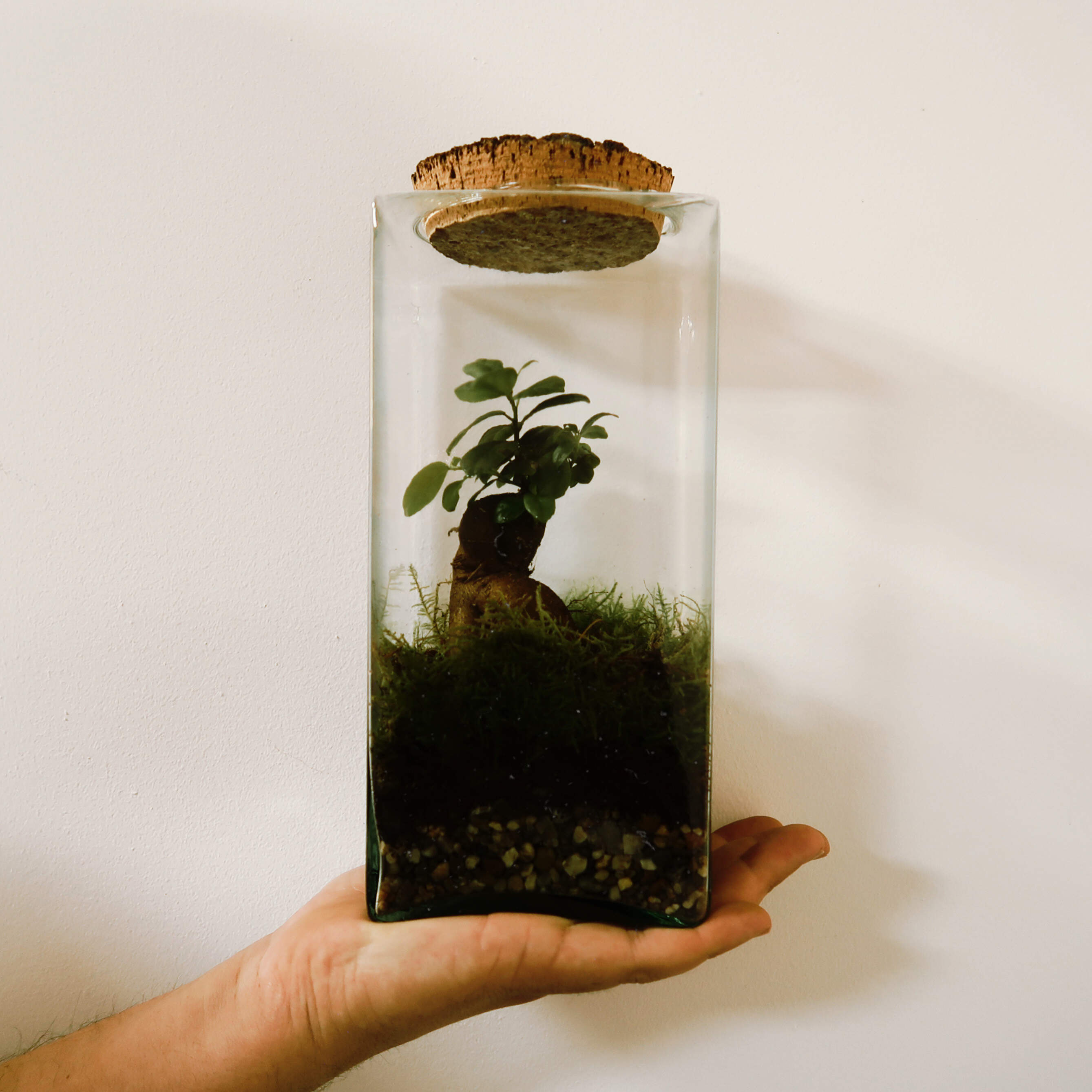 - Botella de cristal cuadrada con tapa de corcho, que mantiene la humedad y permite que las plantas se desarrollen sin intervención.