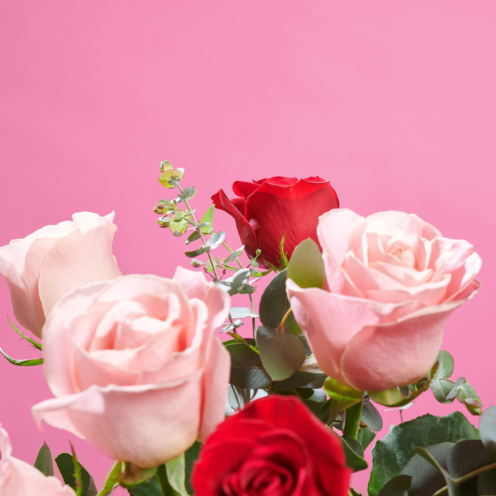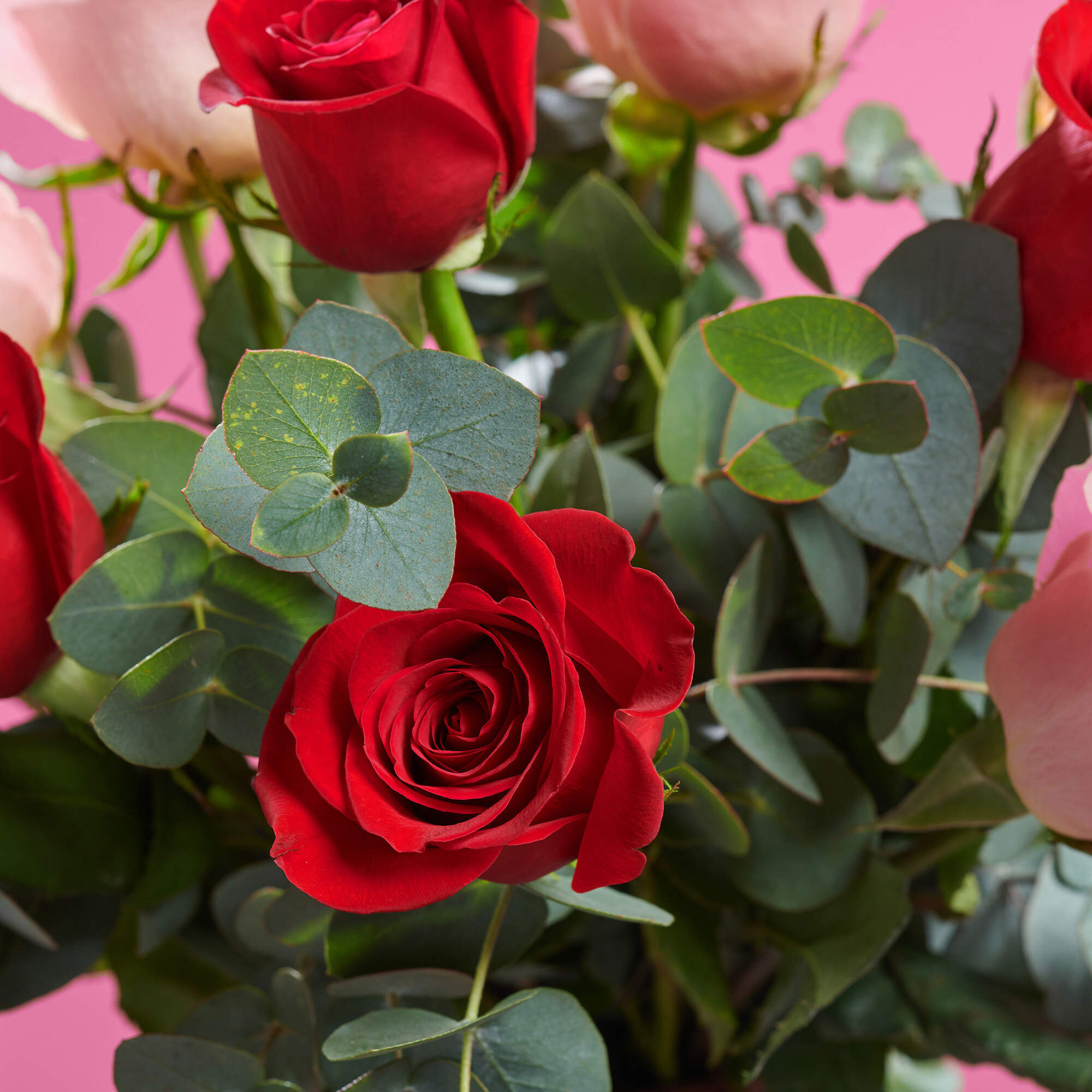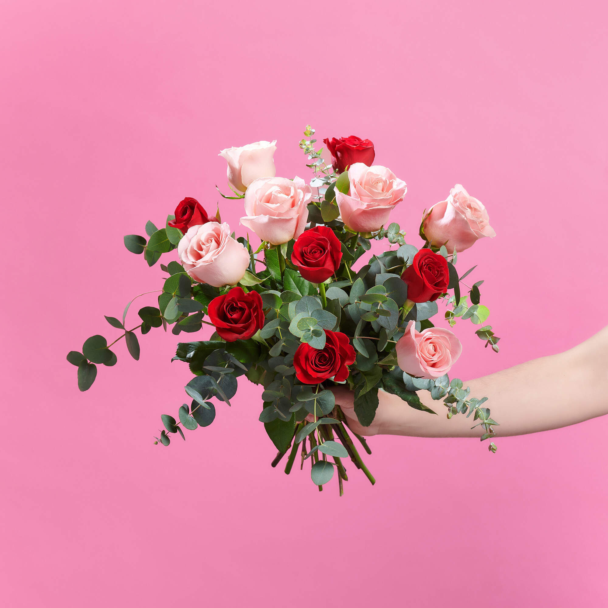 Nuestro ramo de flores Beso Infinito esta compuesto por 12 de nuestras mejores rosas de color rojo y rosa combinados con nuestros mejores eucaliptos y lentiscos de cultivos locales y sostenibles dan lugar a un ramo de flores fresco y original.