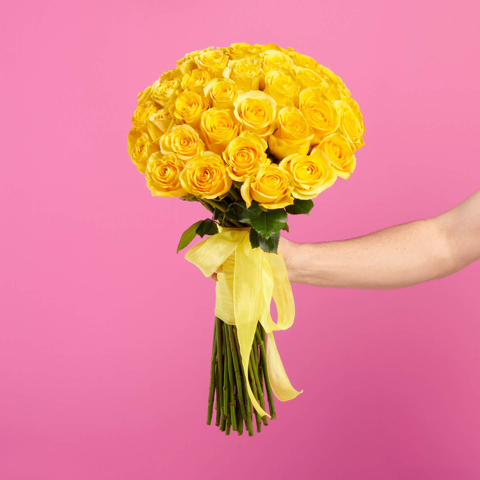 Ramo de rosas Amarillas creado a partir de las mejores rosas del mercado, este ramo que contiene 40 rosas amarillas de tallo largo, se prepara en forma de bola y con la empuñadura de lazo amarillo.