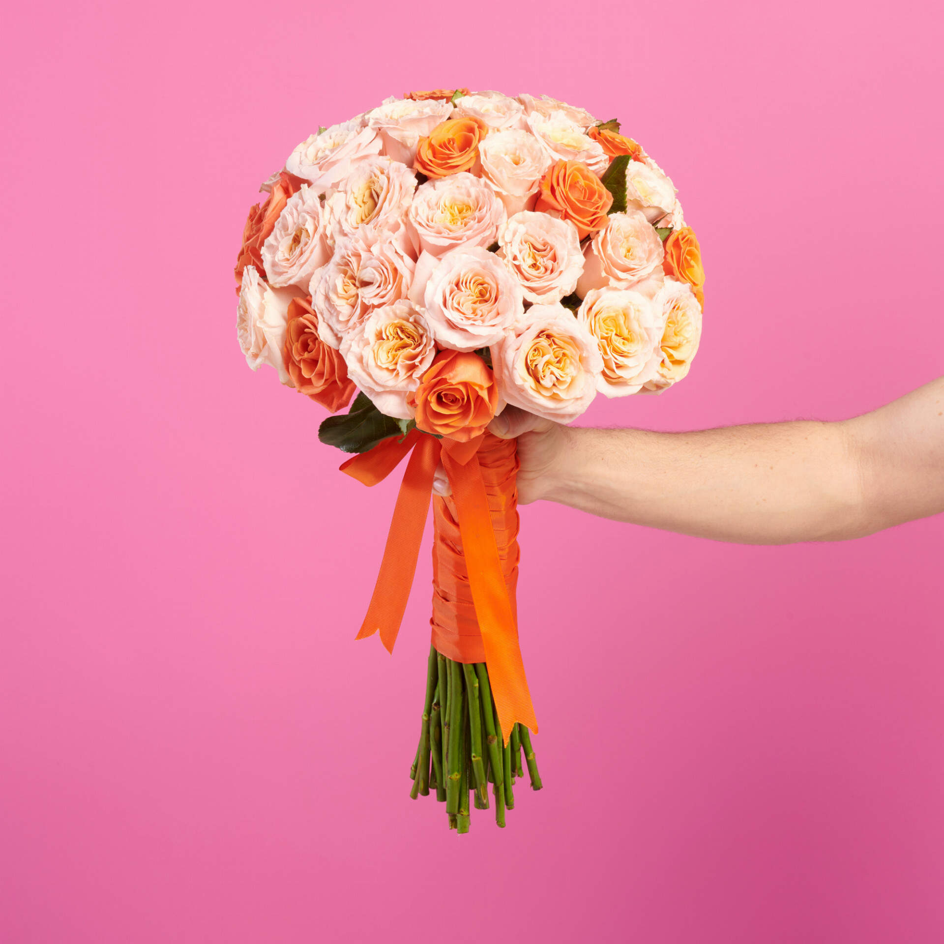 Ramo de rosas melocotón y naranja creado a partir de las mejores rosas del mercado, este ramo que contiene 40 rosas rosas y naranjas de tallo largo, se prepara en forma de bola y con la empuñadura de lazo naranja.