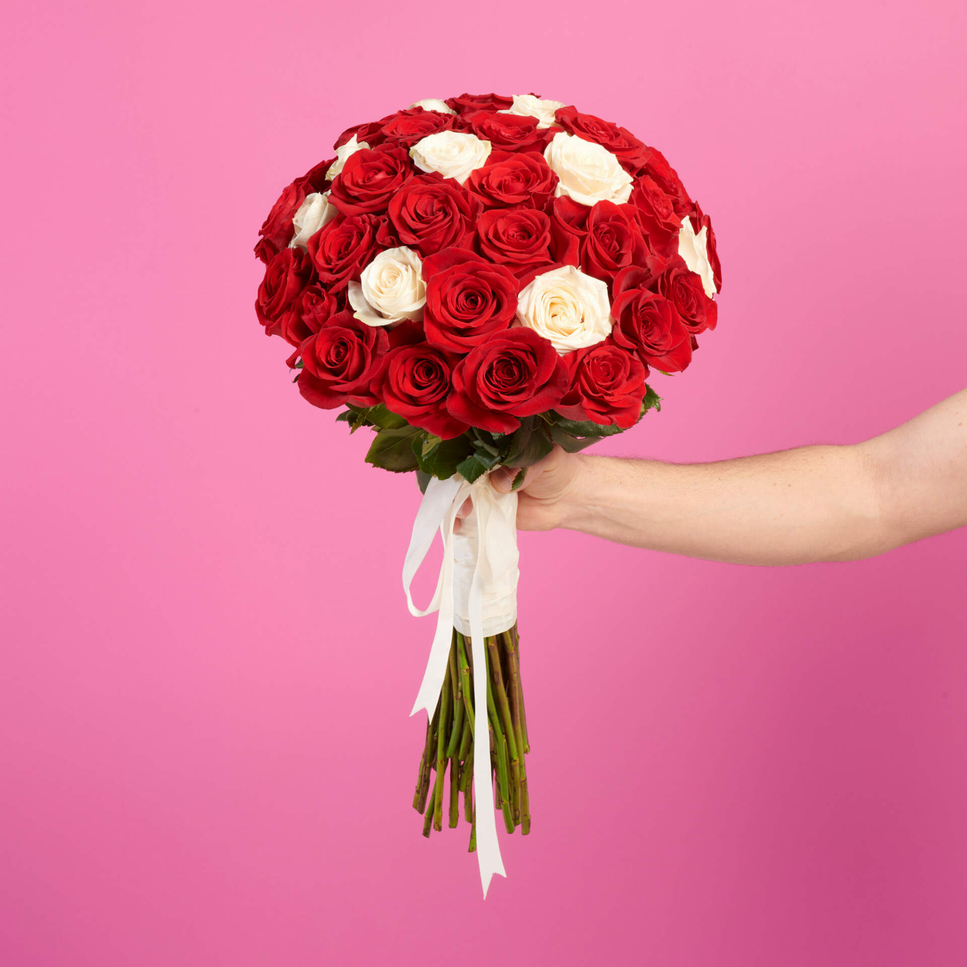 Ramo de rosas Rojas y Blancas creado a partir de las mejores rosas del mercado, este ramo que contiene 40 rosas rojas y blancas de tallo largo, se prepara en forma de bola y con la empuñadura de lazo blanco.
