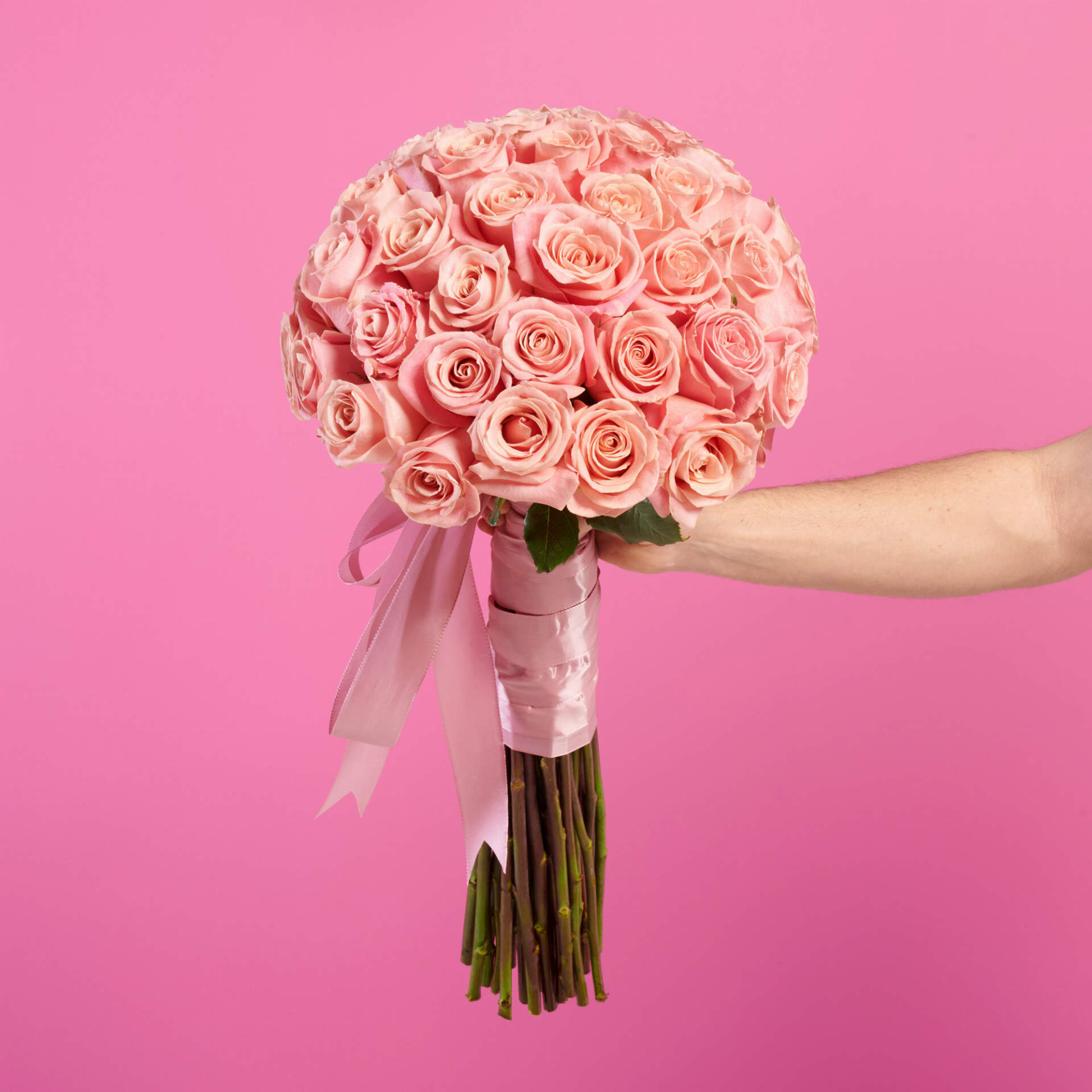 Ramo de rosas Rosa Pastel creado a partir de las mejores rosas del mercado, este ramo que contiene 40 rosas rosas de tallo largo, se prepara en forma de bola y con la empuñadura de lazo rosa pastel.