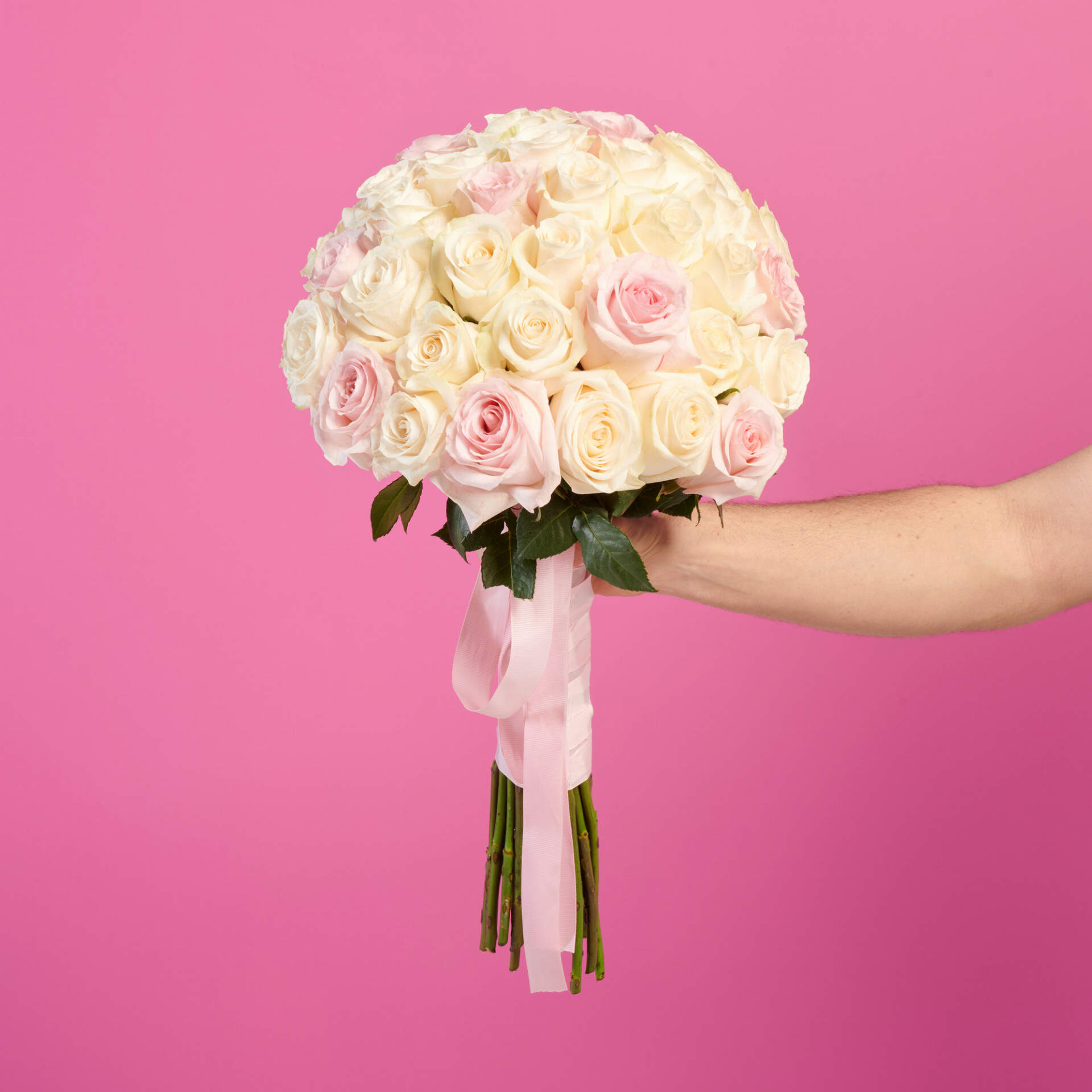 Ramo de rosas rosa y blanco creado a partir de las mejores rosas del mercado, este ramo que contiene 40 rosas rosas de tallo largo, se prepara en forma de bola y con la empuñadura de lazo rosa.