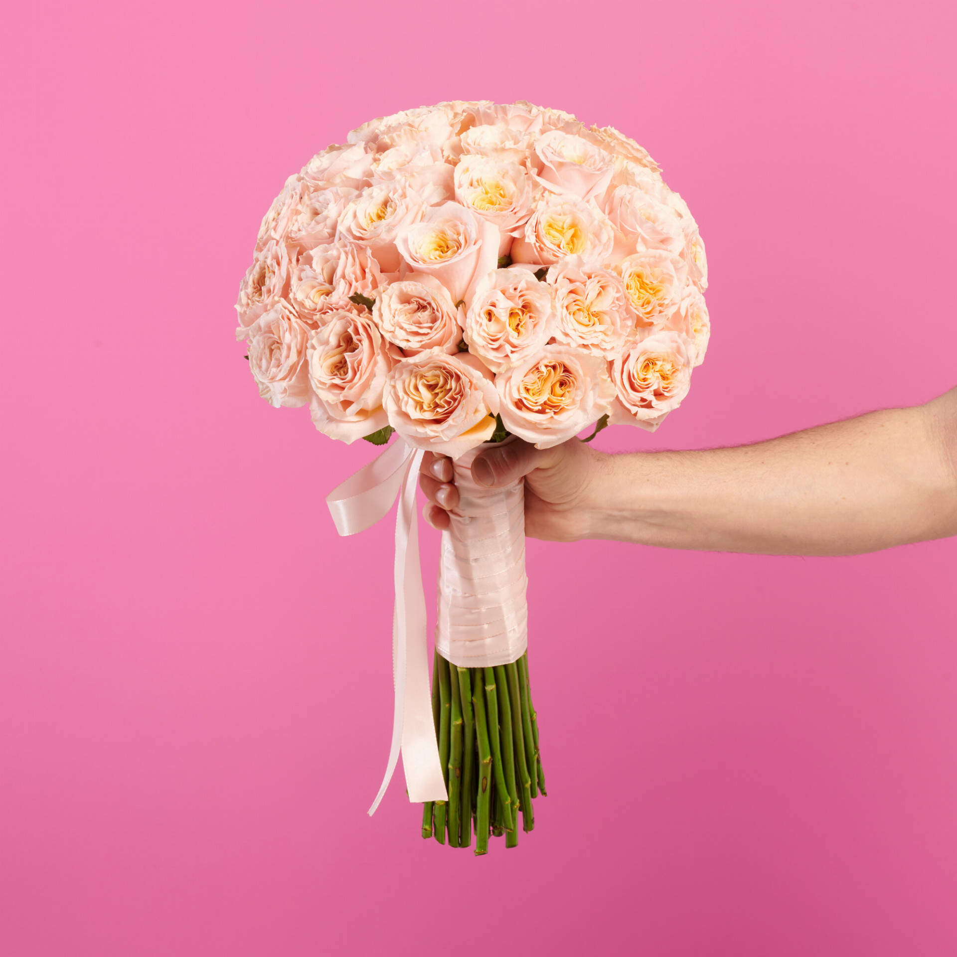 Ramo de rosas Rosa melocotón creado a partir de las mejores rosas del mercado, este ramo que contiene 40 rosas rosas de tallo largo, se prepara en forma de bola y con la empuñadura de lazo rosa pastel.