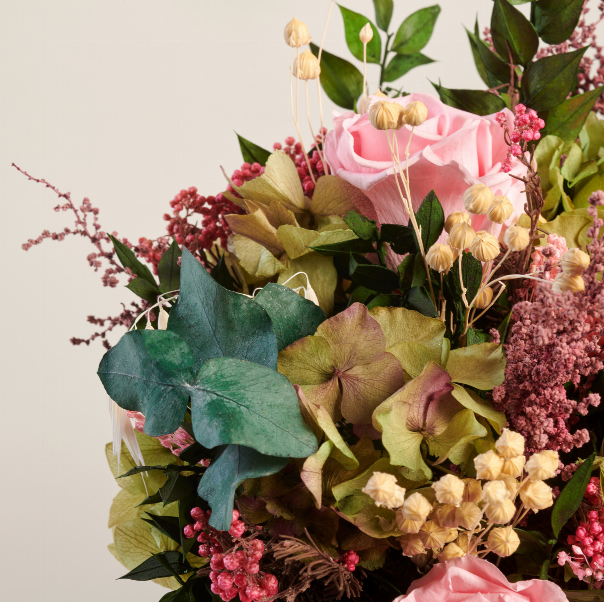 Este ramo de rosas secas y flores preservadas tiene una presentación muy cuidada, envuelto en nuestro papel de seda perfectamente protegido, para que lo puedas transportar sin ninguna dificultad.