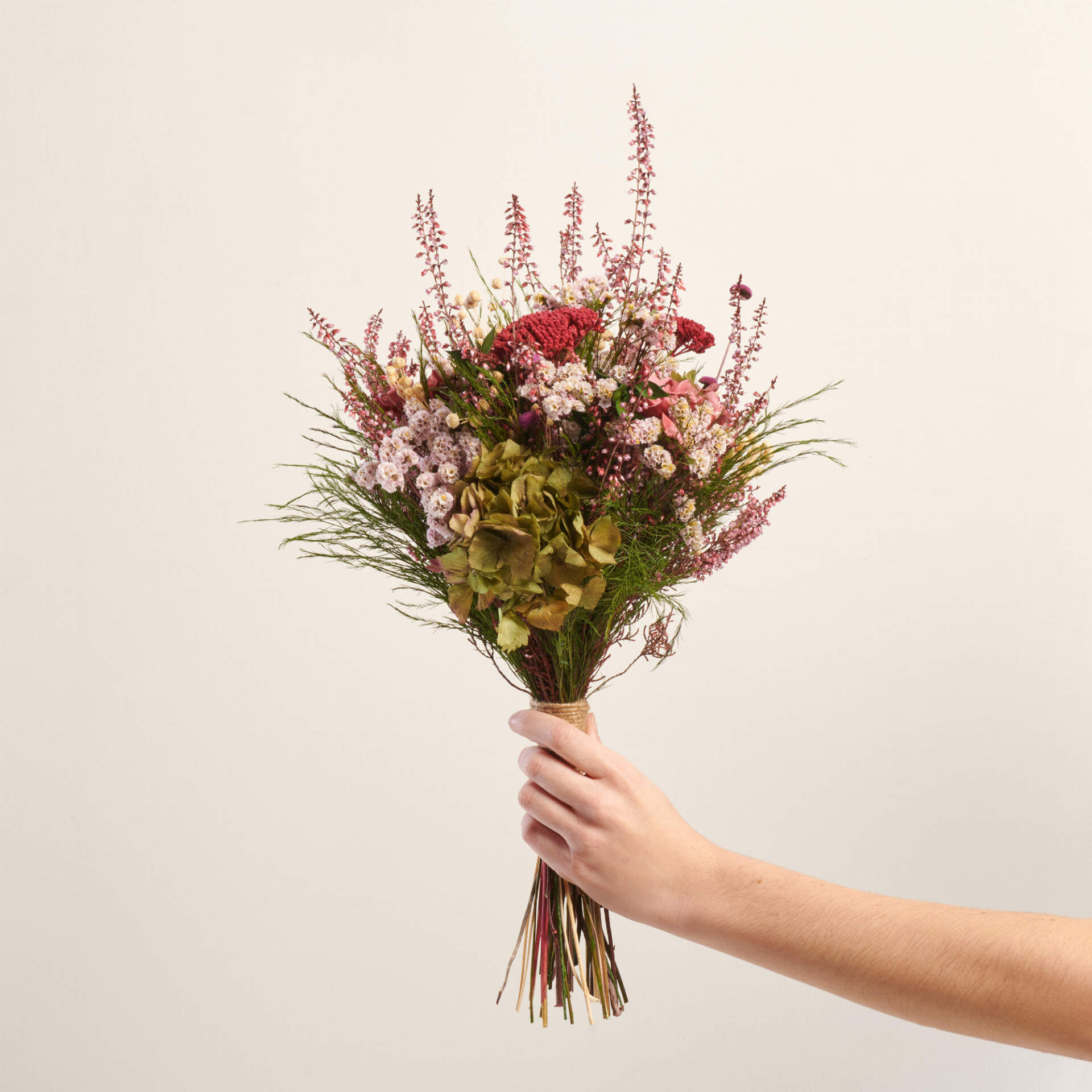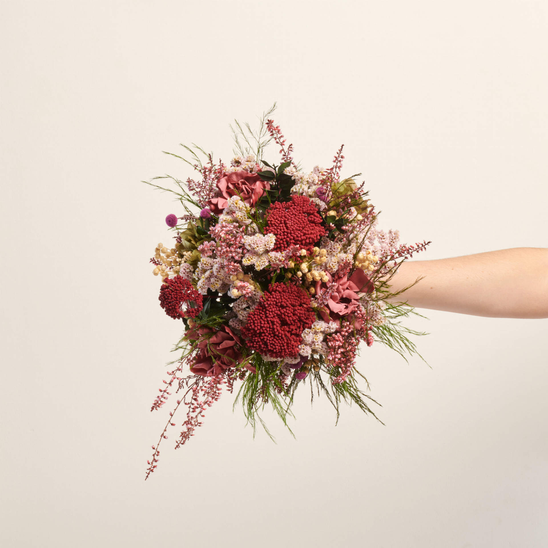 Este ramo de rosas secas y flores preservadas tiene una presentación muy cuidada, envuelto en nuestro papel de seda perfectamente protegido, para que lo puedas transportar sin ninguna dificultad.