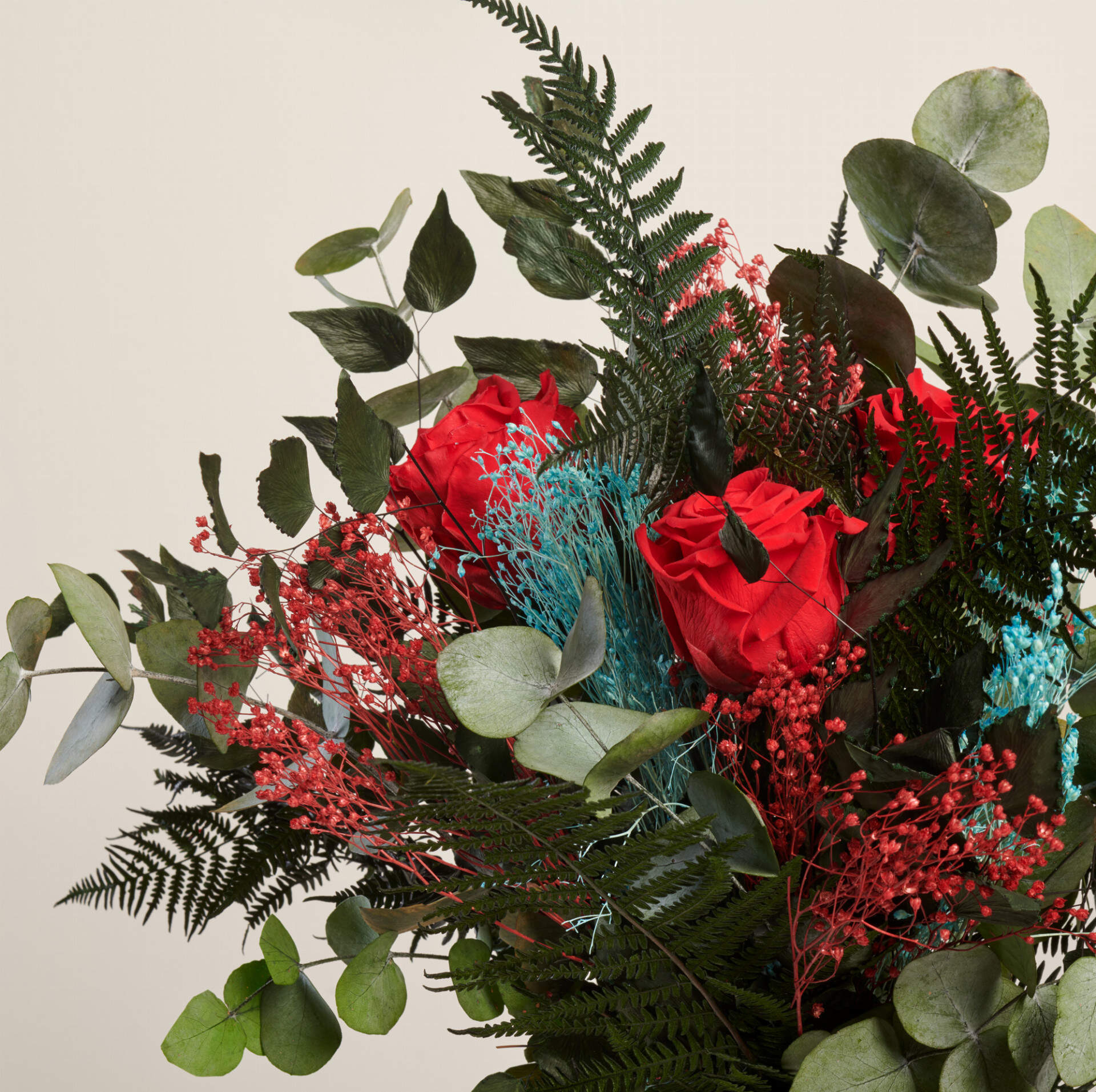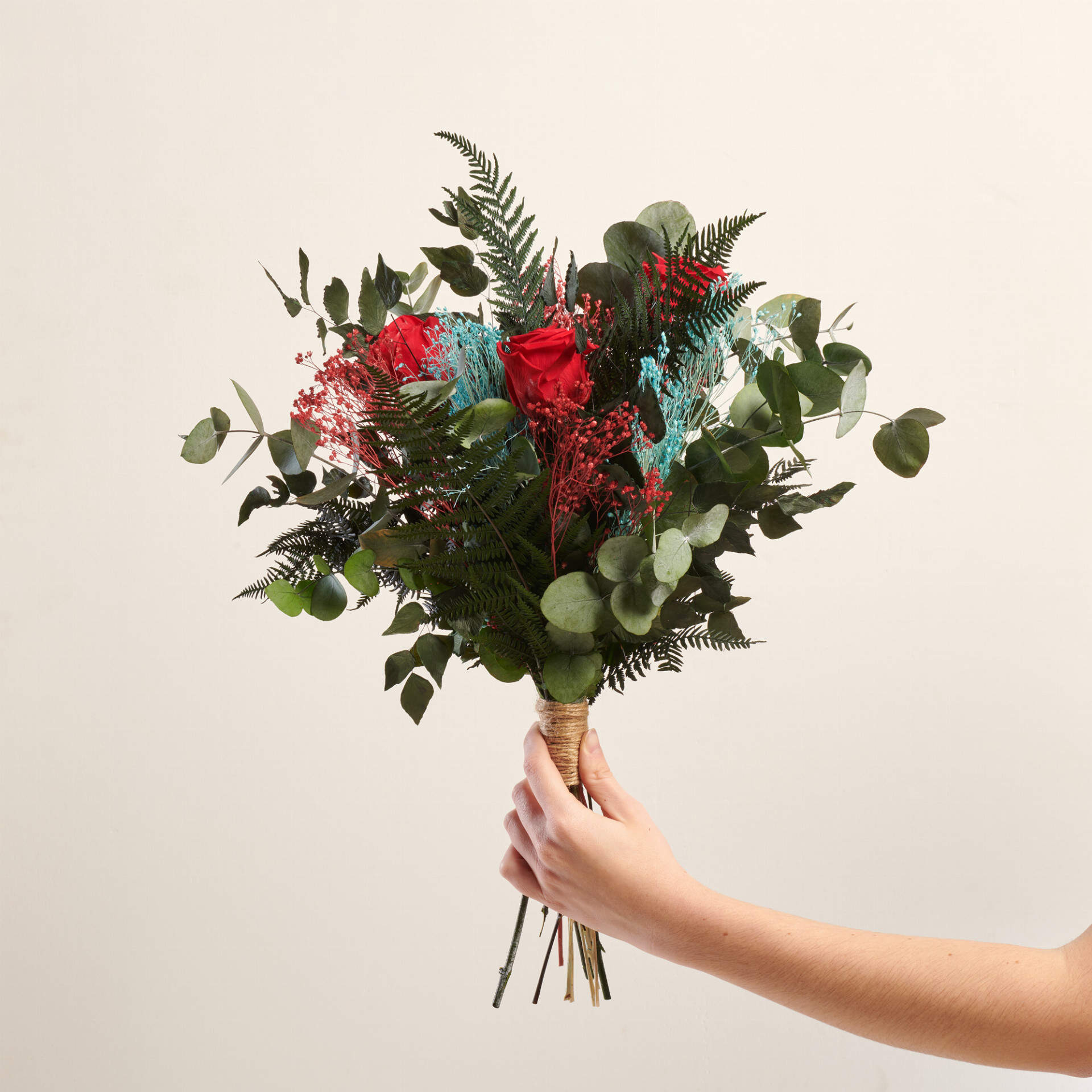 Nuestro ramo de flores cordura esta elaborado en por nuestros maestros floristas. Contiene rosas rojas preservadas, brooms de distintos colores, dos tipos diferentes de helecho y eucalipto preservado.