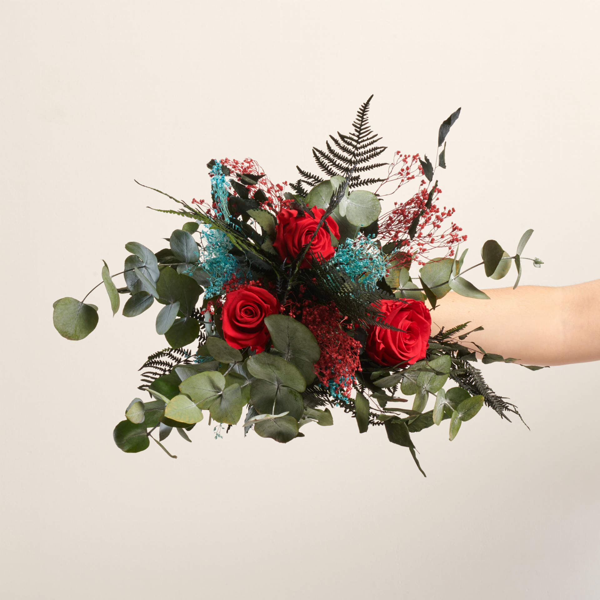 Un ramo de flores preservado con una combinación de verdes y azules oscuros que hacen que las rosas sobresalgan y se conviertan en el elemento más llamativo y principal de este ramo. Este ramo de flores preservado es ideal para una dama de boda, ligero y sofisticado será el complemento perfecto.
