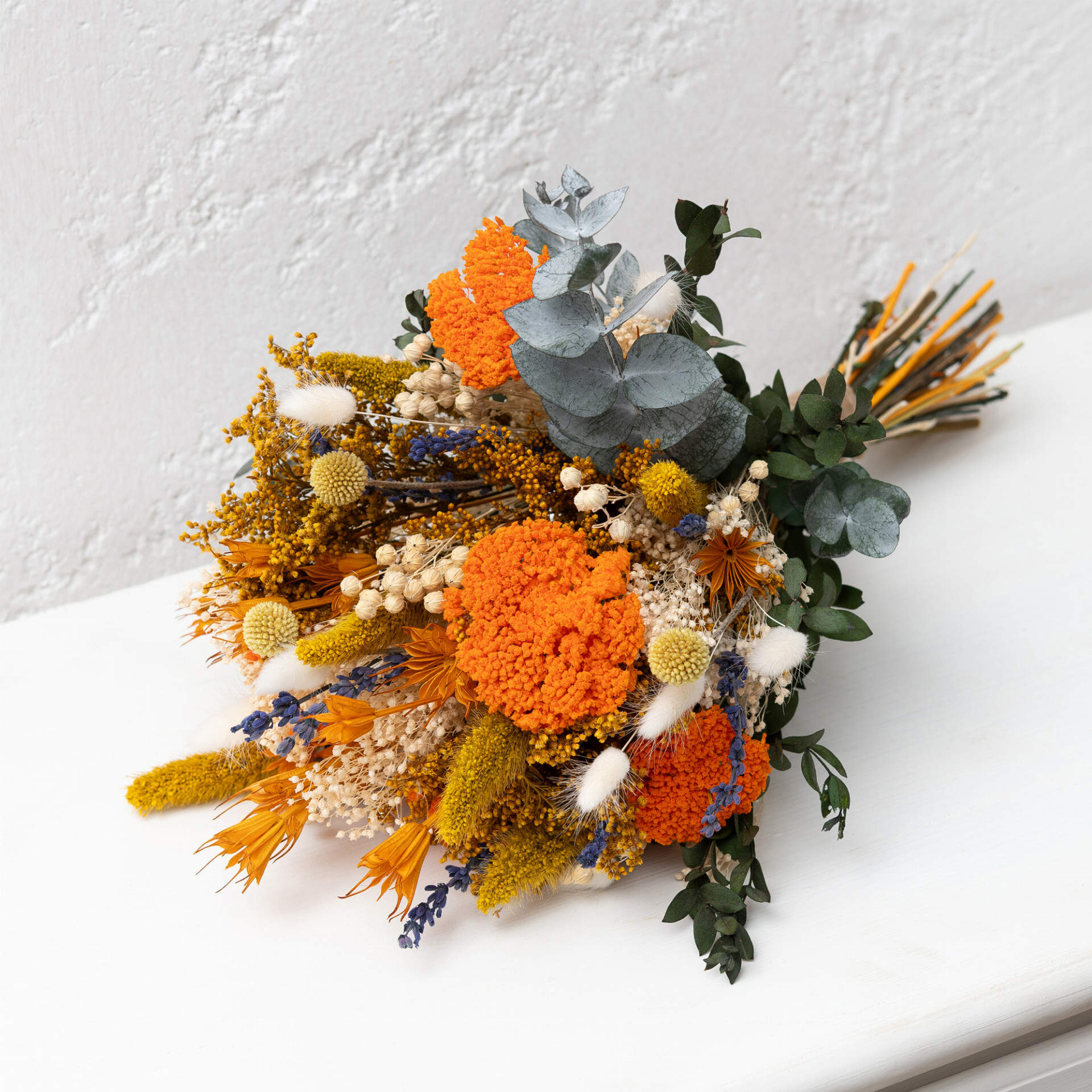 Este ramo silvestre preservado esta compuesto en tonos cálidos como el naranja, todo ello combinado con eucalipto verde.