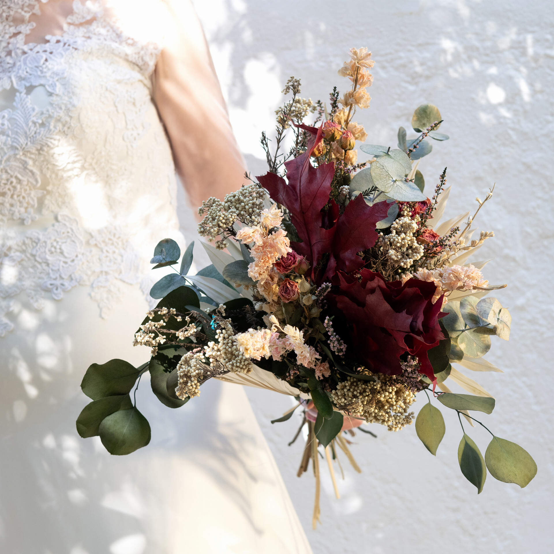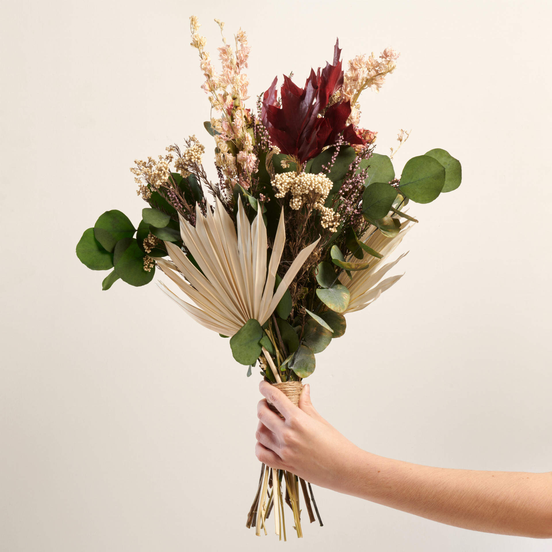 Destaca cualquier espacio vacío con este ramo de flores preservadas con una presentación cuidada y con carácter. Palmito, kerkus y eucalipto en tonos tierra que le da a este ramo ese toque que tanto nos gusta.