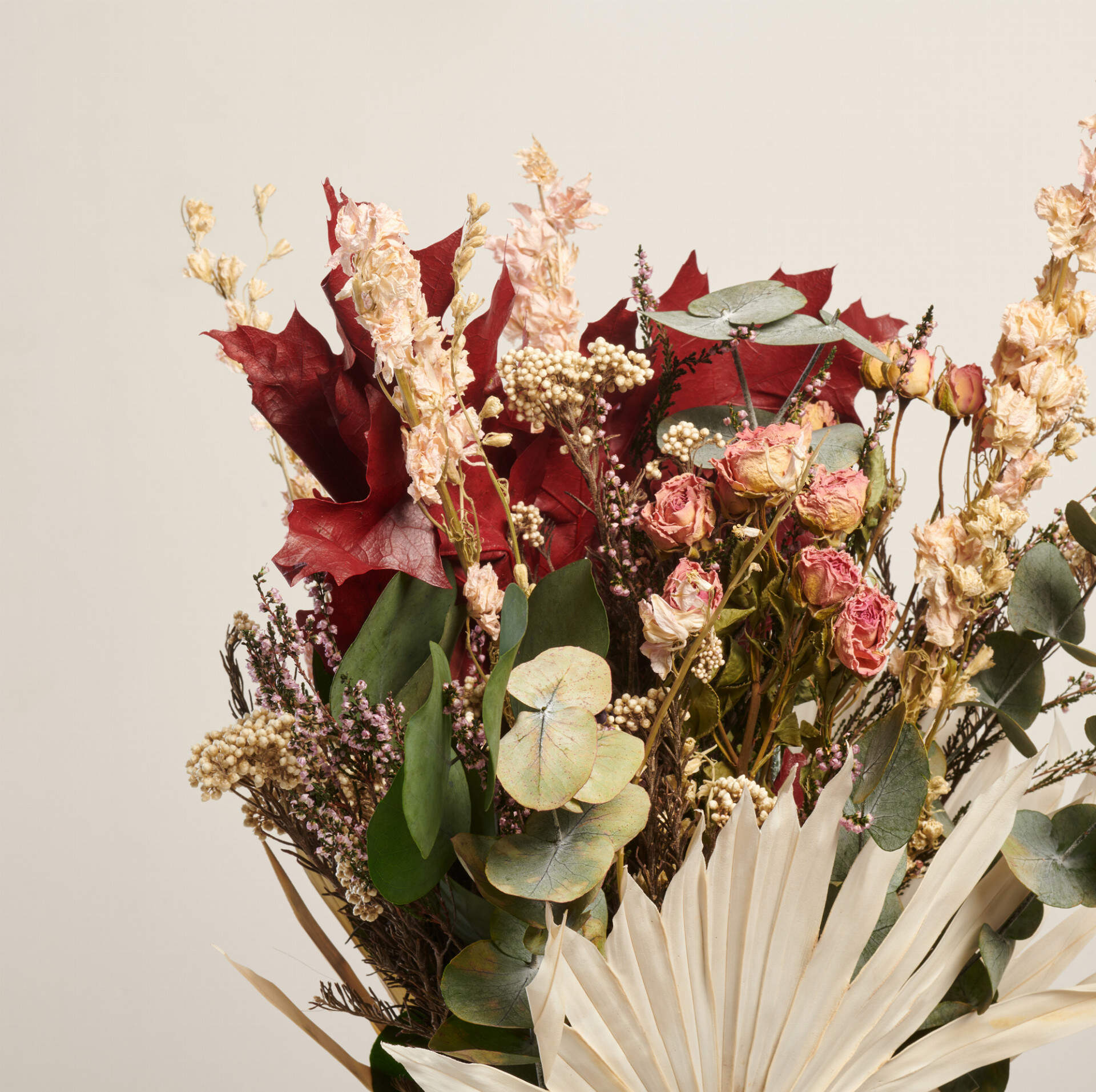Este ramo preservado otoñal esta elaborado con palmitos, Delphinium rosa, flor de arroz, Erika rosa, Rosas ramificadas, kerkus burdeos y Eucaliptos pópulos y cinérea.
