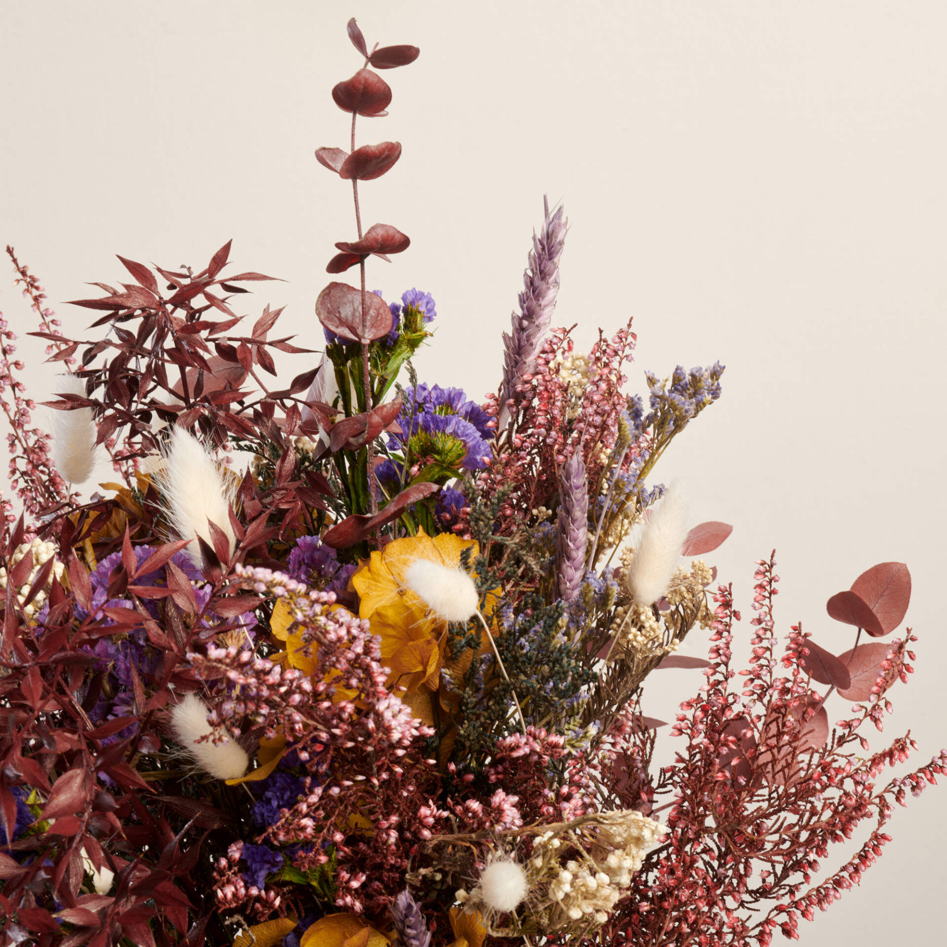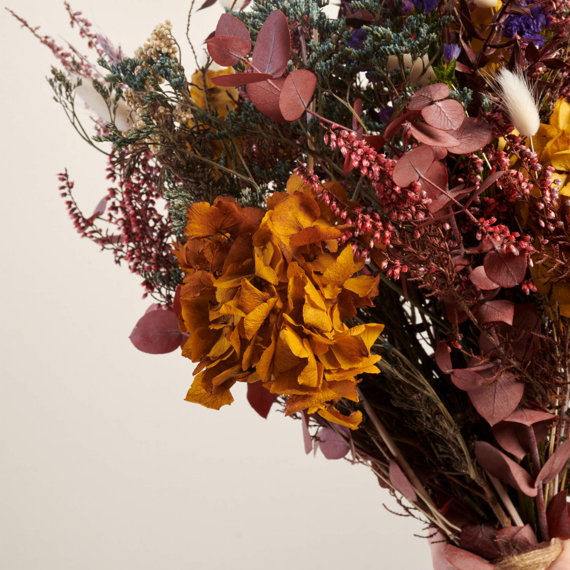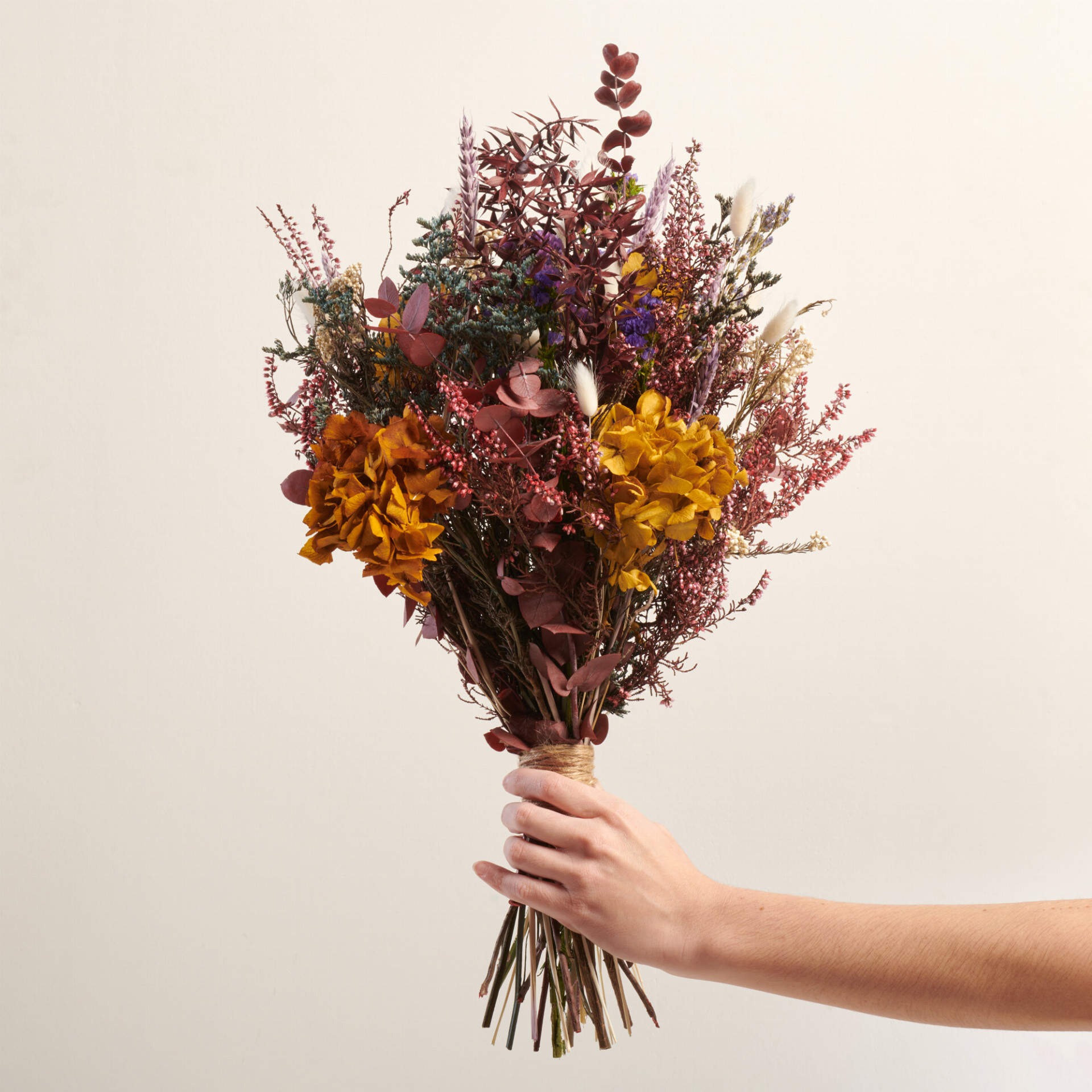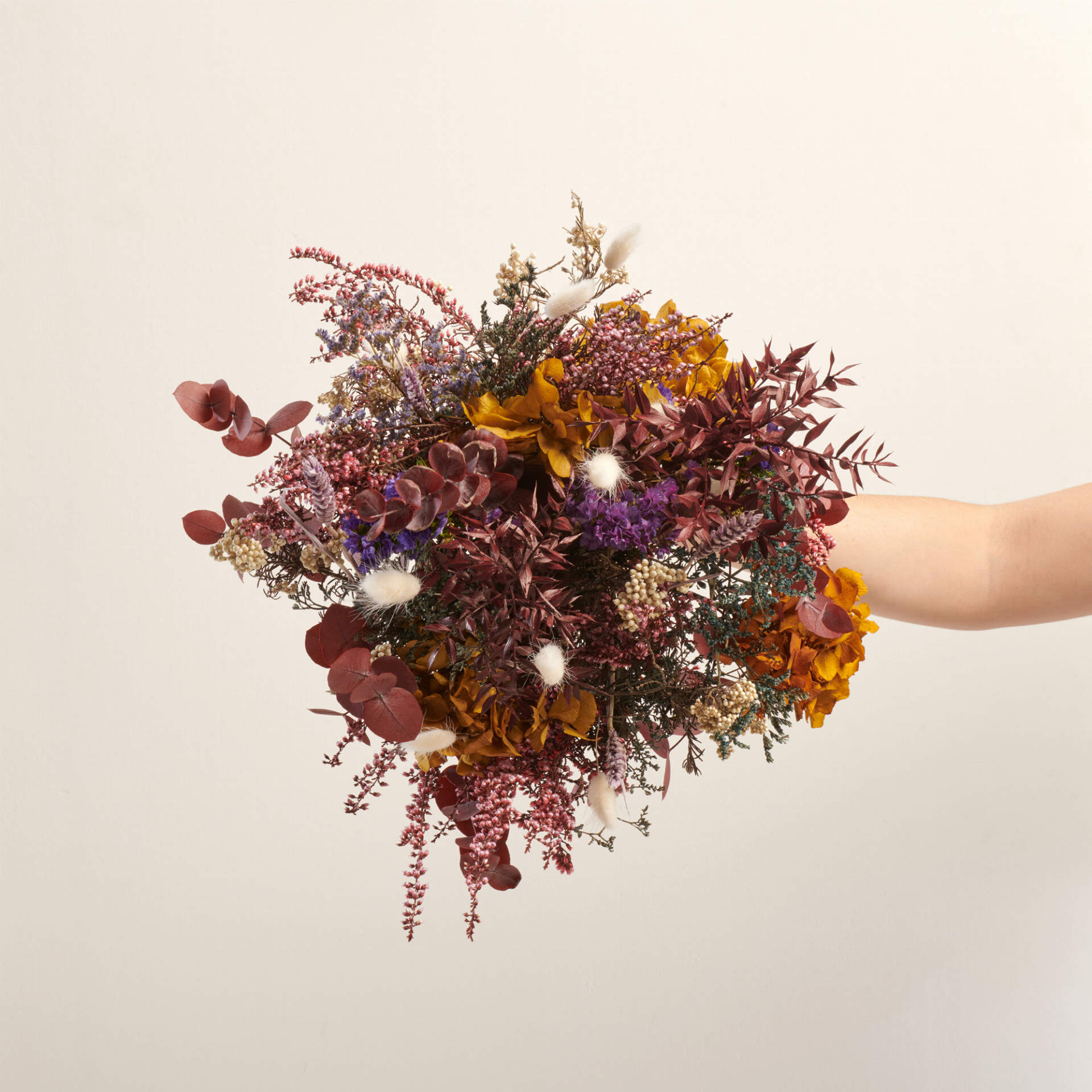 Dejate seducir por nuestras flores de la mayor calidad. Las flores preservadas utilizadas para este ramo son de otro mundo amarelinos de colores, Erika lavanda y eucalipto burdeos combinados con la joya de la corona Hortensias y flor de arroz combinan con Estatice y trigo