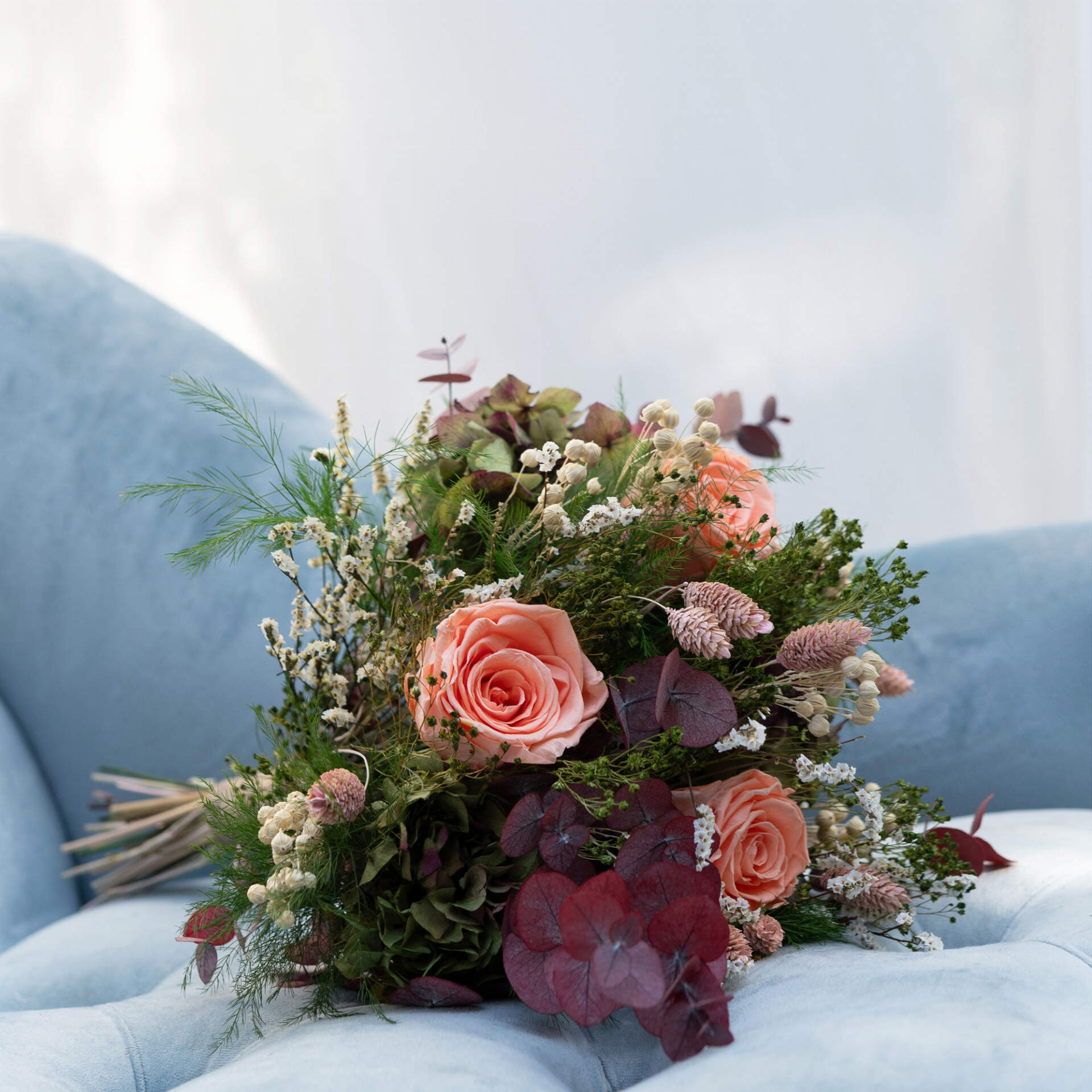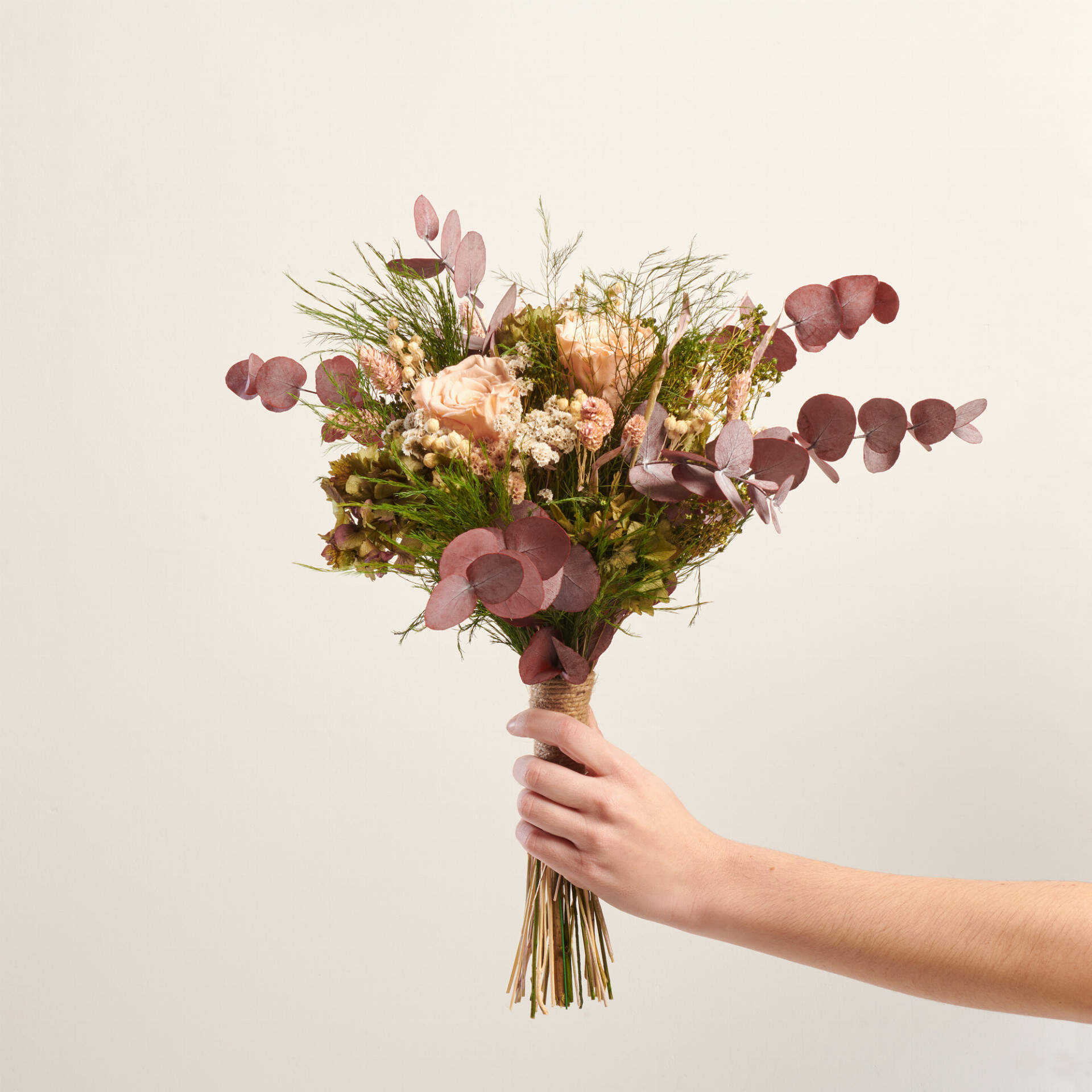 Serendipia está elaborado con hortensia verde, rosas color Salmón, limonium, brooms verde, lino, esparraguera y eucalipto burdeos. Una combinación atrevida para una creación fresca y divertida.