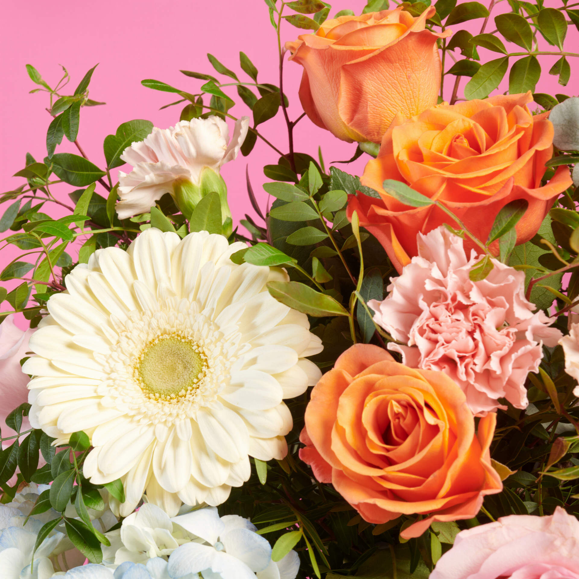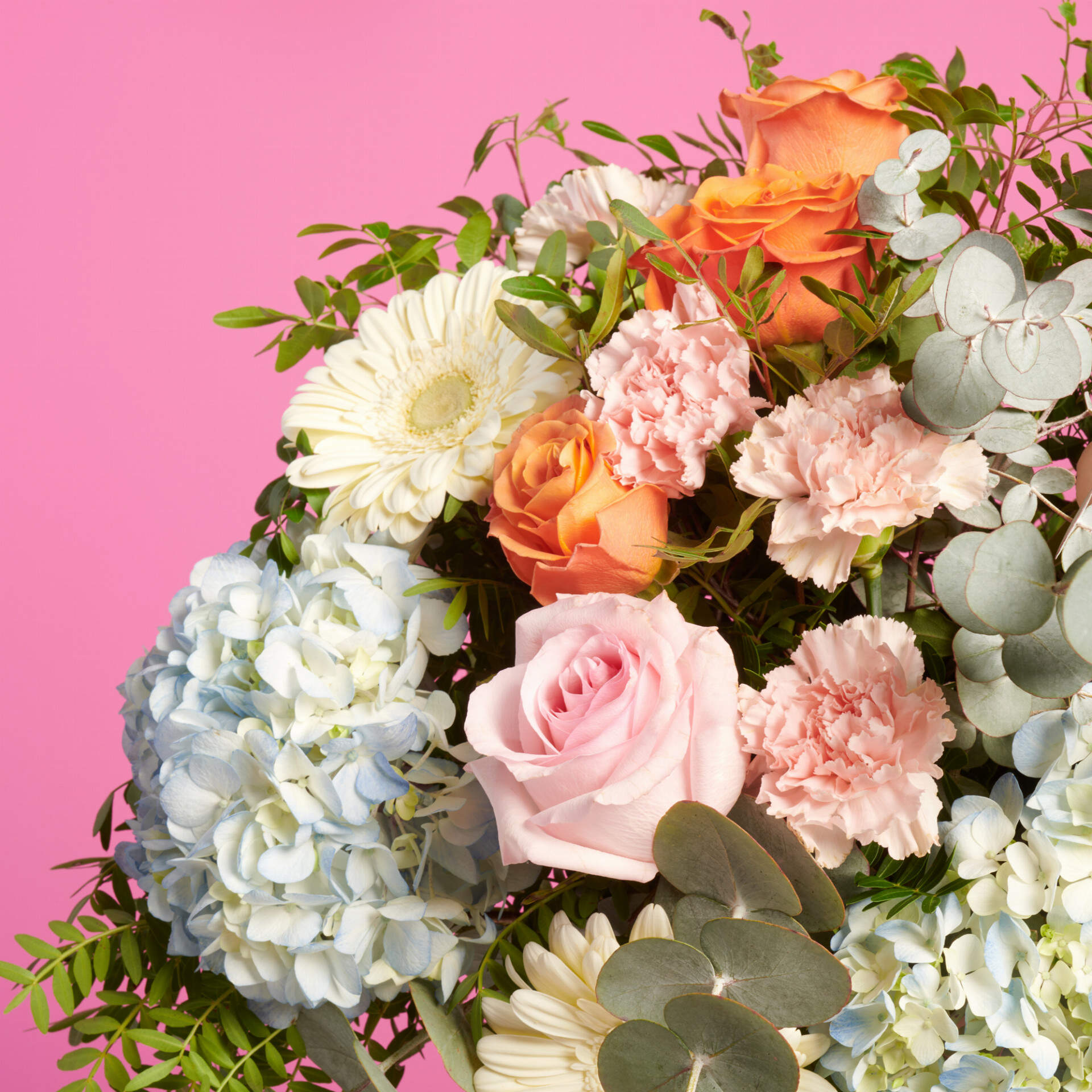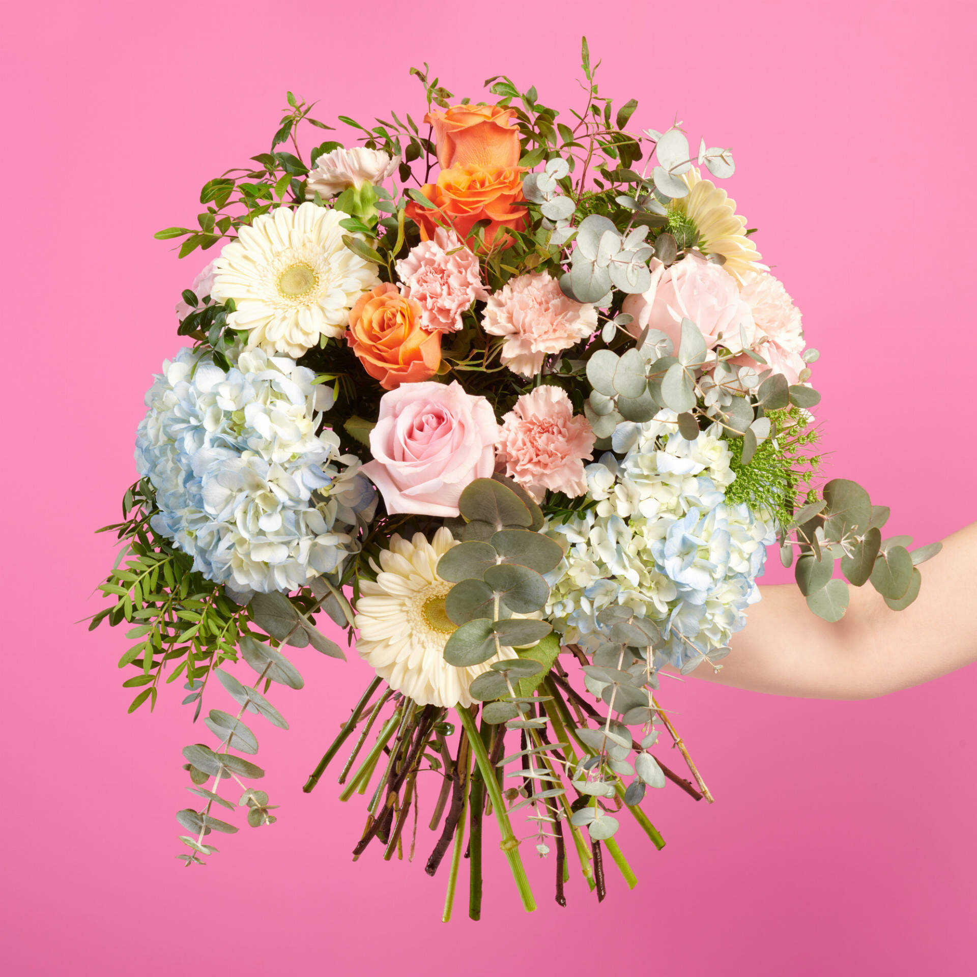 Algodón de azucar es un ramo de la colección ocasiones especiales, compuesto por hortensias y gerberas, combinado con rosas naranjas y rosas que dan forma y personalidad a este ramo premium.