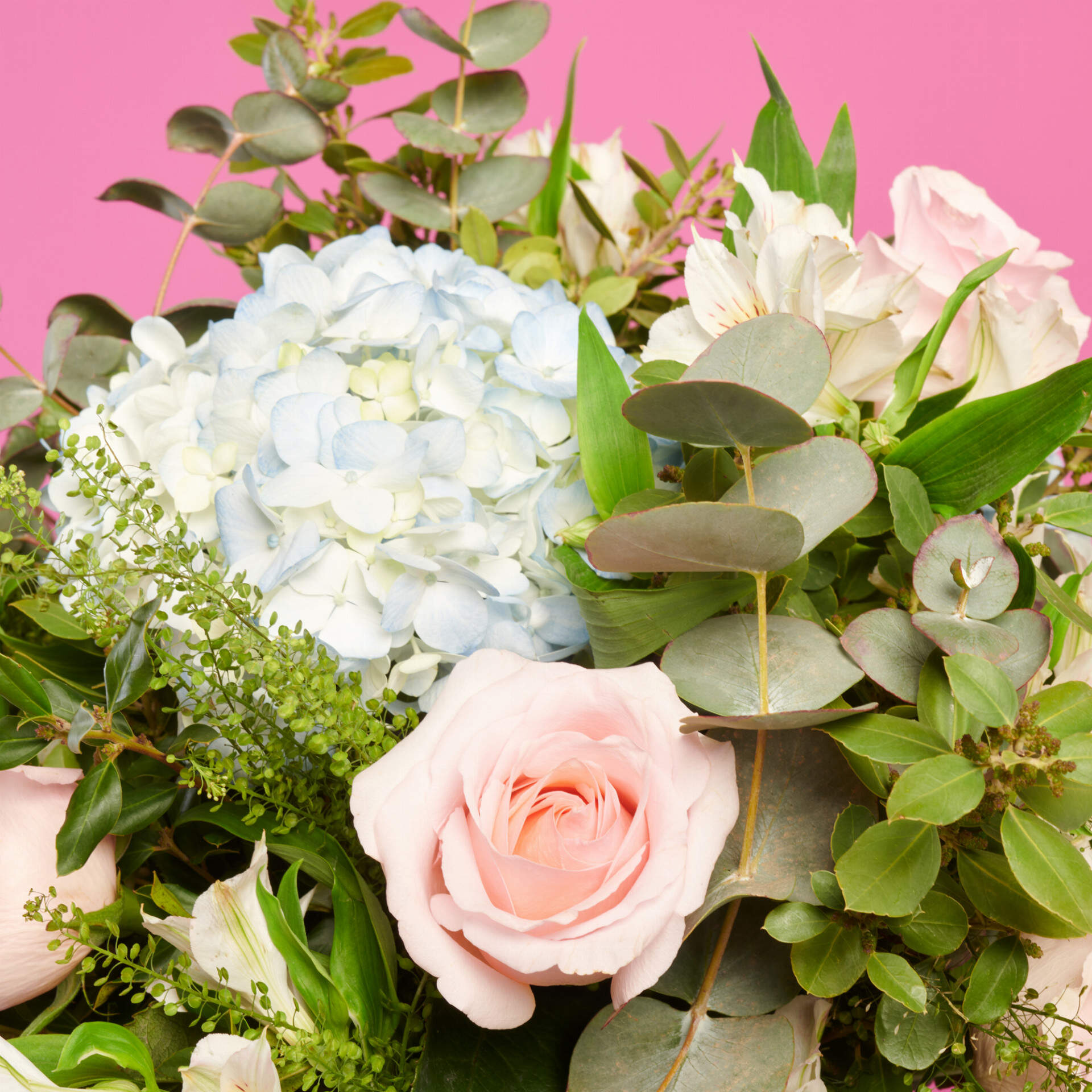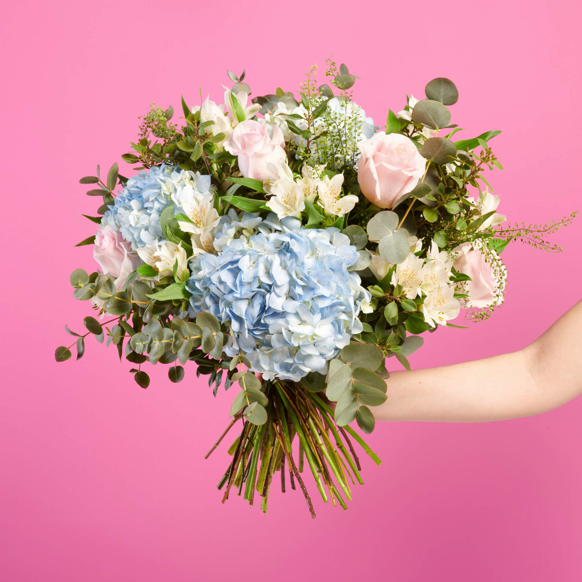 Cariñosos y esponjosos asi son los besos de Corazonada, nuestro ramo para enamorados que sabe a un trocito de cielo. Las rosas rosas son nuestra golosina favorita por eso queremos compartirla en este conjunto de flores lleno de fantasía. Además las hortensias azules le dan esa suavidad que tanto nos gusta. Para ello hemos seleccionado: Elaborado con rosas rosas, hortensias azules, alstroemeria, ve
