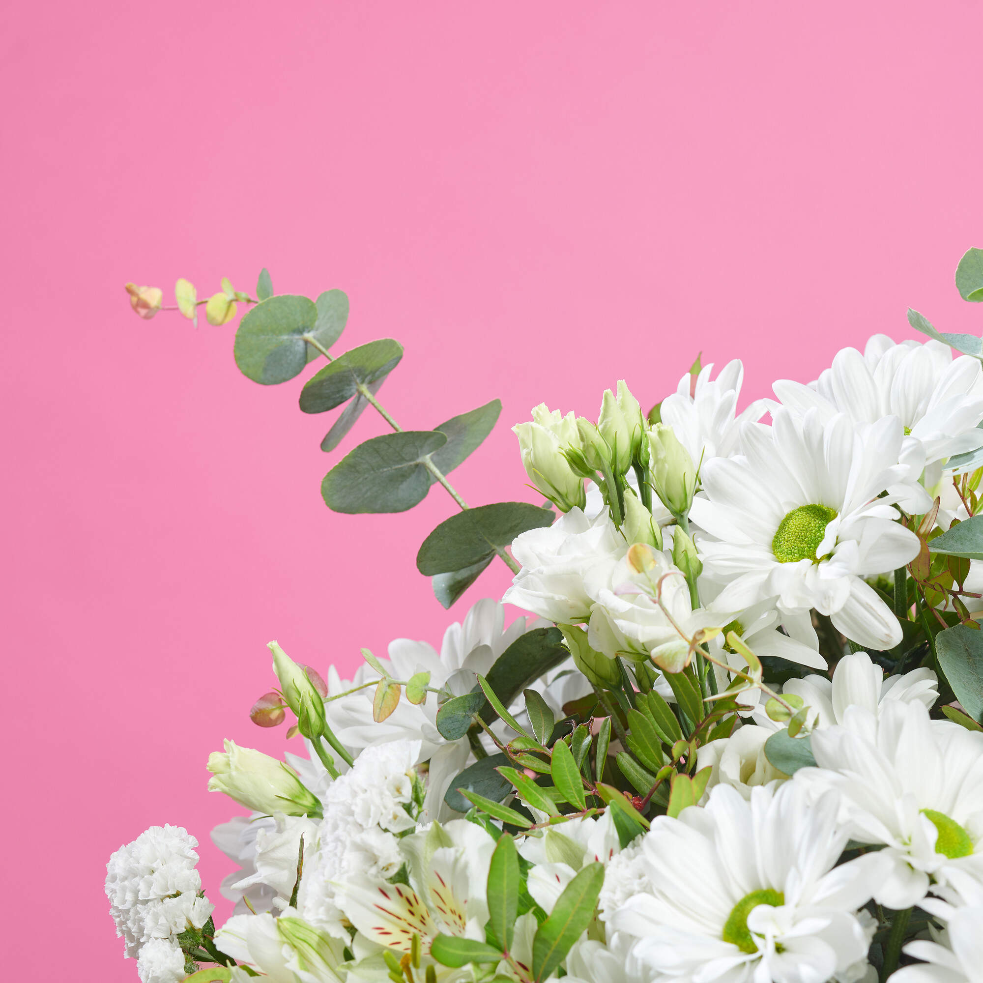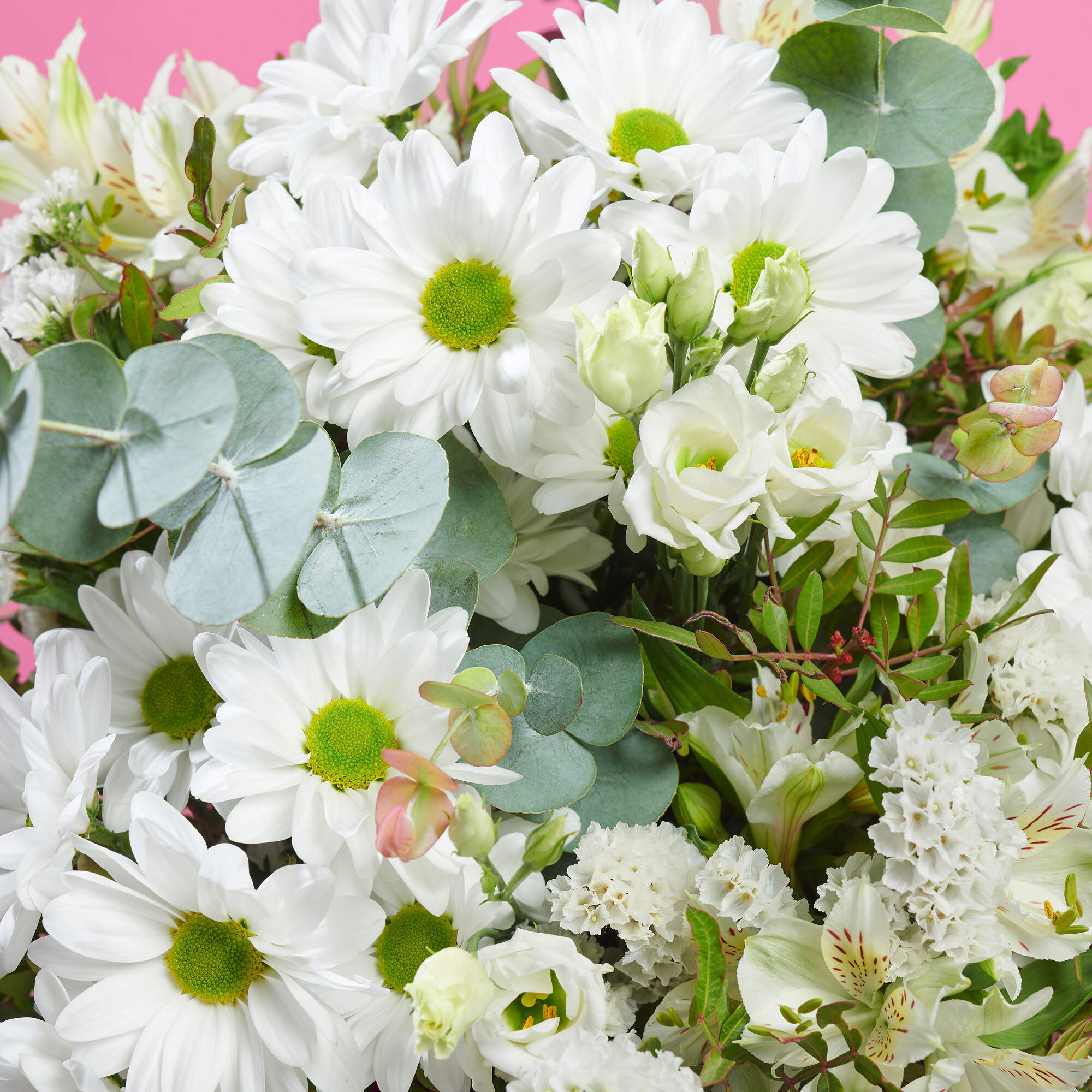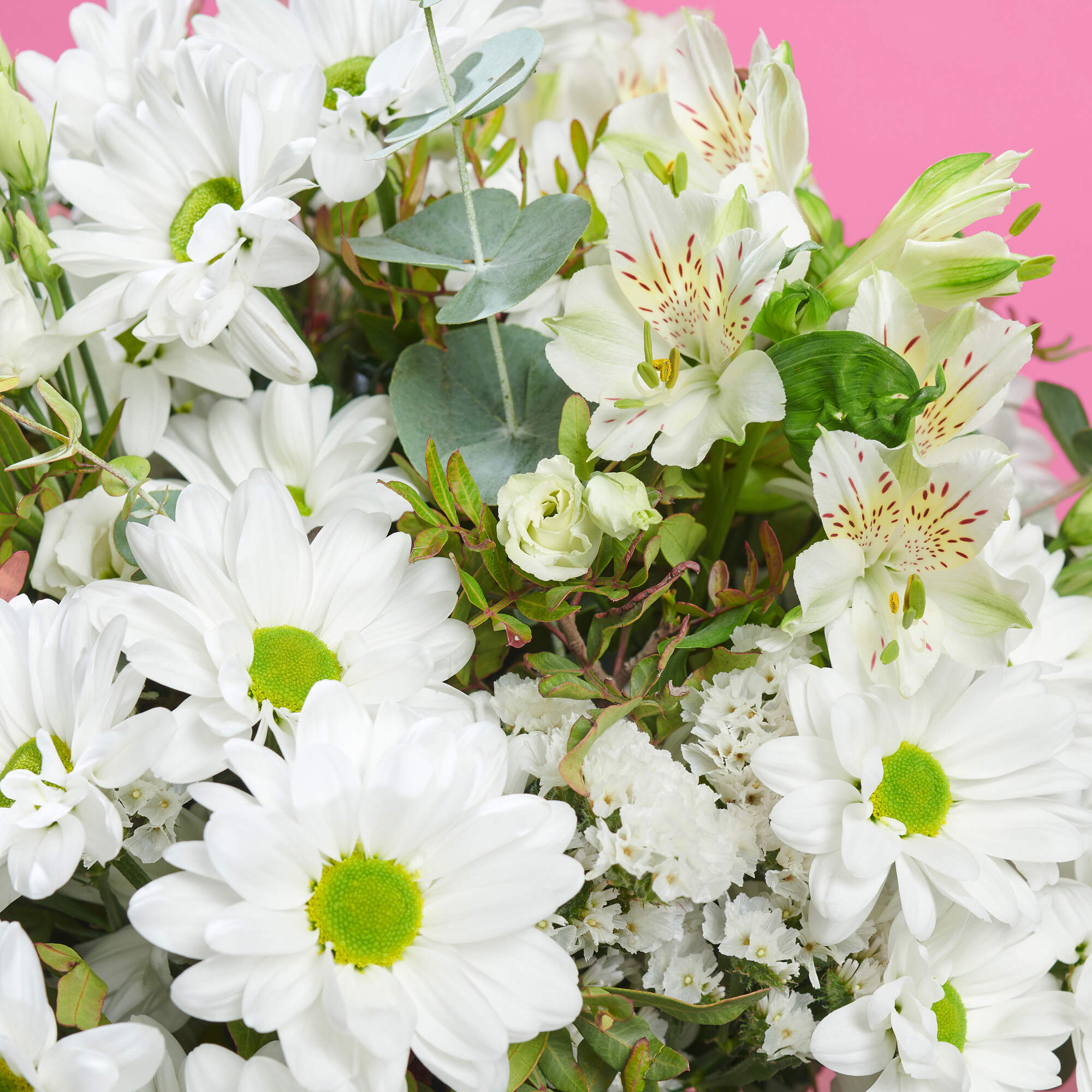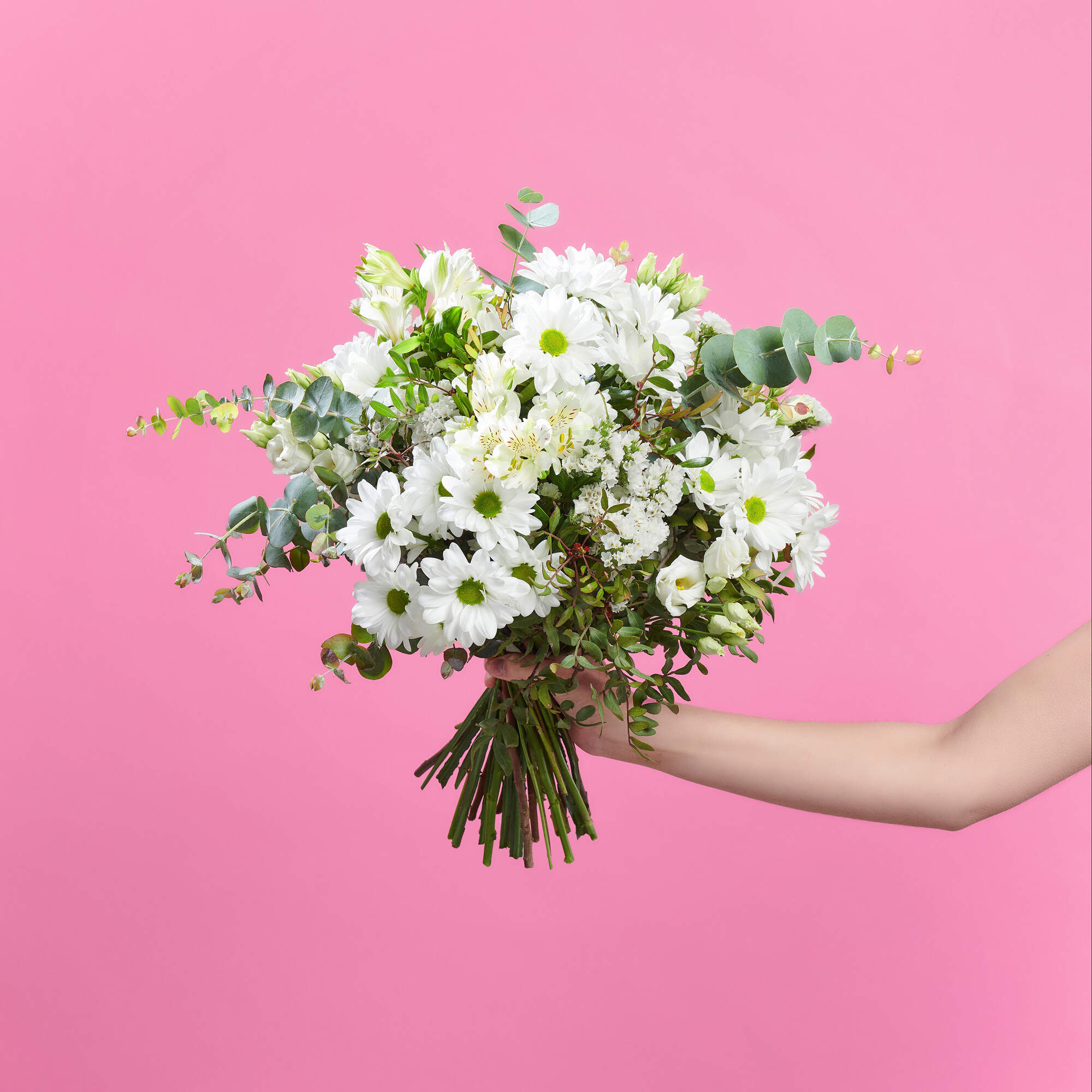 Mariposas en el estomago esta elaborado con margaritas blancas, alstroemeria y estatices del blanco mas puro, todo ello combinado con nuestros verdes como eucalipto y lentiscos de cultivos sostenibles.