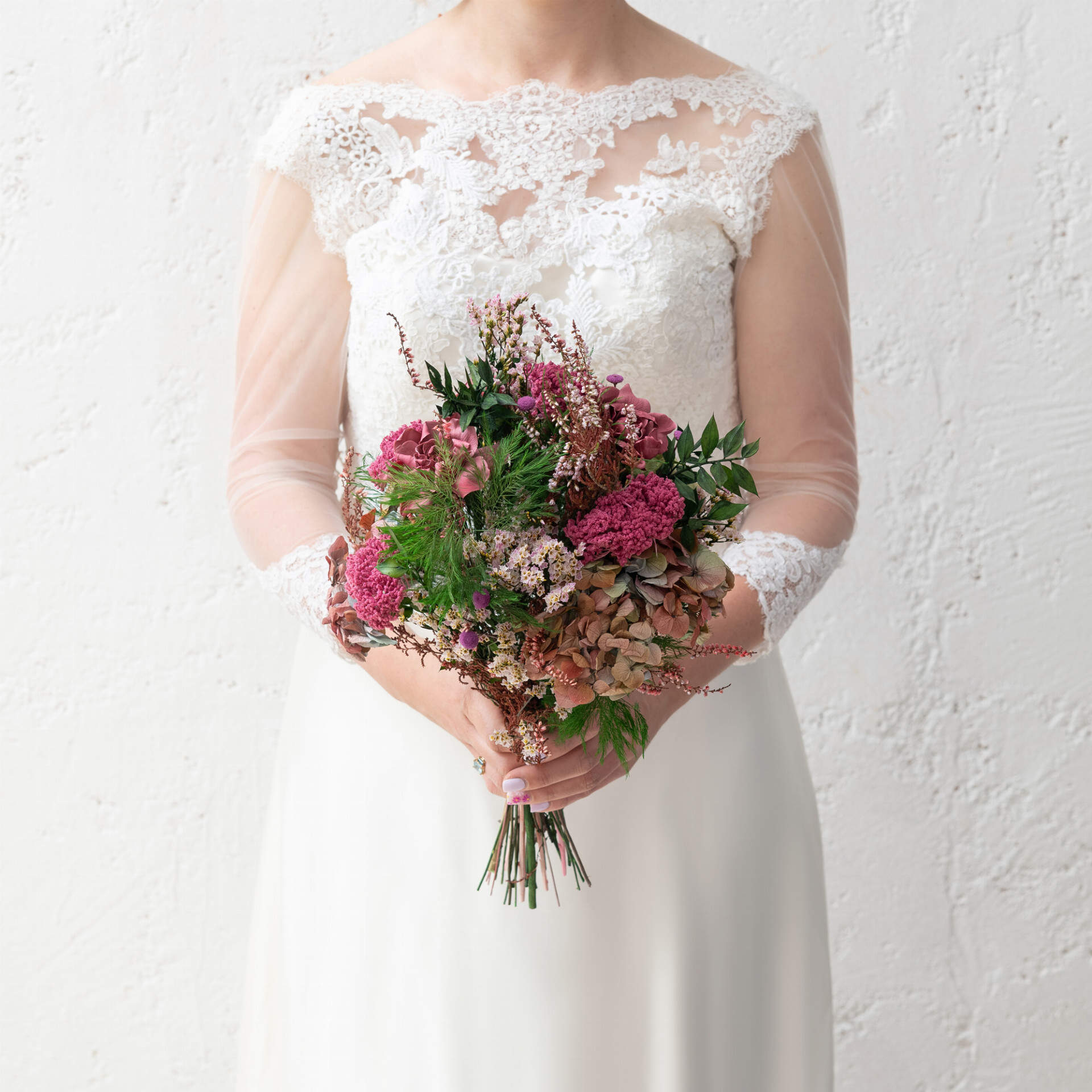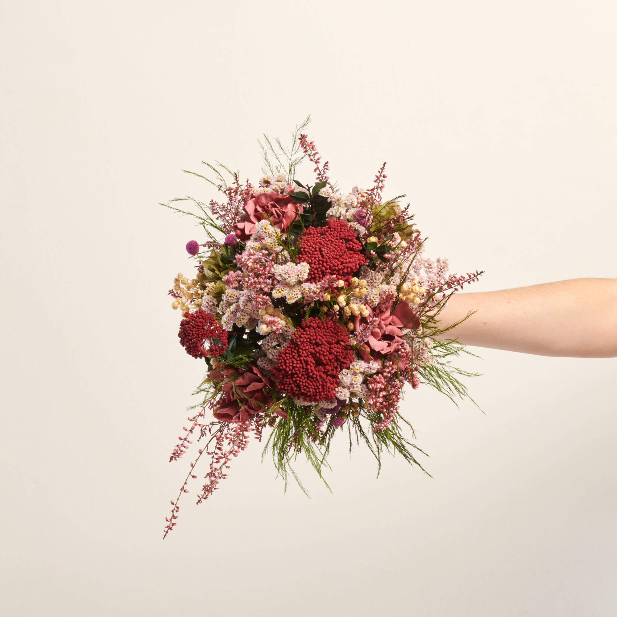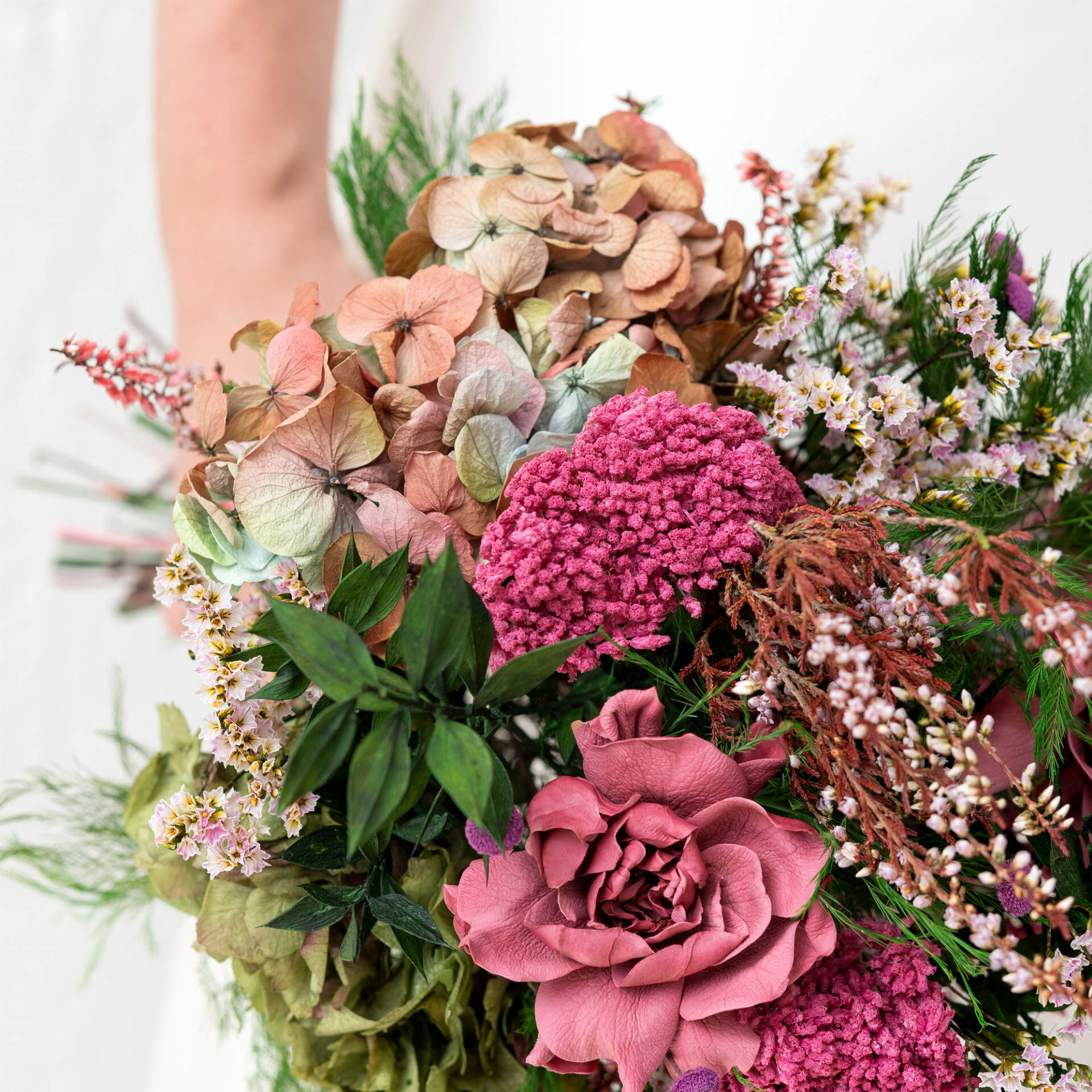Nuestro ramo de preservado Ajetreo tiene todos los elementos de un ramo de flores atrevido y original, con los colores y flores más silvestres. Las hortensias en color envejecito y las tonalidades rosadas se unen en un ramo ideal para esa novia más actual. Compra tu ramo de novia preservado en Bésam