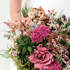 Ajetreo está compuesto por hortensias envejecidas y flores en tonalidades rosa, acompañado de una selección de verdes preservados.