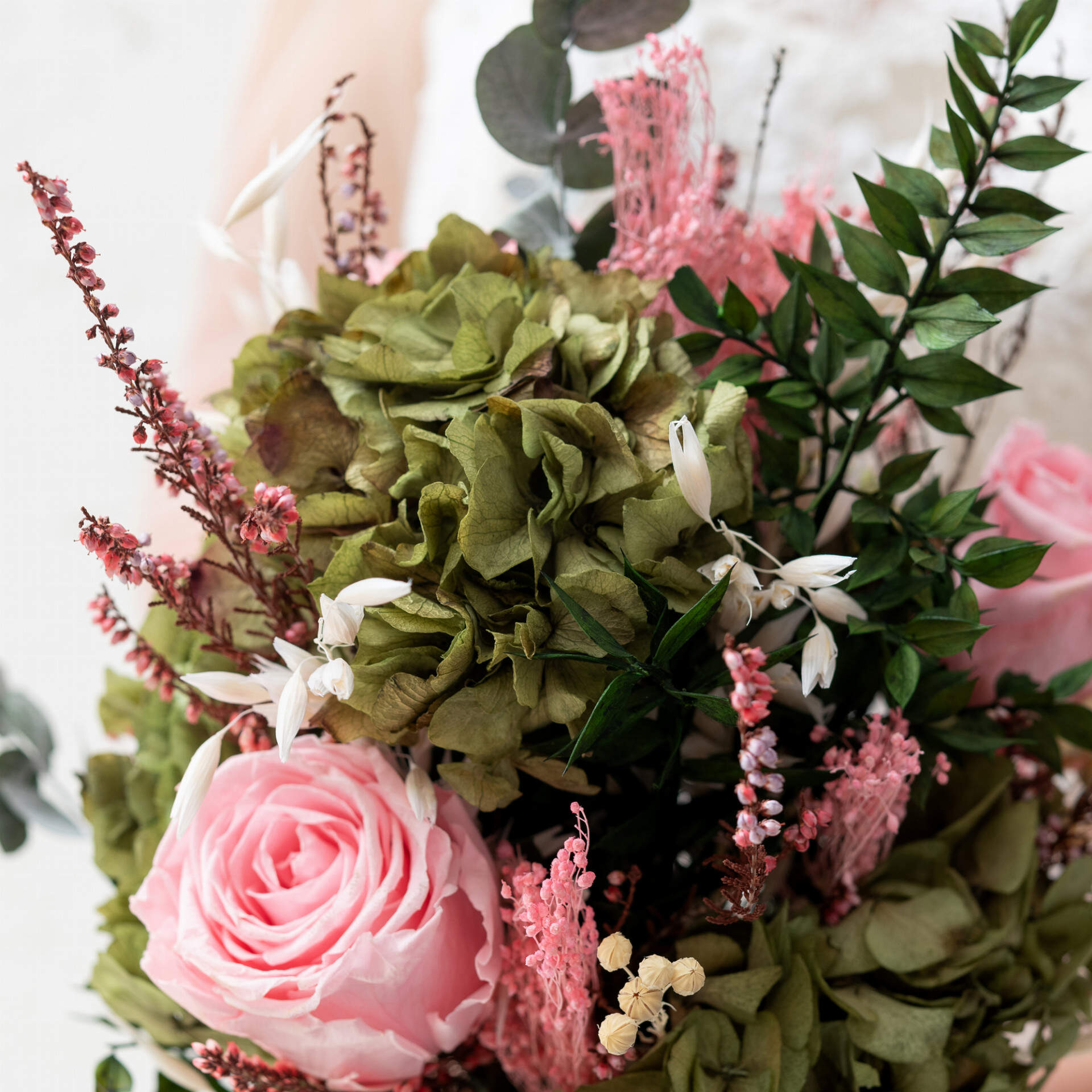 Nuestro ramo de preservado Efímero tiene todos los elementos de un ramo de flores muy original, con los colores y flores más atrevidas. Rosas rosas y hortensias verdes se unen en un ramo ideal para esa novia clásica pero atrevida. Compra tu ramo de novia preservado en Bésame Mucho.