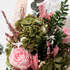 Efímero está compuesto de rosas en tono rosa y hortensias verdes, acompañado de una selección de verdes preservados en los que destaca el eucalipto cinérea.
