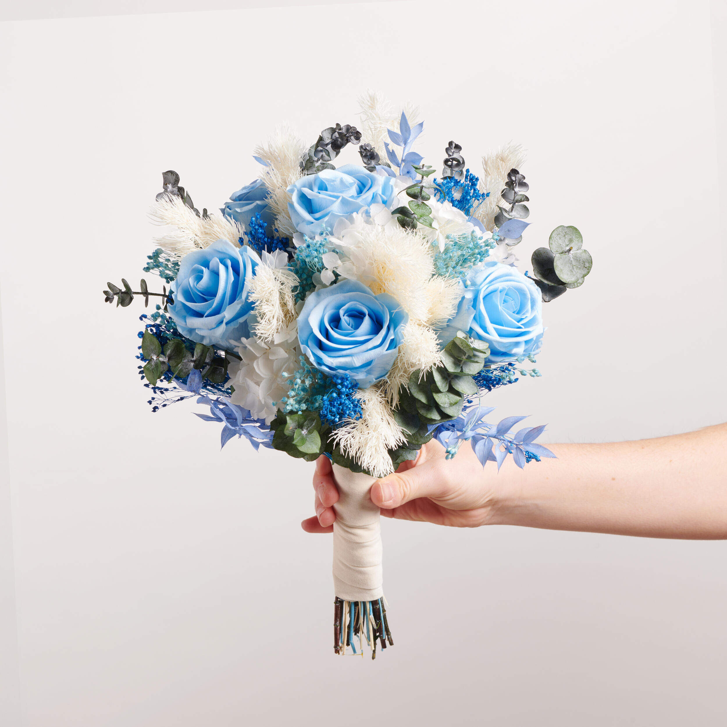Nuestro ramo de preservado Fantasía Infinita tiene todos los elementos de un ramo de flores atrevido, con los colores y flores más mágicas. Rosas azules y hortensias blancas se unen en un ramo ideal para esa novia más atrevida. Compra tu ramo de novia preservado en Bésame Mucho.