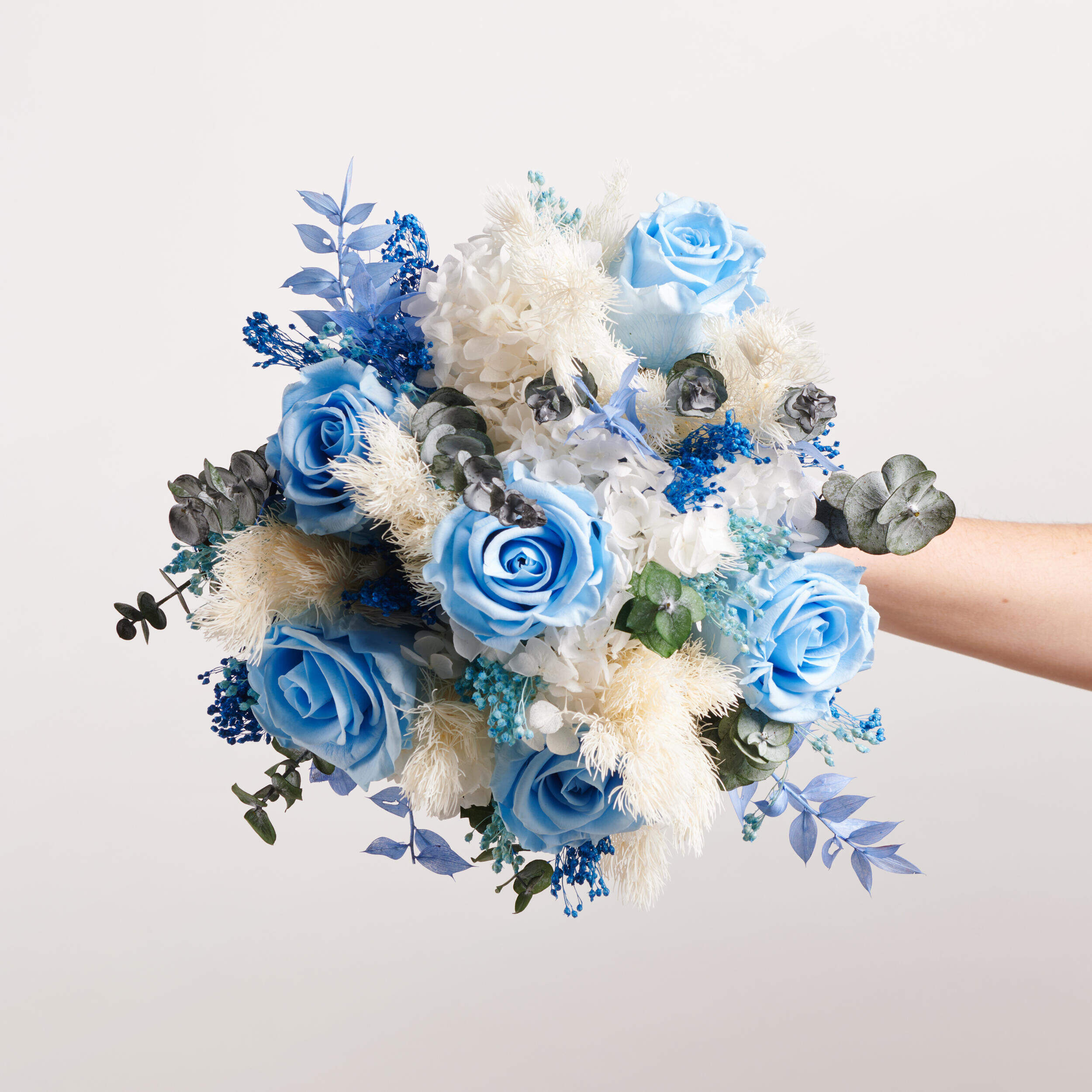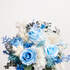 Fantasía Infinita está compuesto de rosas azules y hortensias blancas se unen en un ramo ideal para esa novia más atrevida. Compra tu ramo de novia preservado en Bésame Mucho.