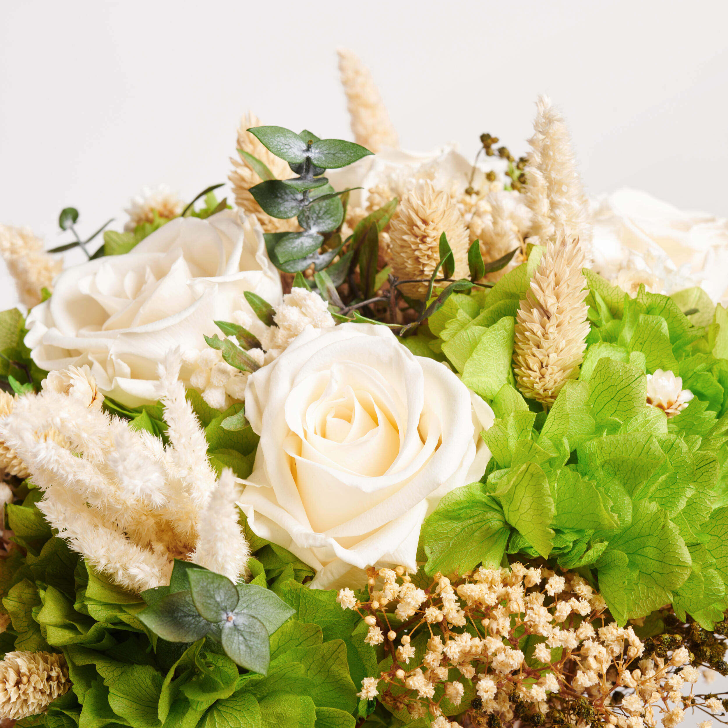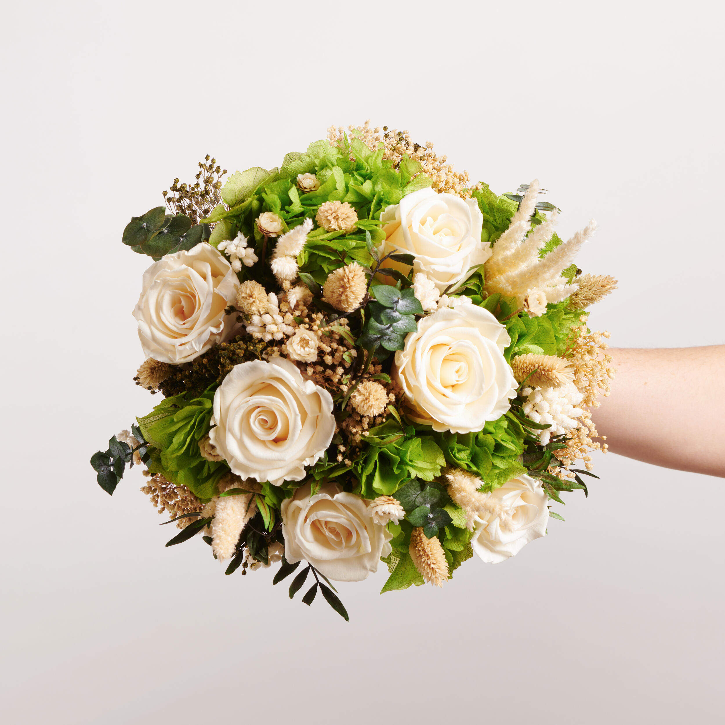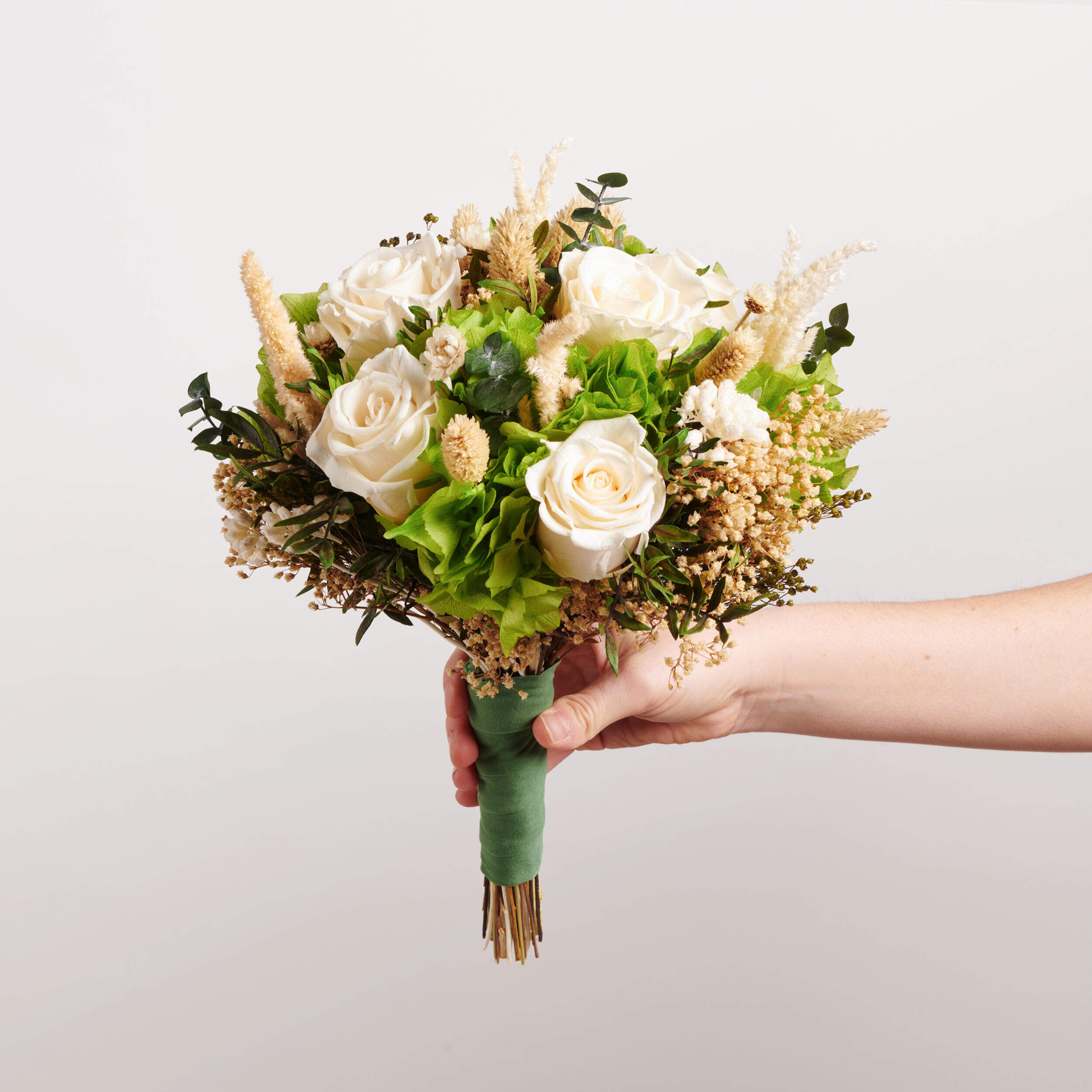 Nuestro ramo de preservado Instante Eterno tiene todos los elementos de un ramo de flores clásico y dulce, con los colores y flores más suaves. Rosas blancas y hortensias verdes se unen en un ramo ideal para ti. Compra tu ramo de novia preservado en Bésame Mucho.