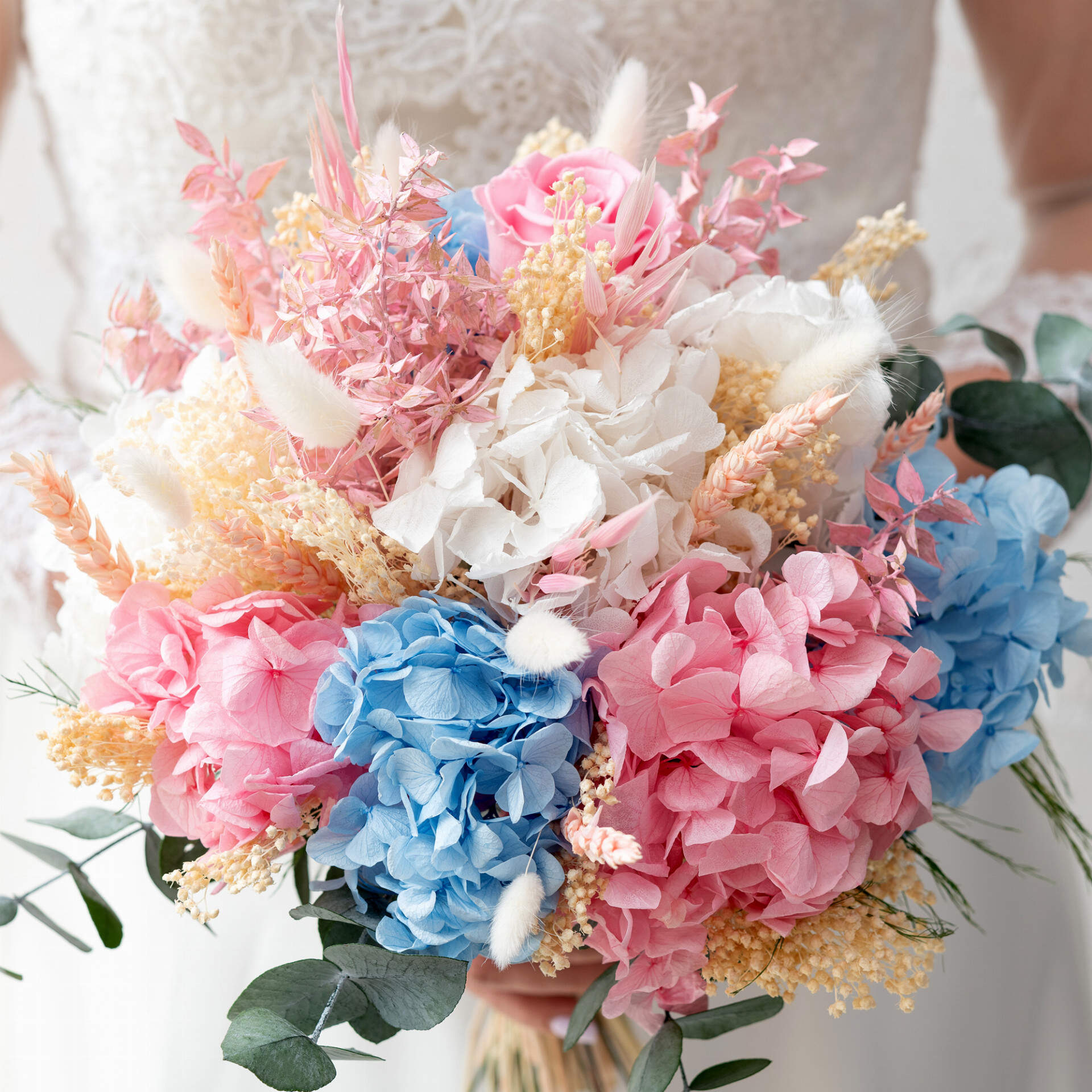 Parpadeo está compuesto de rosas en tonos rosas y hortensias en colores azul, rosa y blancas, acompañado de una selección de verdes y espigas preservadas en los que destaca el eucalipto cinérea.