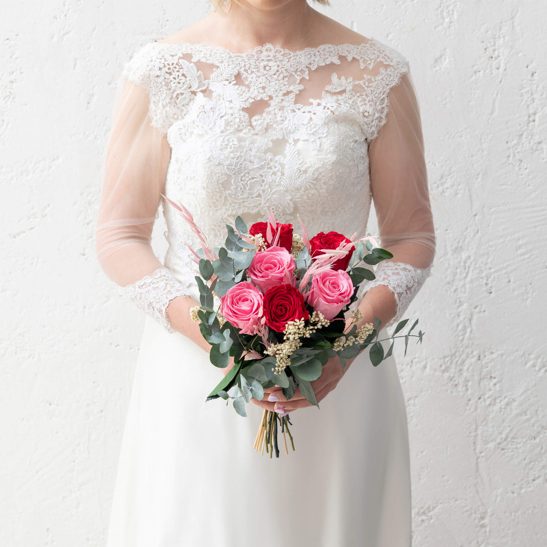 Nuestro ramo de preservado Pasión tiene todos los elementos de un ramo de flores tradicional, con los colores y flores más atrevidas. Rosas rojas y rosas se unen en un ramo ideal para esa novia clásica pero atrevida. Compra tu ramo de novia preservado en Bésame Mucho.