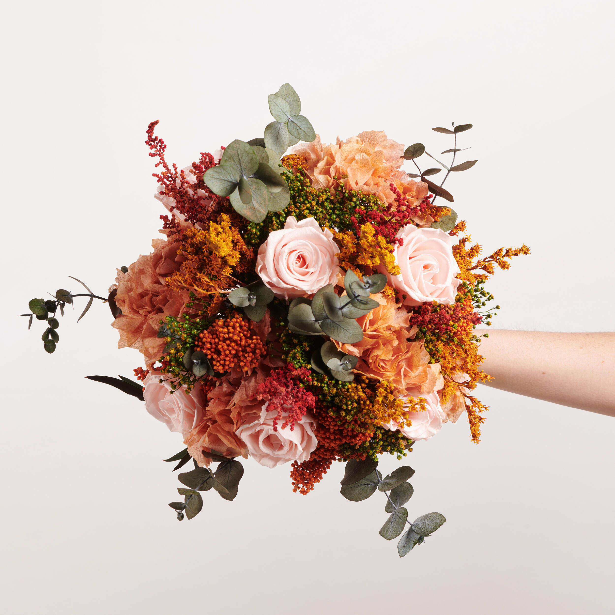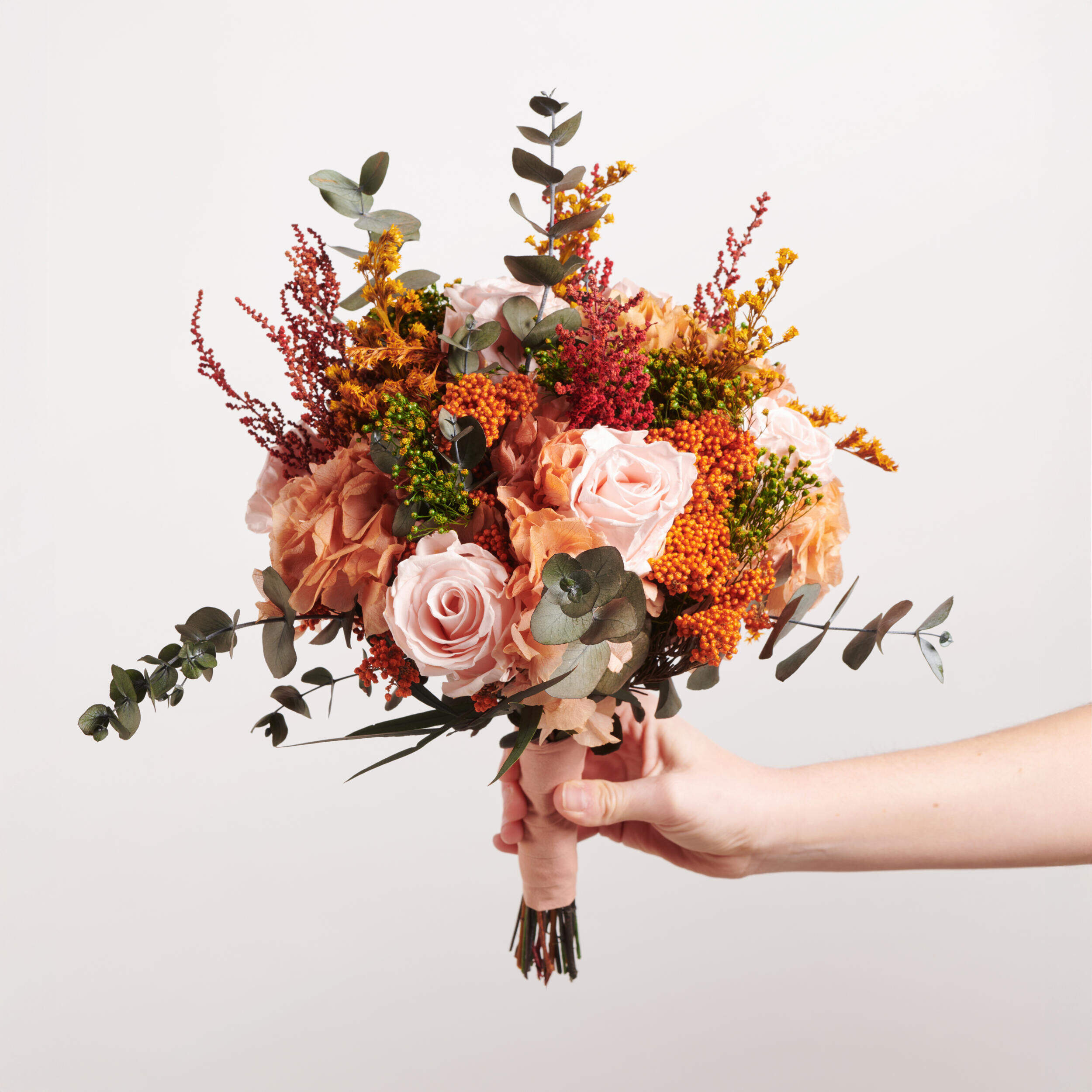 Nuestro ramo de preservado Promesa Eterna tiene todos los elementos de un ramo de flores clásico, con los colores y flores más atrevidas. Rosas color salmón, hortensias naranjas y eucalipto se unen en un ramo ideal para esa novia más atrevida. Compra tu ramo de novia preservado en Bésame Mucho.