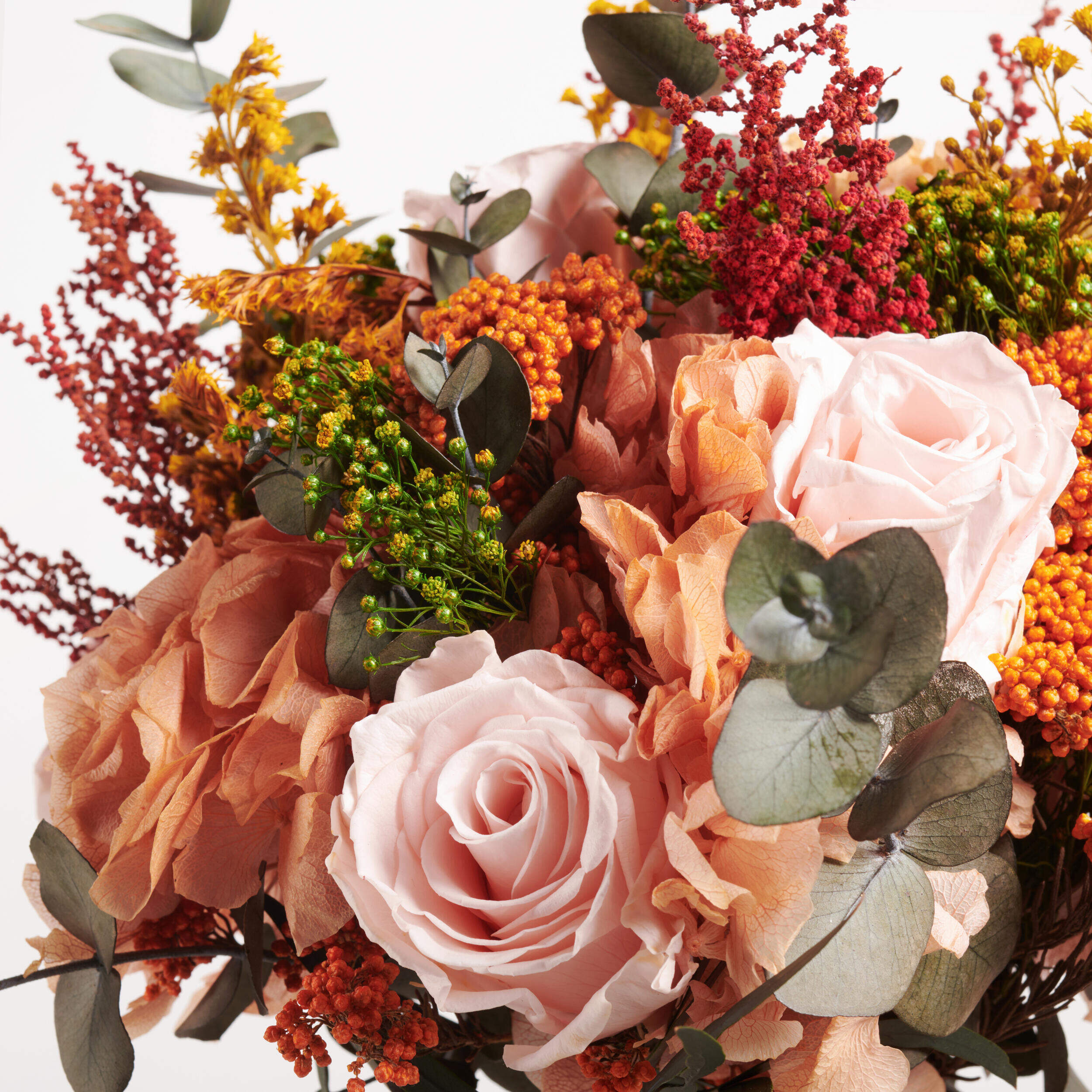Promesa Eterna esta compuesto de rosas color salmón y hortensias naranjas, acompañado de una selección de verdes y espigas preservadas en los que destaca el eucalipto cinérea.