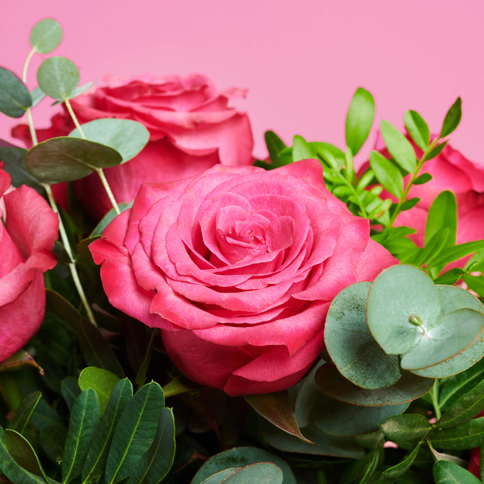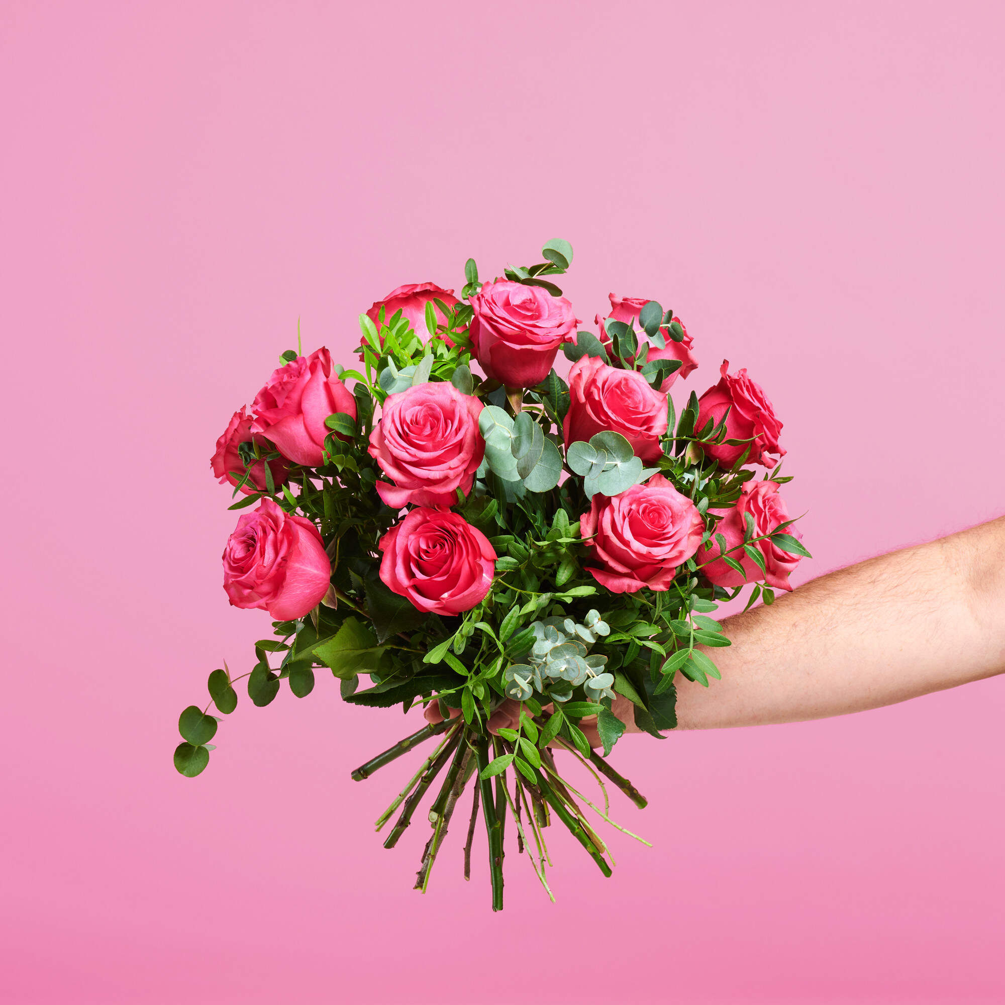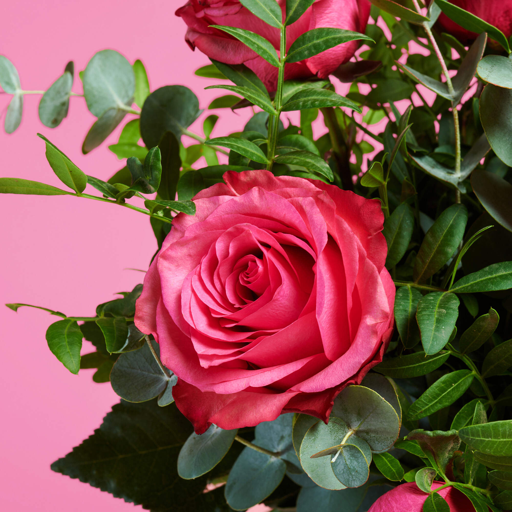 Pasional e Intenso, este ramo demostrará lo mucho que le quieres. Nuestro ramo de rosas fucsia es pasión pura, solo vosotros sabréis donde acaba esa pasión. Hemos preparado este ramo de rosas compuesto por 12 rosas fucsia y nuestros mejores eucaliptos y lentiscos de cultivos sostenibles y locales.