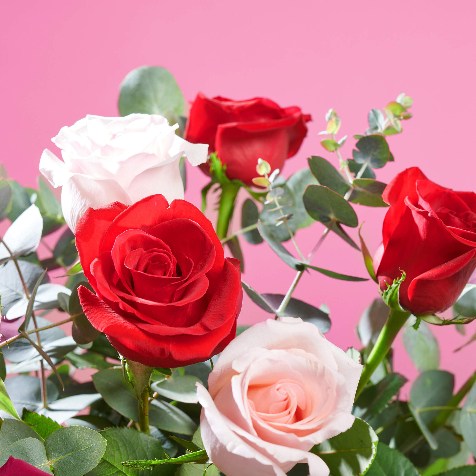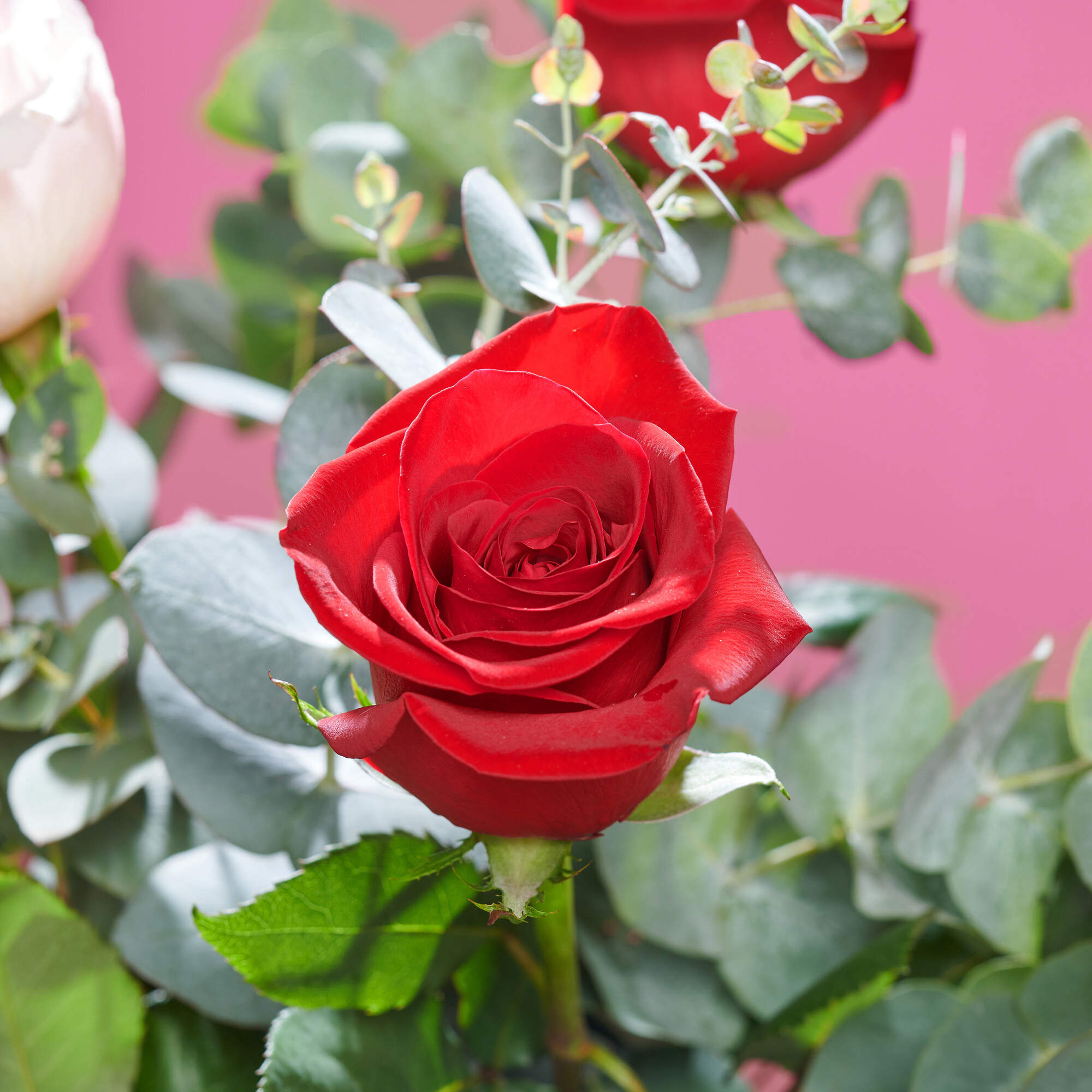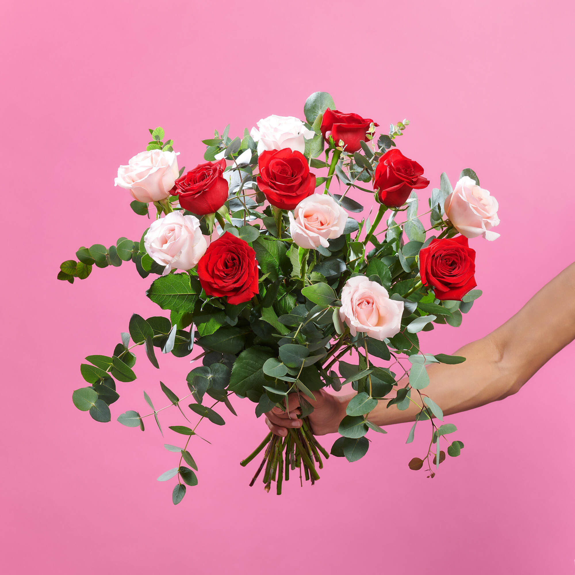 Este ramo de rosas esta compuesto por nuestra combinación de 50% rosas rojas, 50% rosas Rosa claro y nuestros mejores verdes frescos como eucalipto y lentisco.