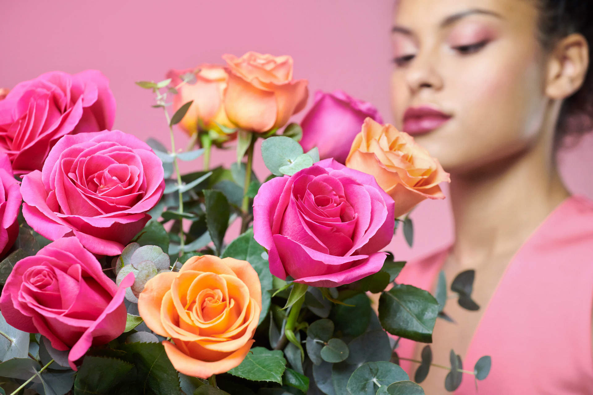 Ramo de rosas fucsia y naranja Beso Inesperado