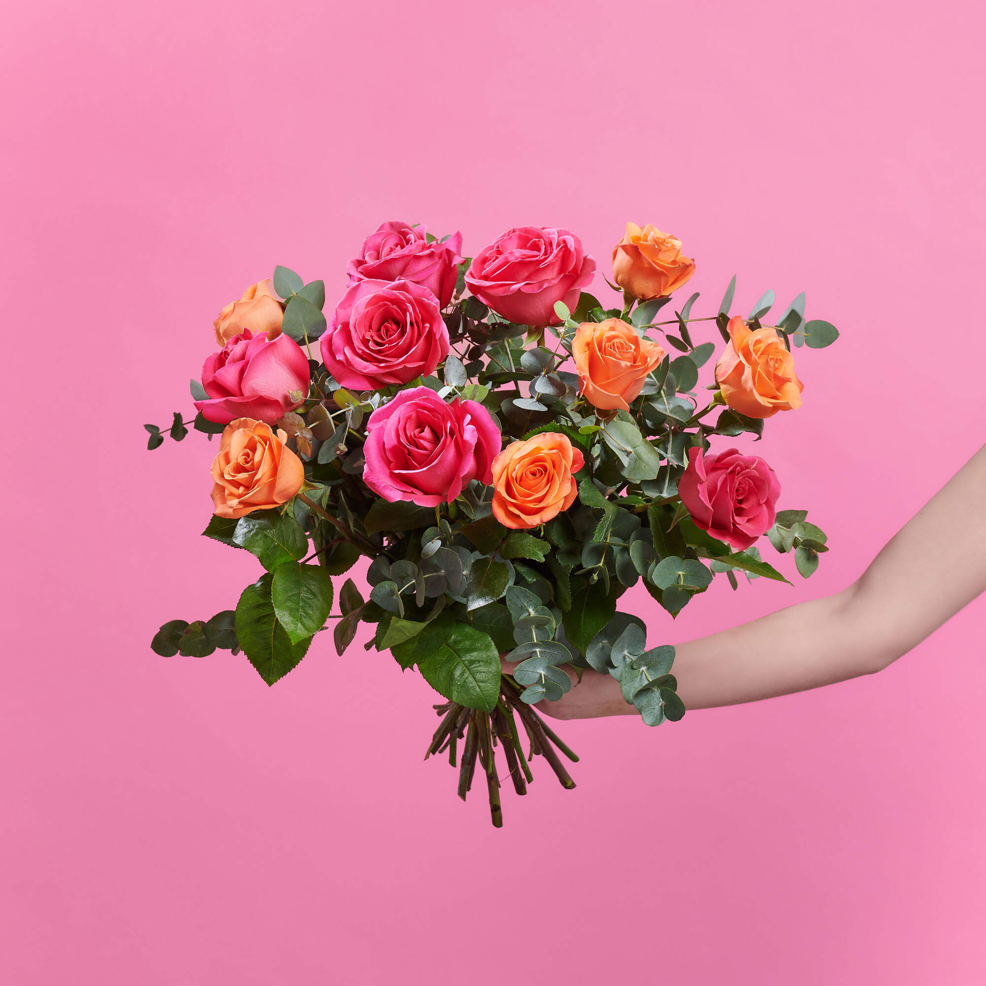 Este ramo de rosas esta compuesto por nuestra combinación de 6 rosas fucsias, 6 rosas naranjas y nuestros mejores verdes frescos como eucalipto y lentisco.