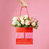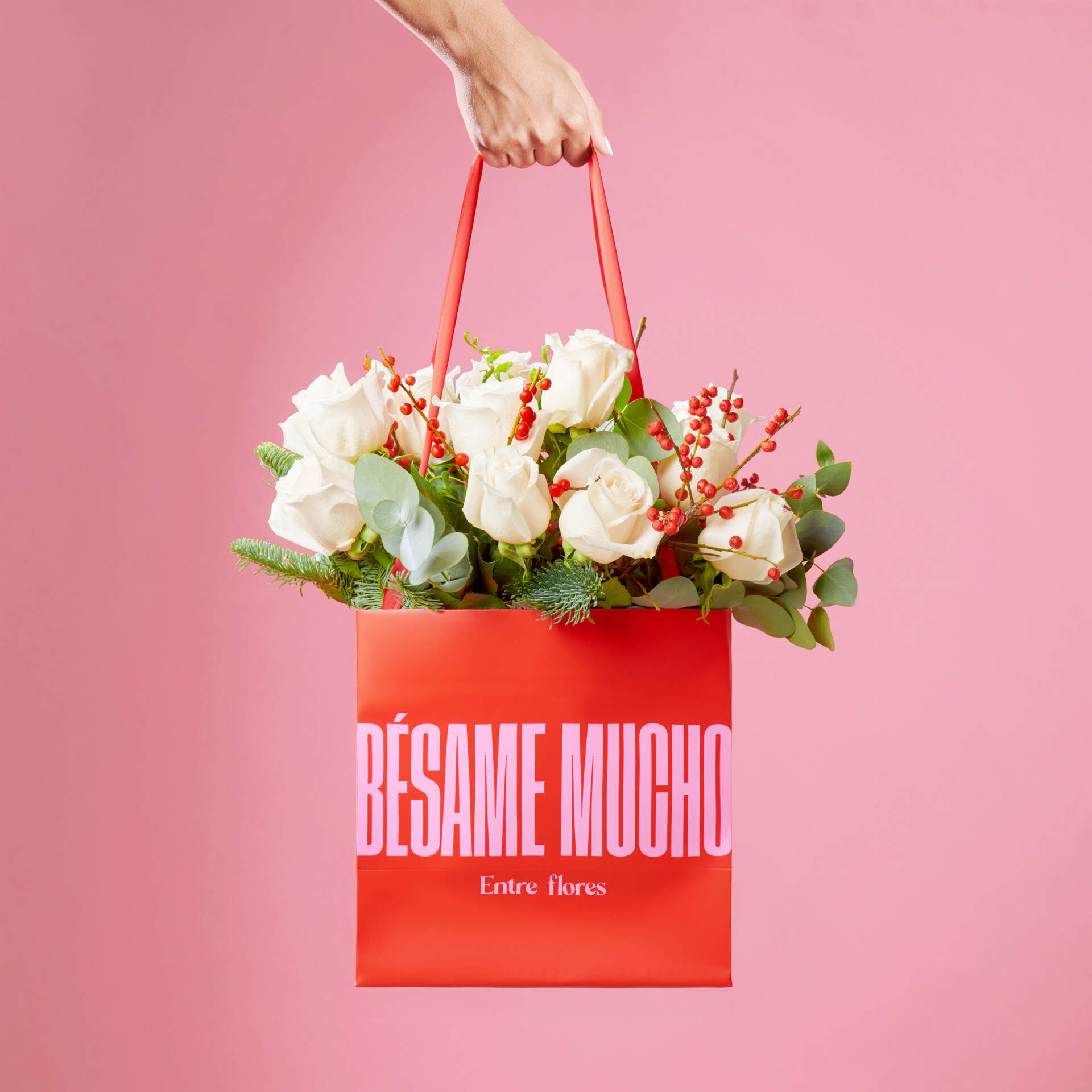 Este bolsa preparada con un ramo de 12 rosas blancas y unos toques de Ilex en color rojo combina a la perfección con nuestros tallos de Nobilis mas perfectos, que simulan un pequeño árbol de navidad que acompaña a las rosas.