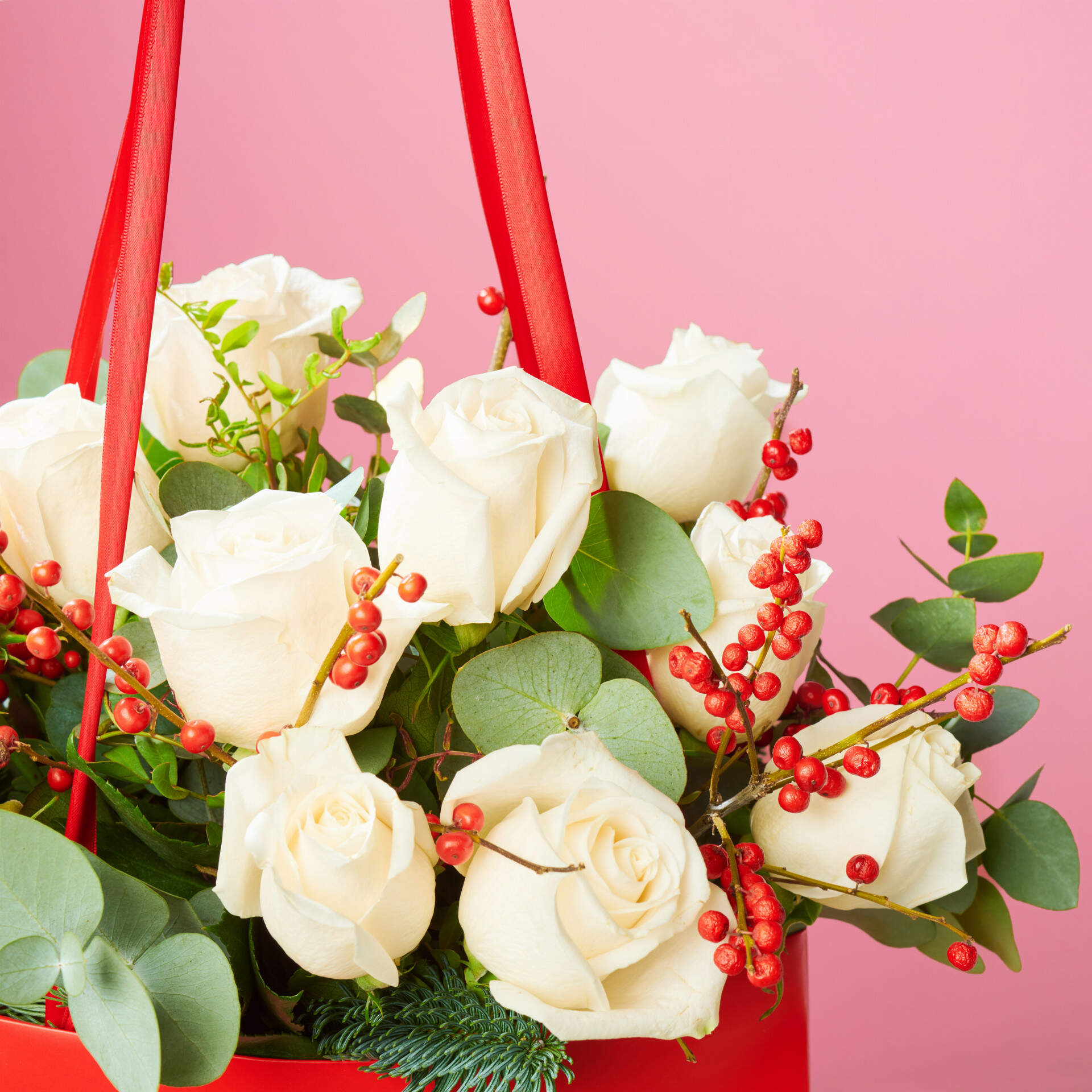 Siente la navidad, durante todo el año. Las rosas blancas combinan con el Ilex rojo en esta combinación de exito.