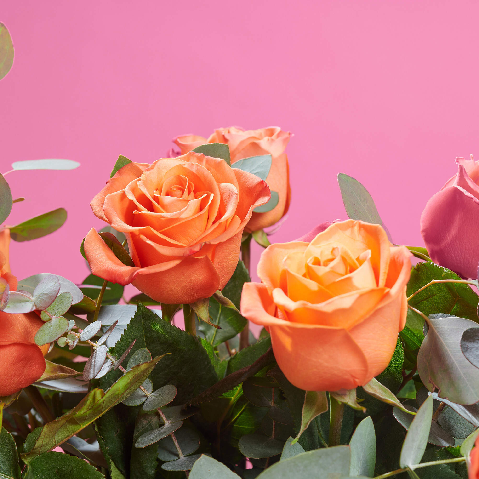 Nuestro ramo de flores Beso Radiante esta compuesto de nuestras mejores rosas de color naranja combinados con nuestros mejores eucaliptos y lentiscos de cultivos locales y sostenibles dan lugar a un ramo de flores fresco y original.