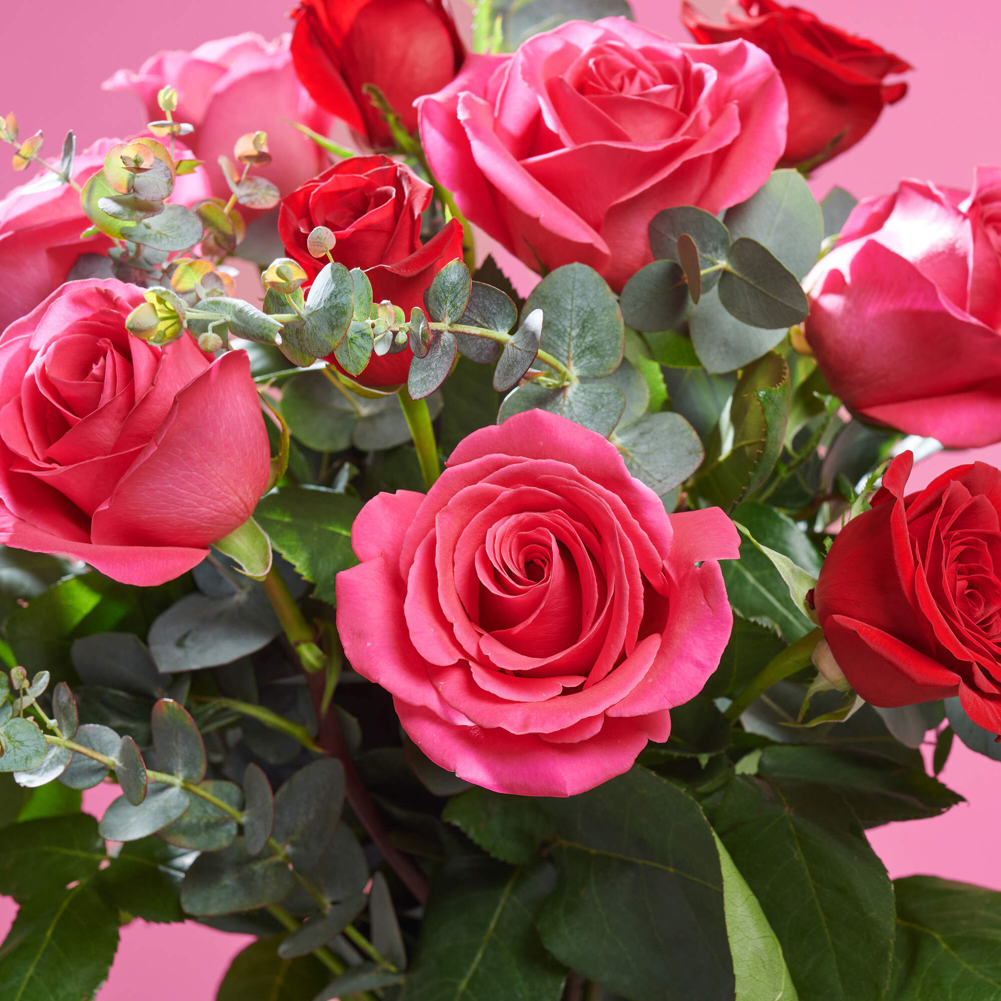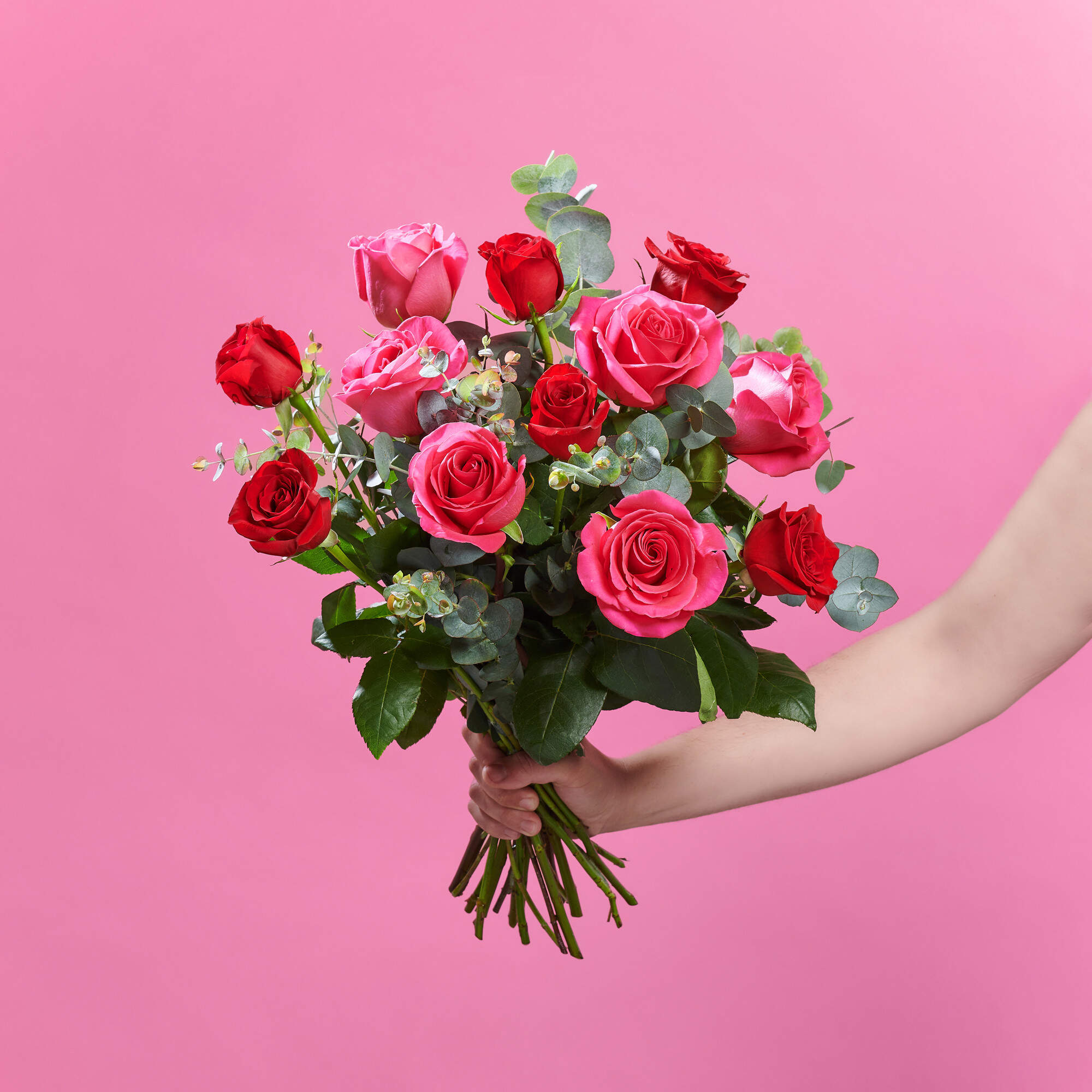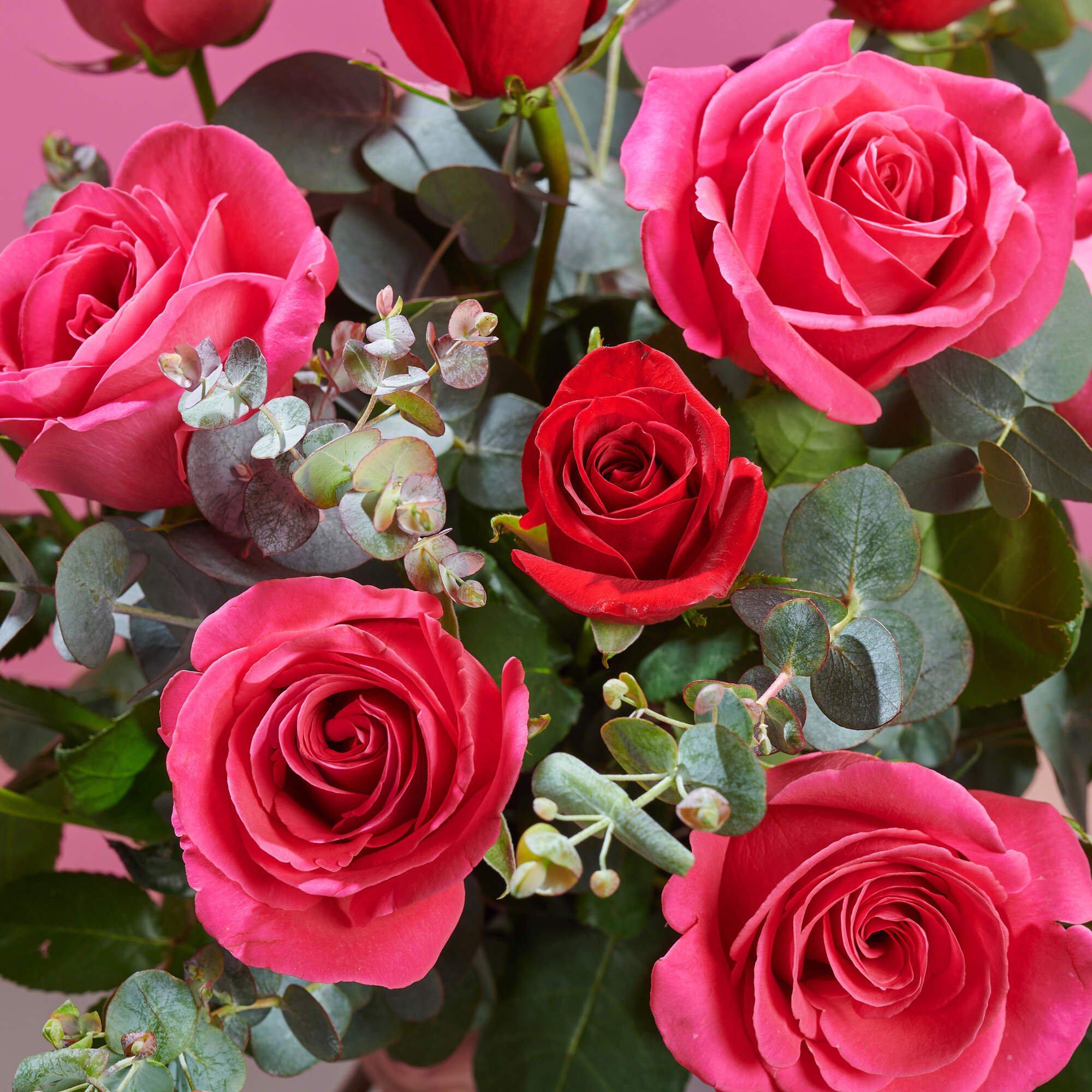 Este ramo de rosas esta compuesto por nuestra combinación de 50% rosas fucsias, 50% rosas rojas y nuestros mejores verdes frescos como eucalipto y lentisco.