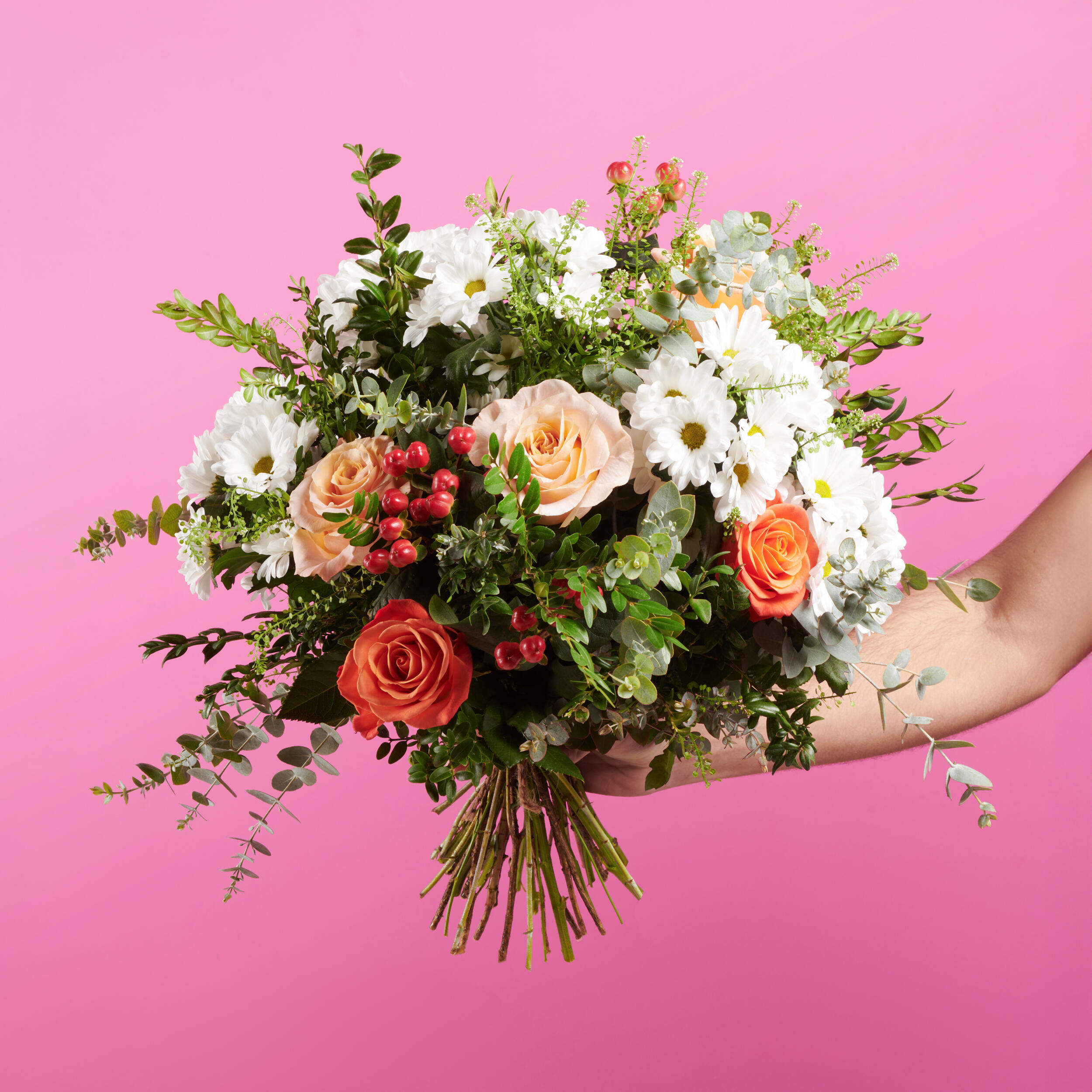 La transición perfecta al buen tiempo. Los colores anaranjados combinados con el blanco de las margaritas dan como resultado este ramo lleno de color y significado. En Dulce Néctar encontrarás rosas naranjas, margaritas blancas y flores silvestres.