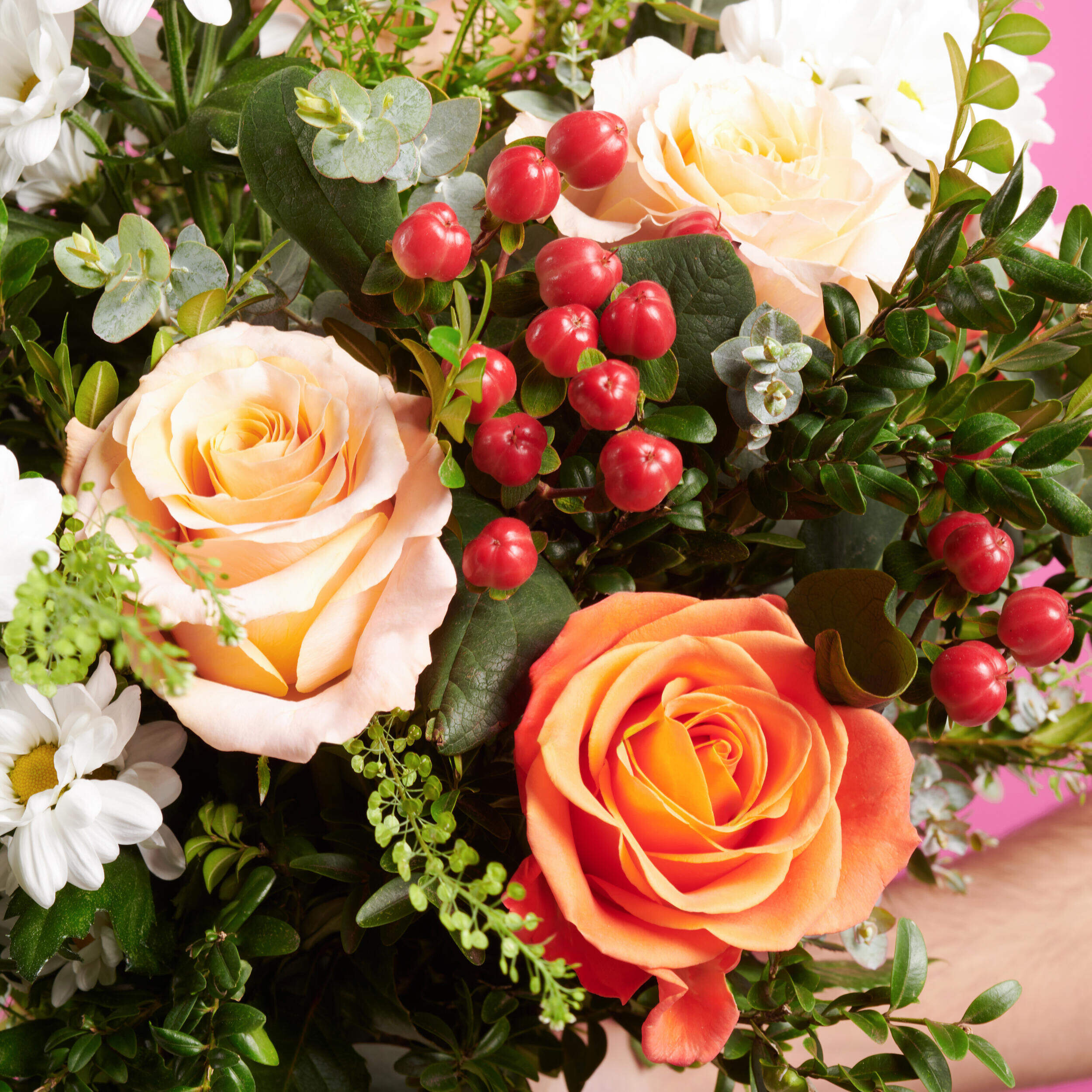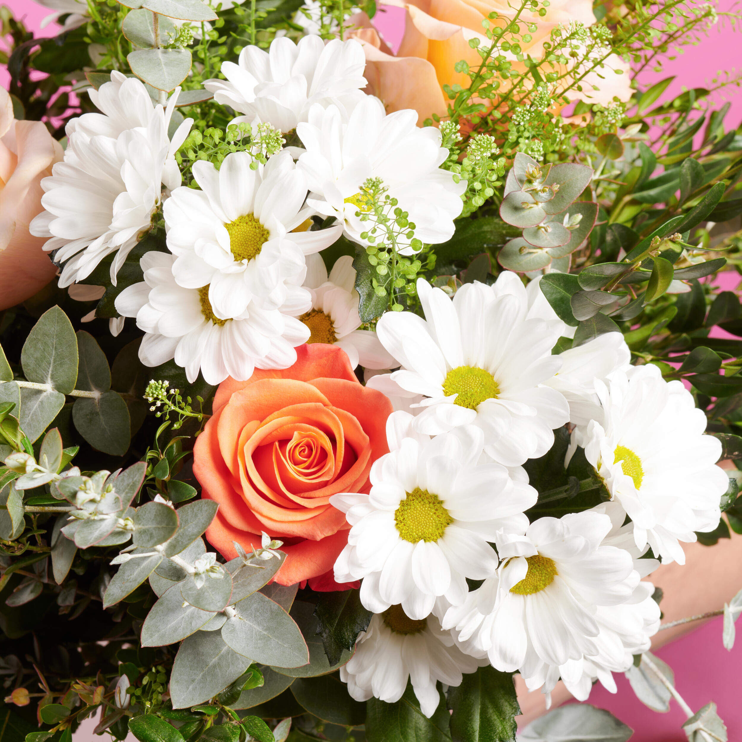 Rosas y margaritas, este ramo será ese toque de color que alegrará cualquier día, un soplo de aire fresco para los días más cálidos.