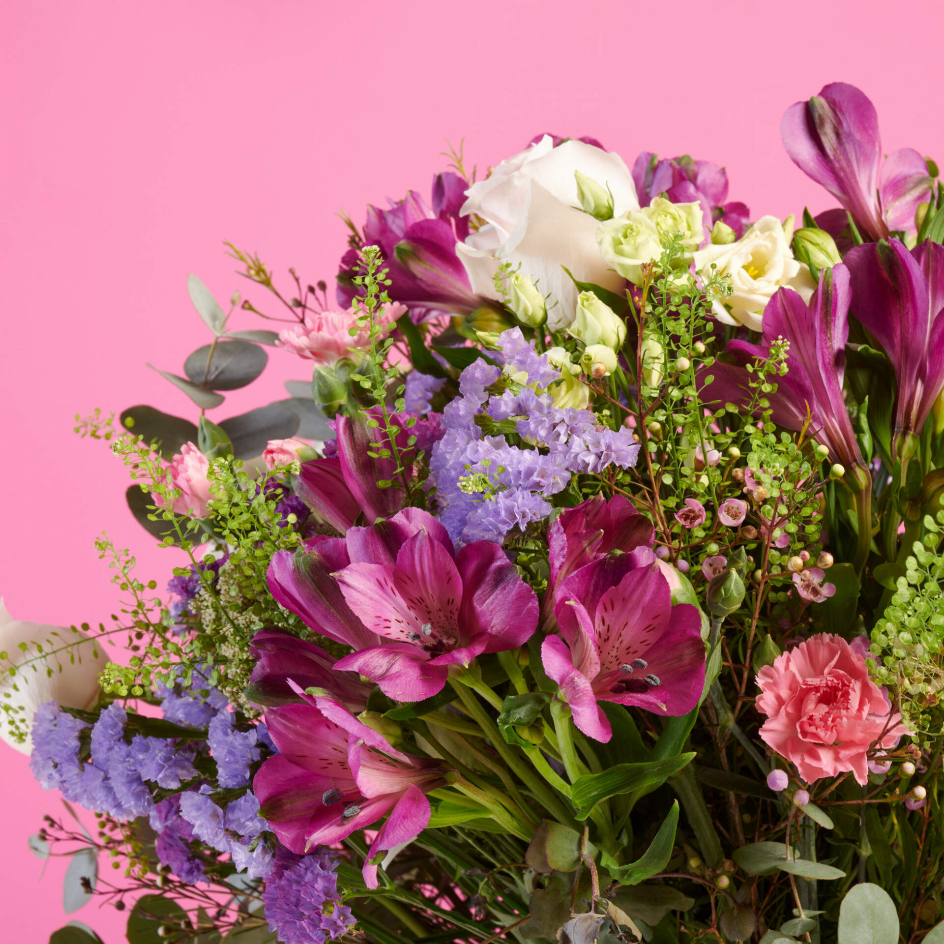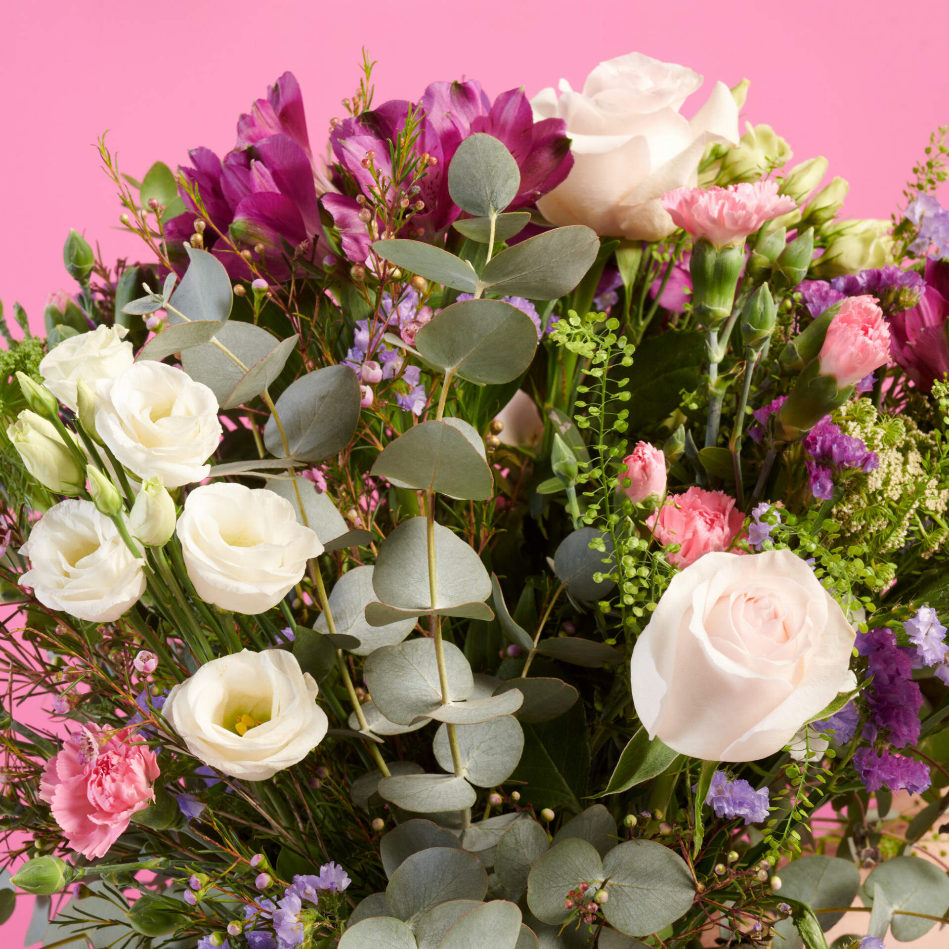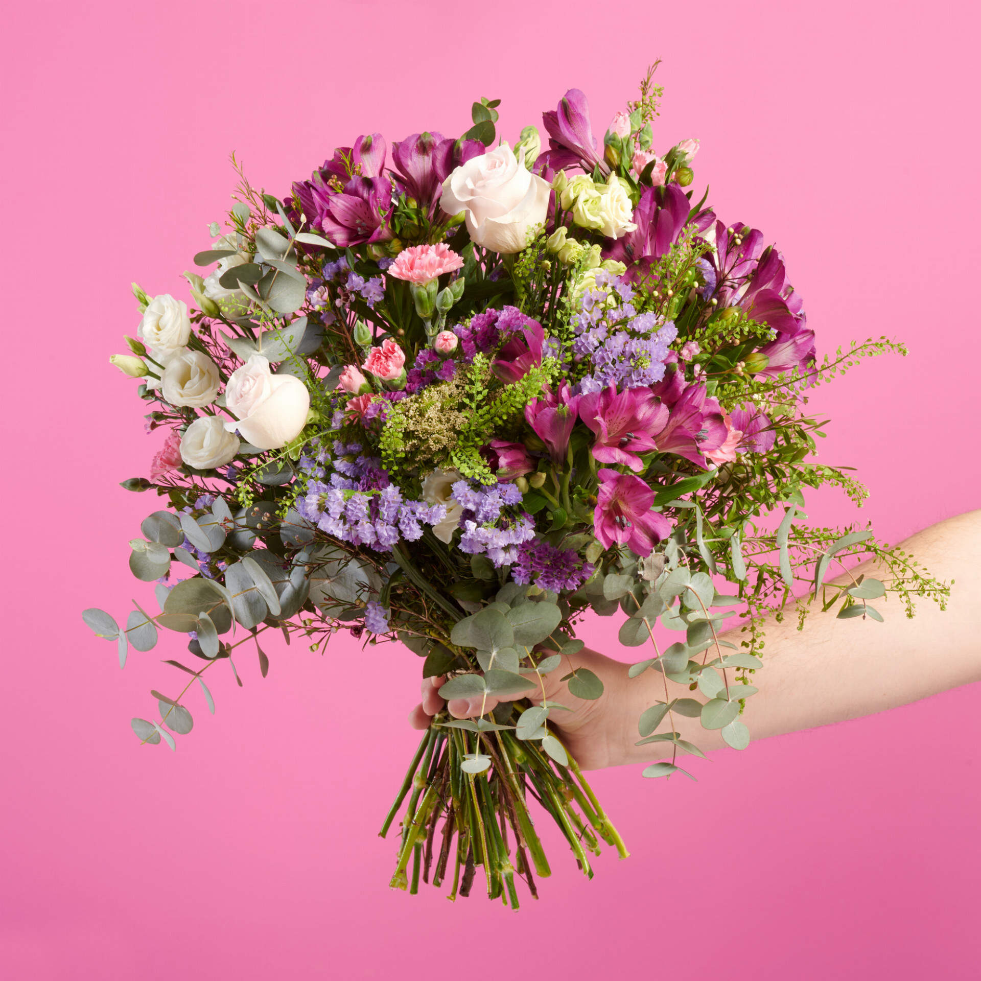 En Bésame Mucho, hemos creado este ramo de flores con los mejores mini claveles y rosas, para que tu solo tengas que preocuparte de que poner en la dedicatoria. Elaborado con rosas blancas, mini claveles y nuestra mejor selección de eucaliptos y lentiscos de cultivos sostenibles y locales.